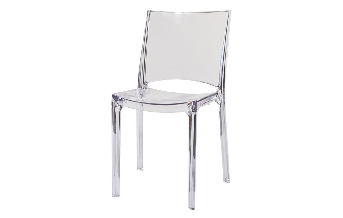 Cadeira com estrutura em policarbonato transparente.