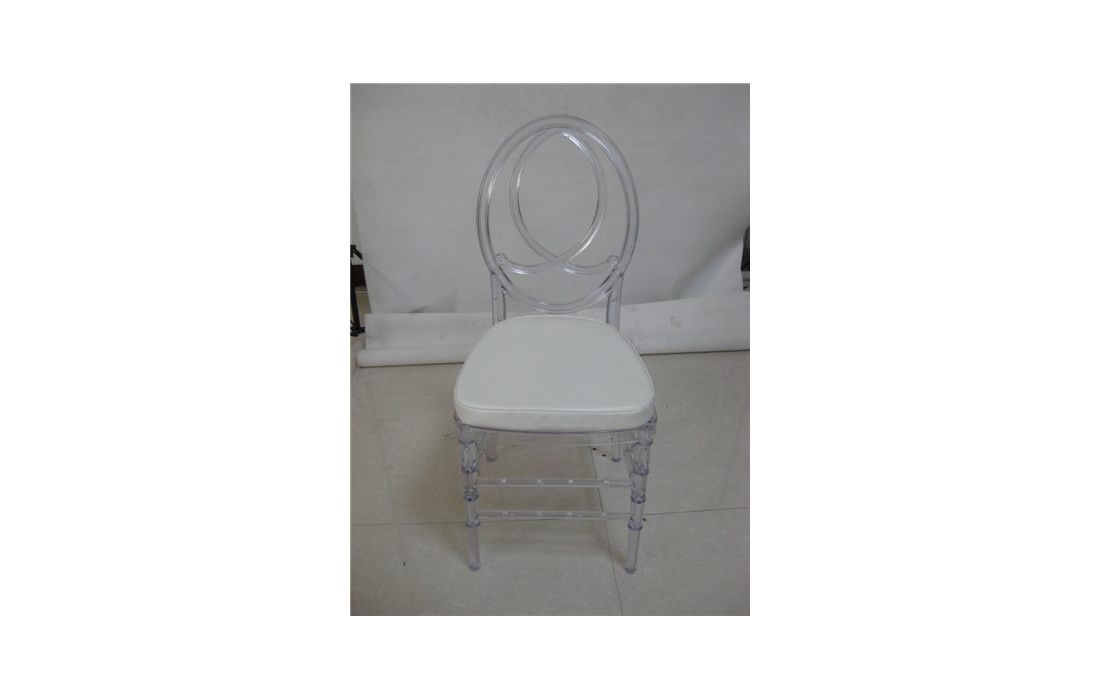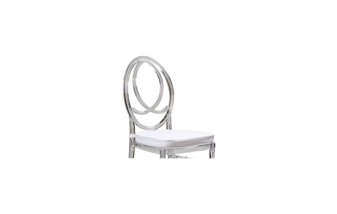 Cadeira com estrutura em policarbonato transparente, com assento em pele sintética branca.