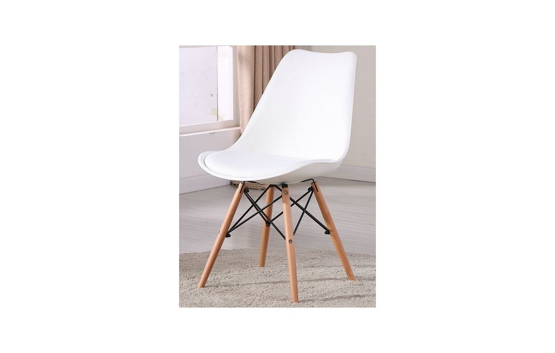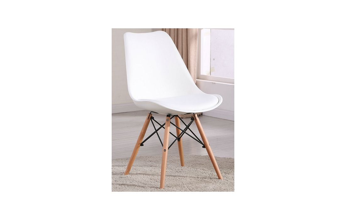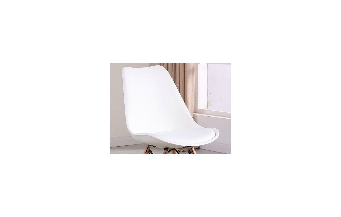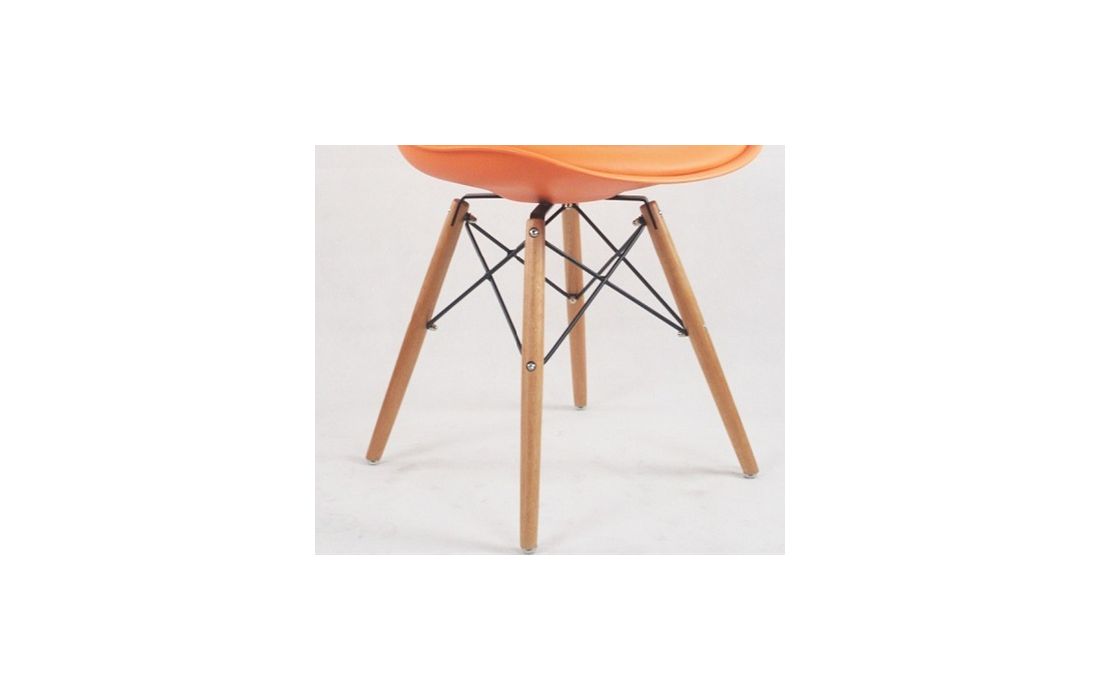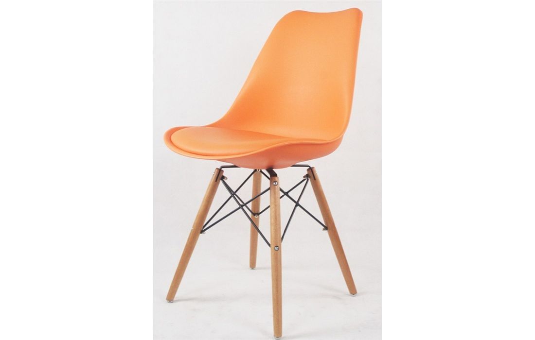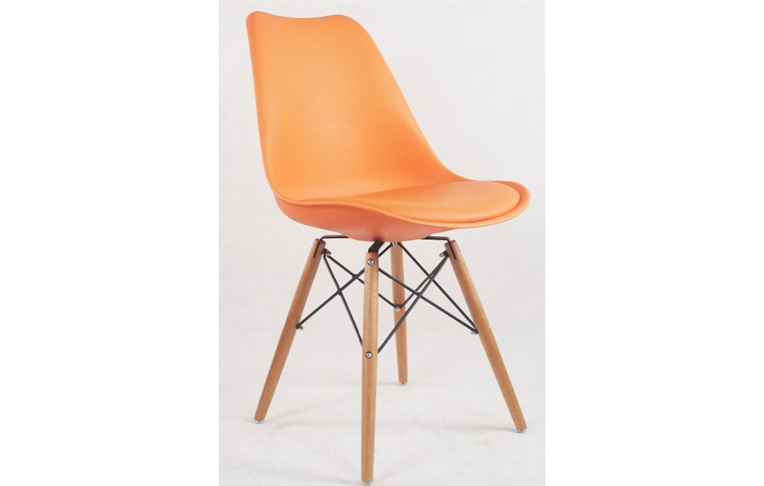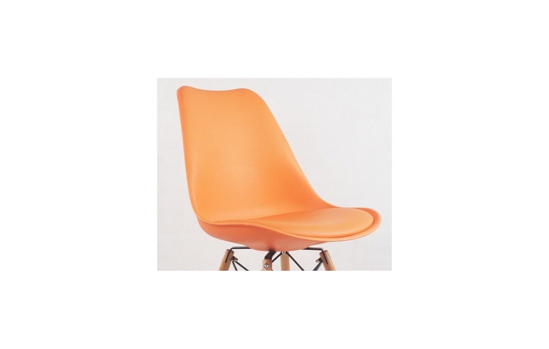 Cadeira com estrutura em polipropileno, assento em pele sintética de cor laranja, branco, preto, ou vermelho, pés em madeira maciça de faia com pormenor de metal.