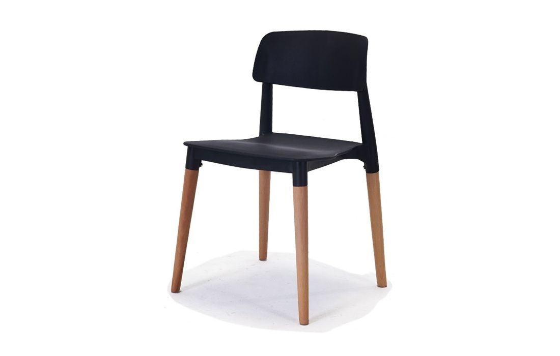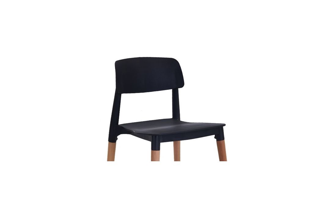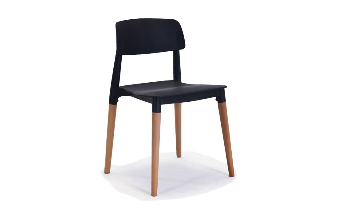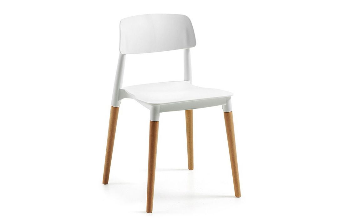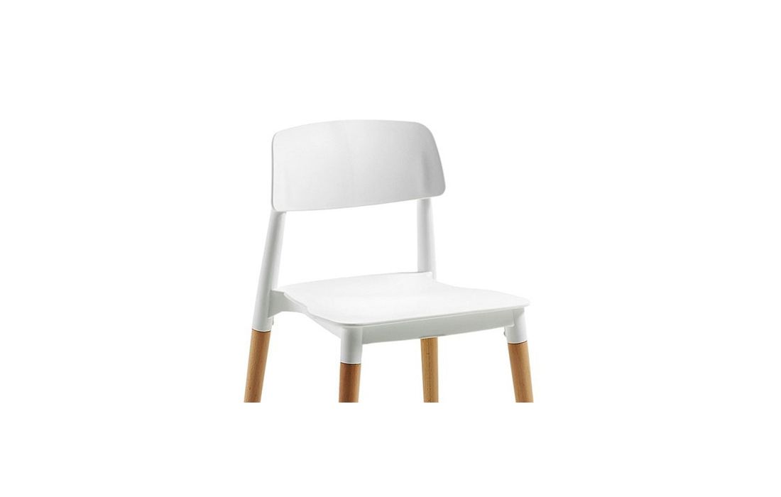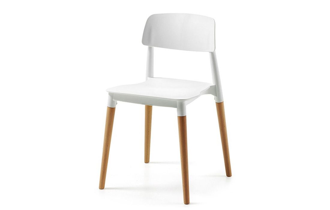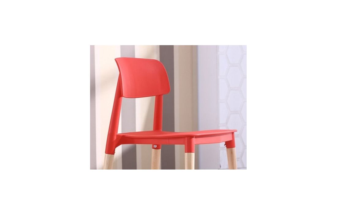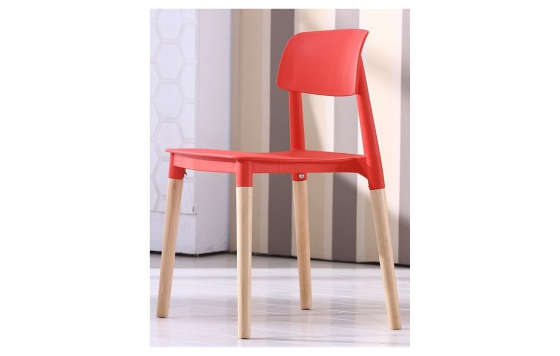 Cadeira com estrutura em polipropileno de cor branco, preto ou vermelho e pés em madeira maciça de faia.