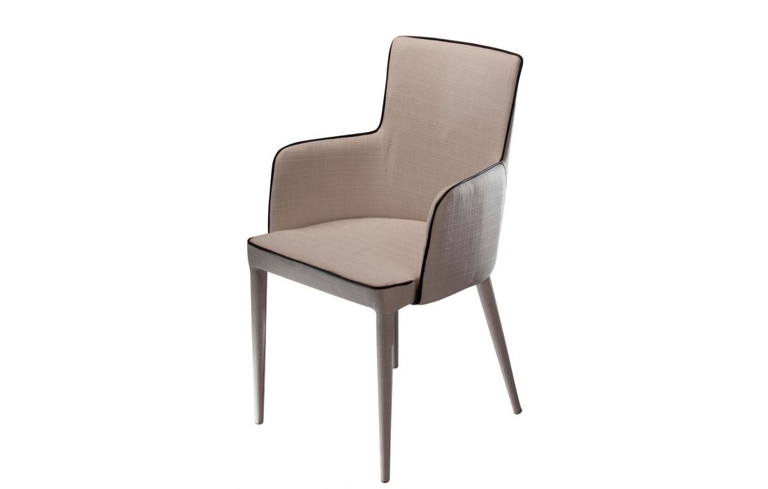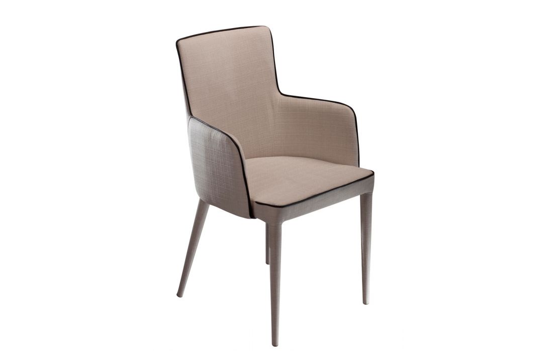 Cadeirão todo revestido em tecido bege, castanho e preto