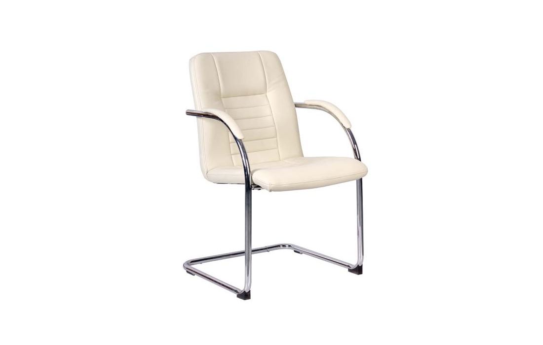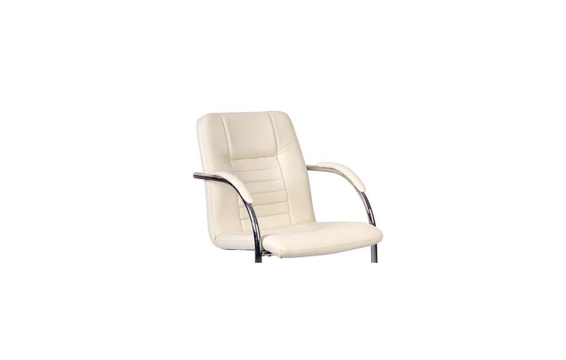 Cadeirão com estrutura em metal cromado com assento e costa em pele sintética branca.