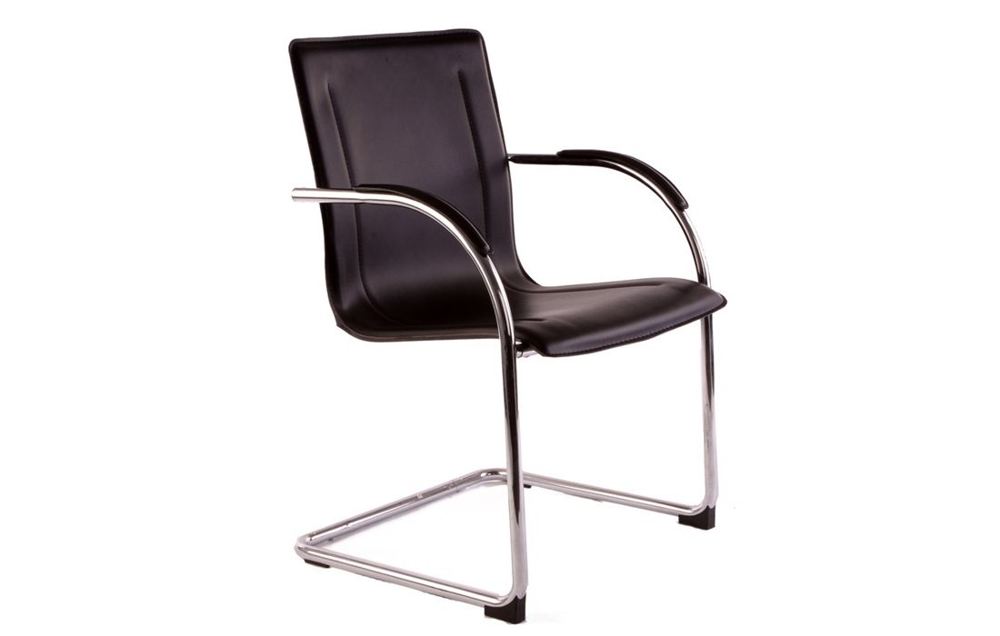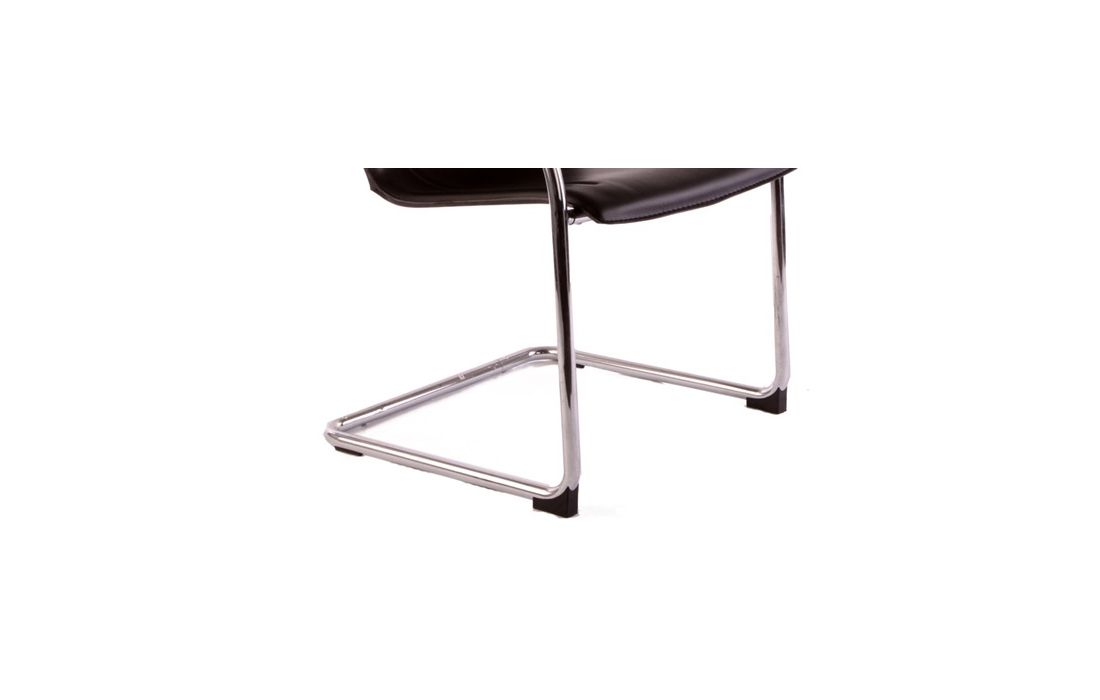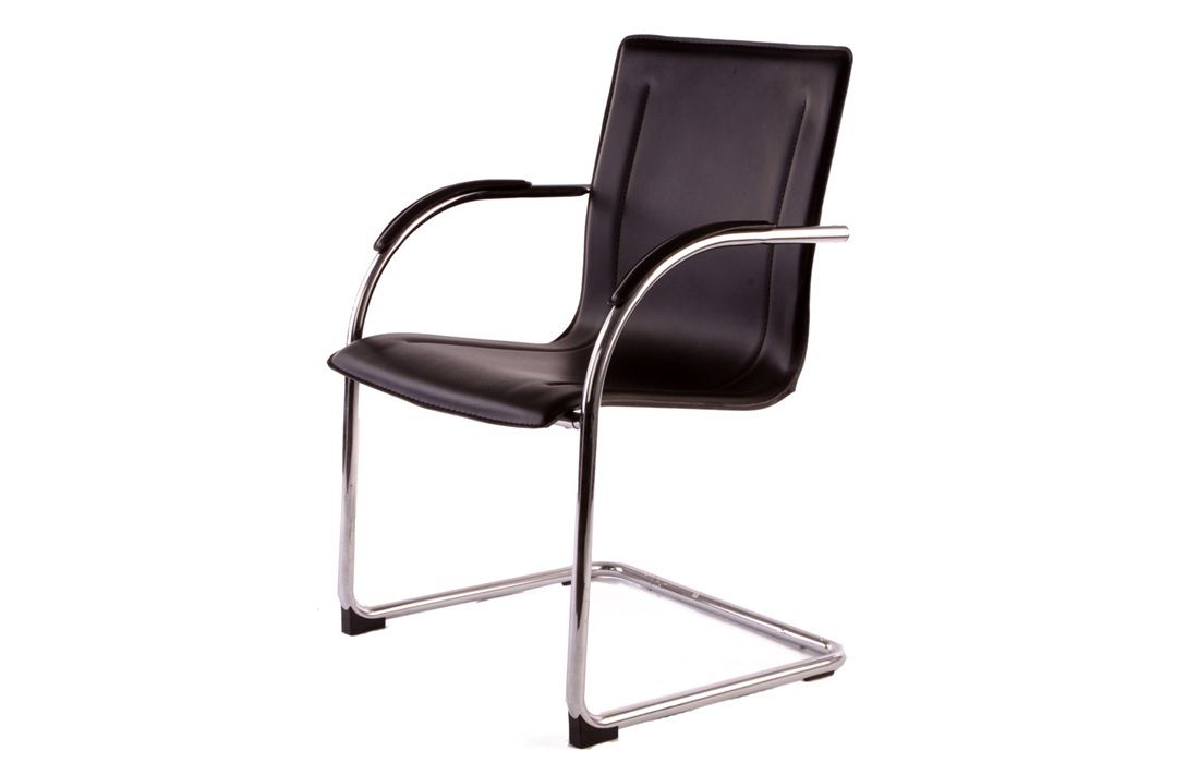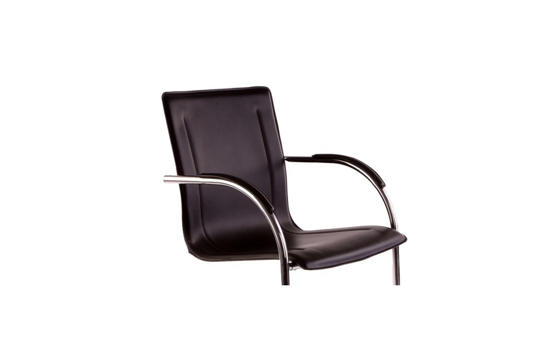 Cadeirão com estrutura em metal cromado, assento e costa em napel de cor preto.