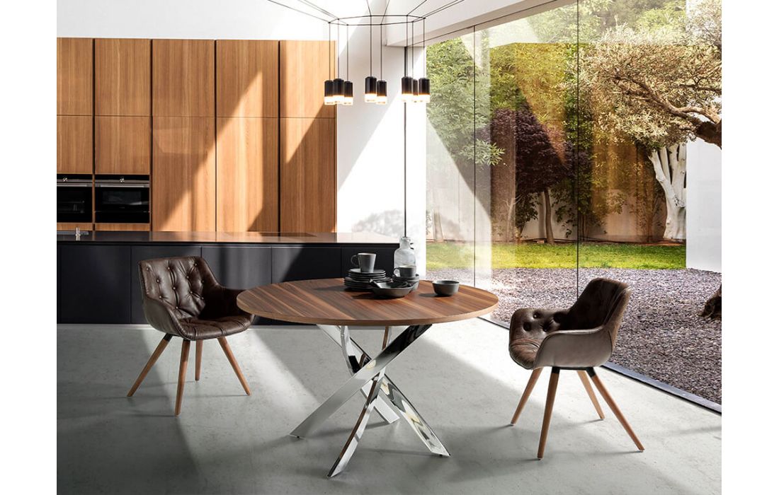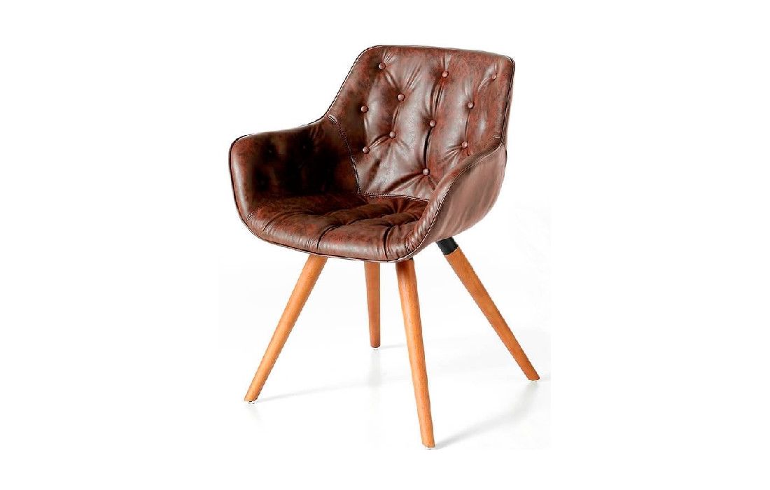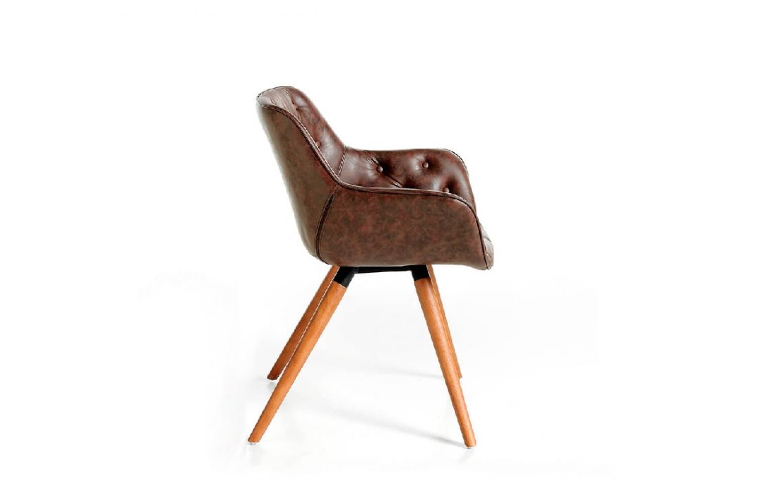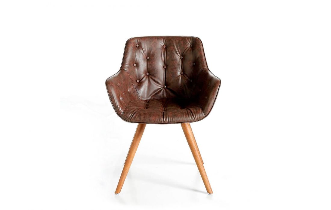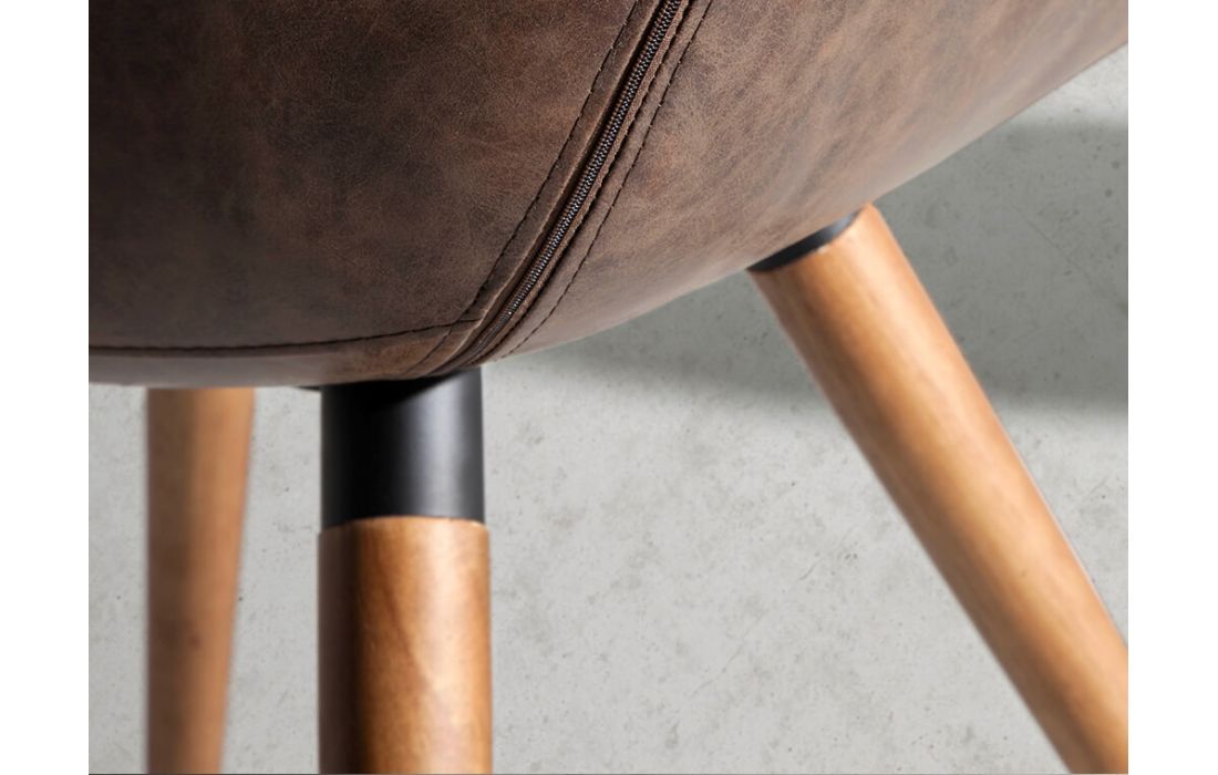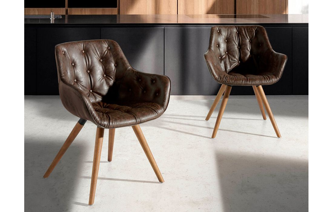 Cadeira de design moderno com assento e encosto estofados em pele sintética e as suas pernas de madeira na cor nogueira, com o seu estilo vanguardista e intemporalDestinatário :