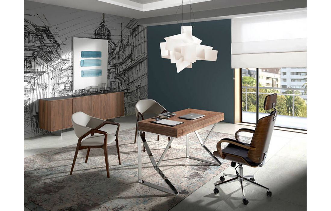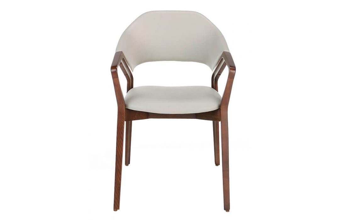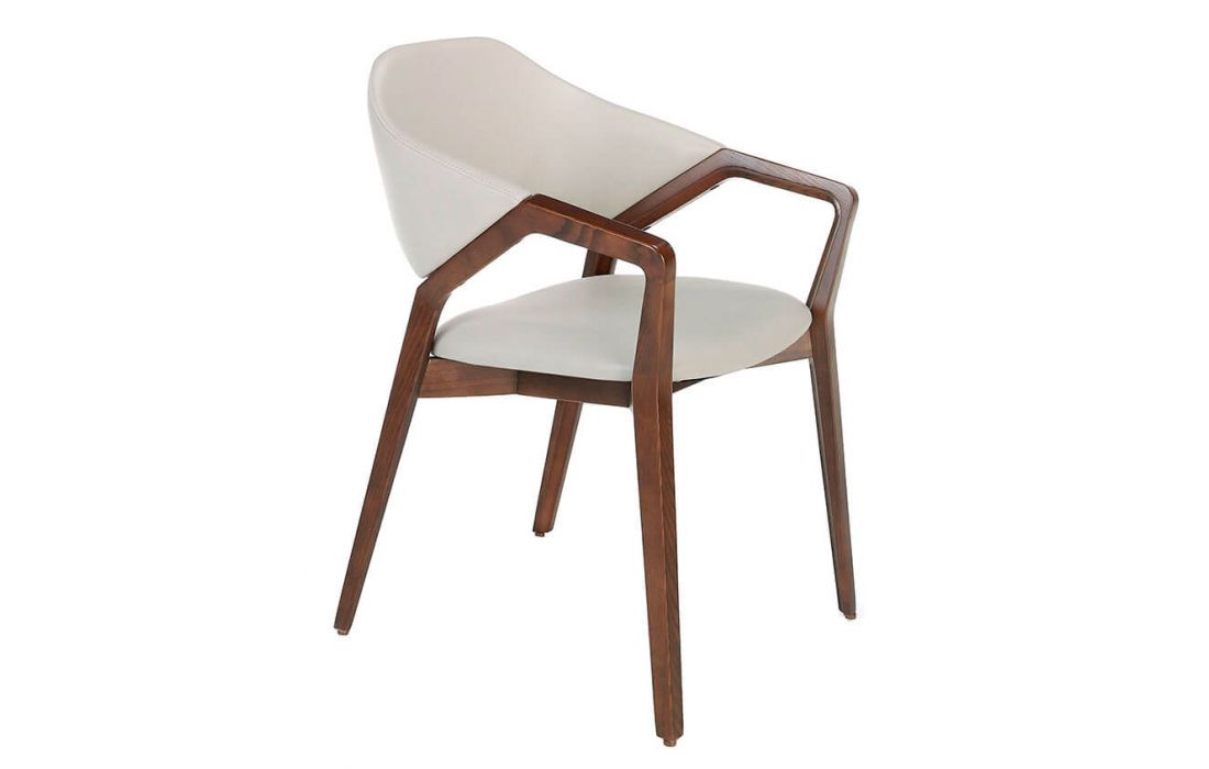 Cadeirão estofado com pés de madeira de freixo cor de nogueira nos vários acabamentos e revestimentos possíveis.