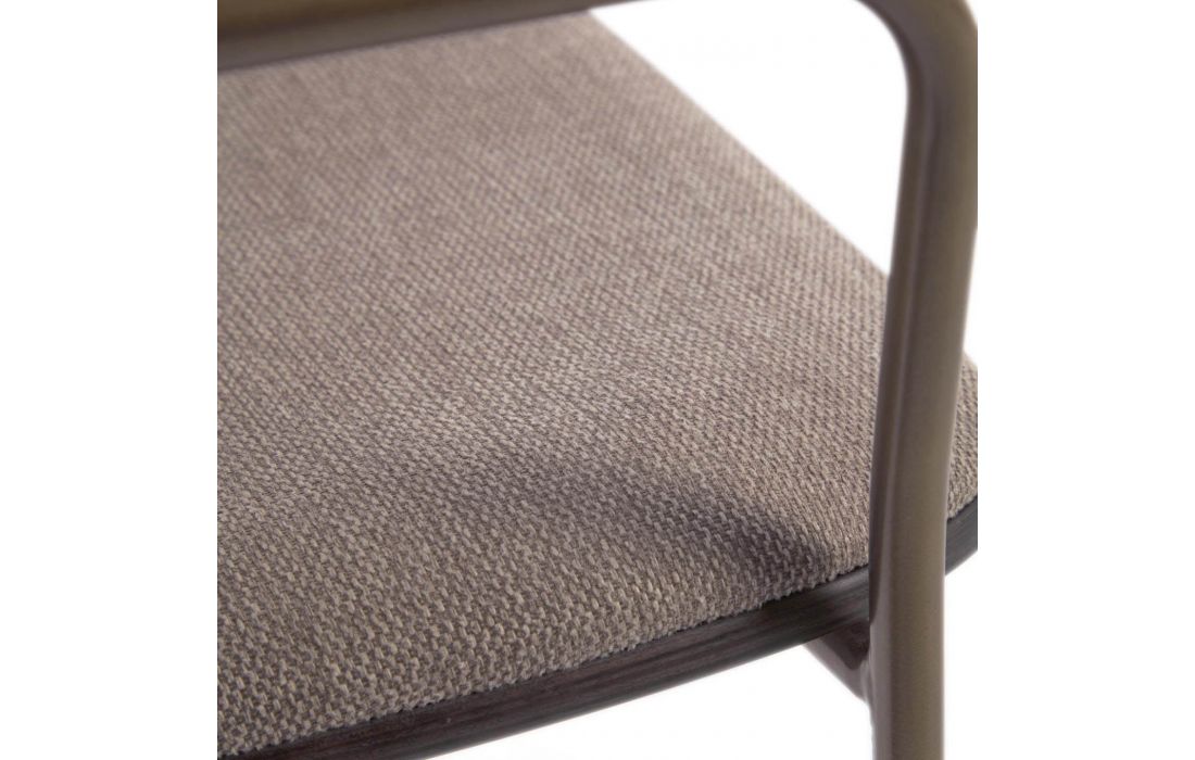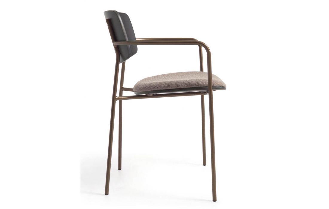 Cadeira com braços, estrutura de metal, costa em folha de freixo com acabamento escuro e assento estofado em tecido Prazo de Entrega 15 a 20 dias Dimensões em cm L 52,5 P 54,5 A 76