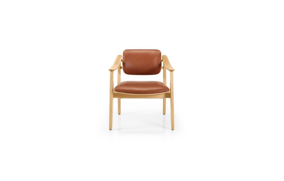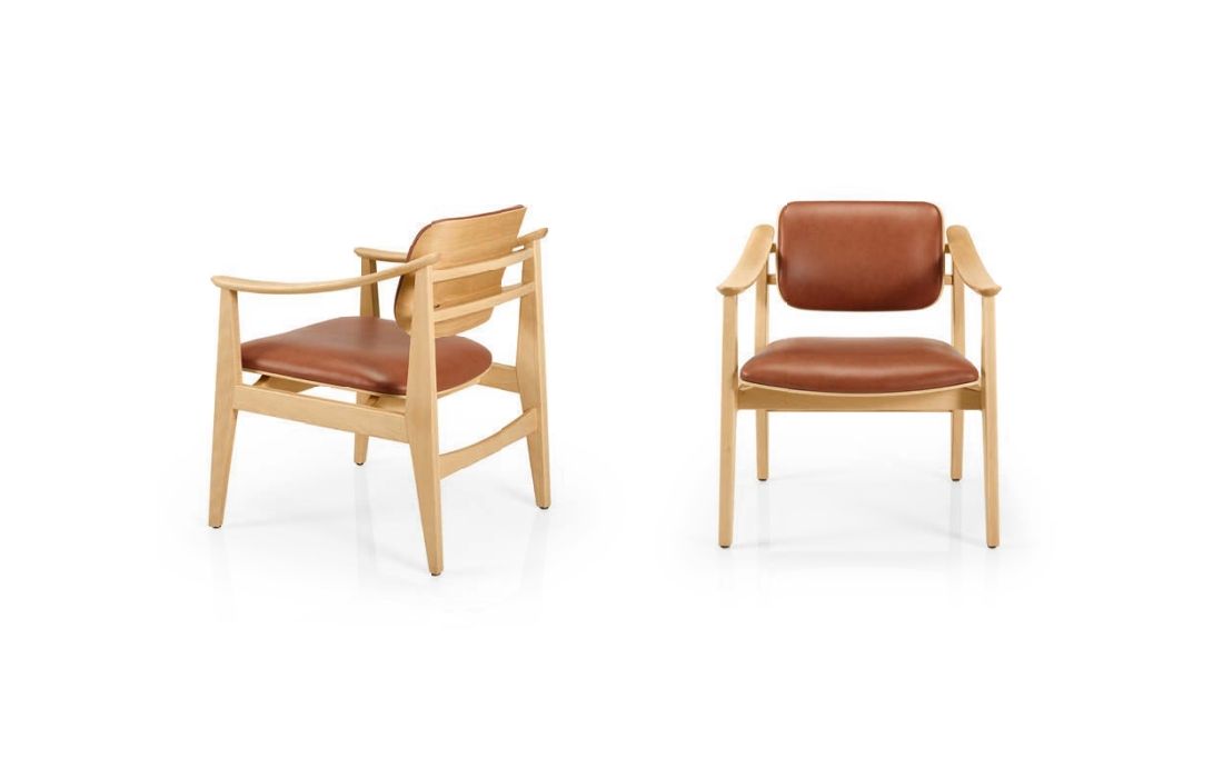 Cadeirão estofado nos vários revestimentos possíveis com pés em madeira.