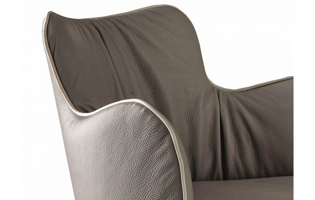 Cadeirão com base gitatória em metal revestido com epóxi e encosto de madeira forrado a tecido, pele ou ecopele