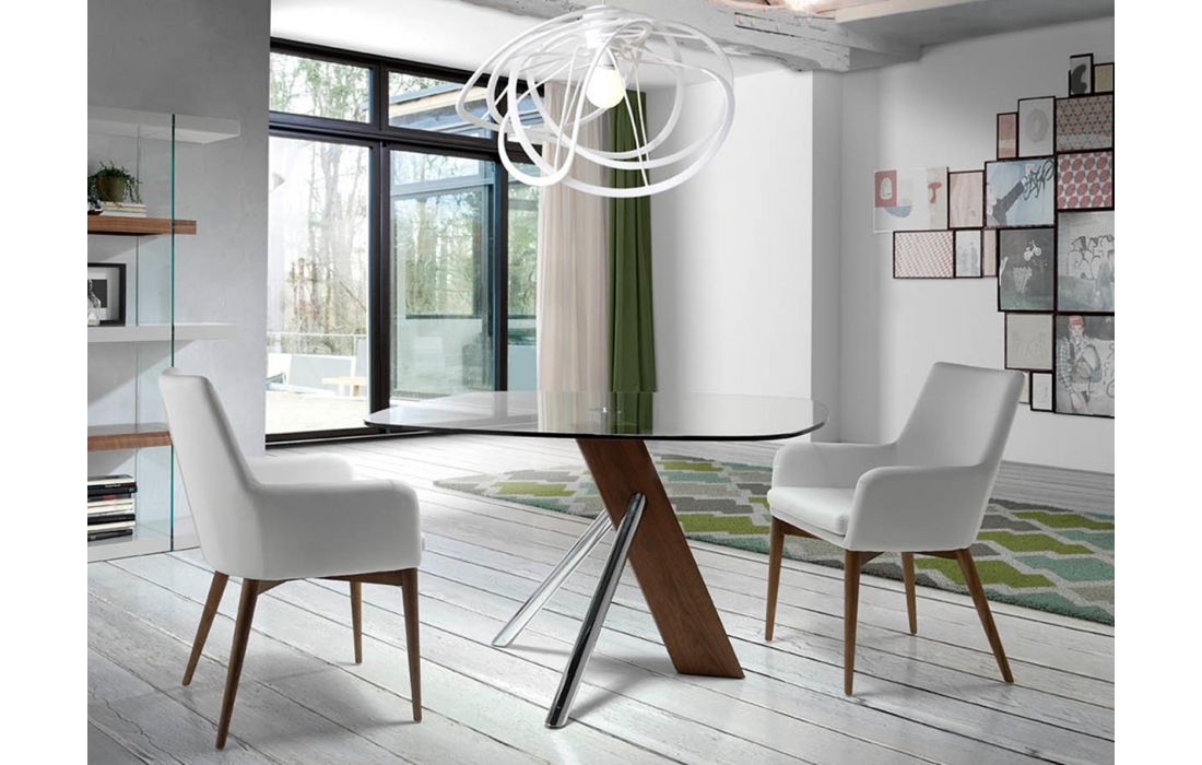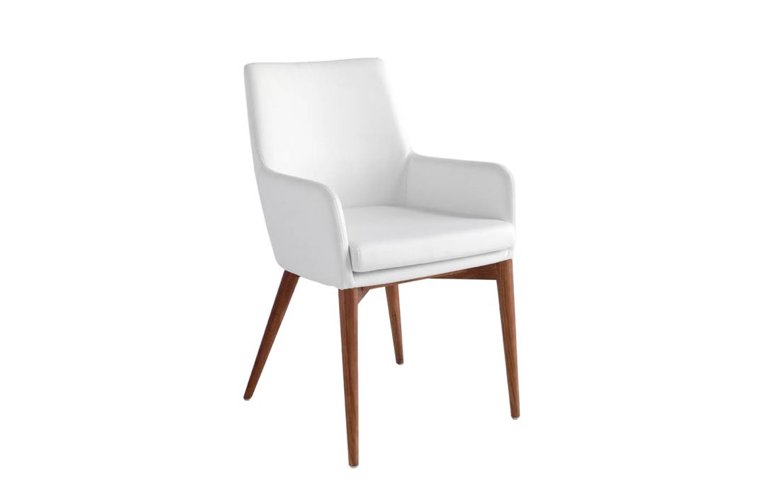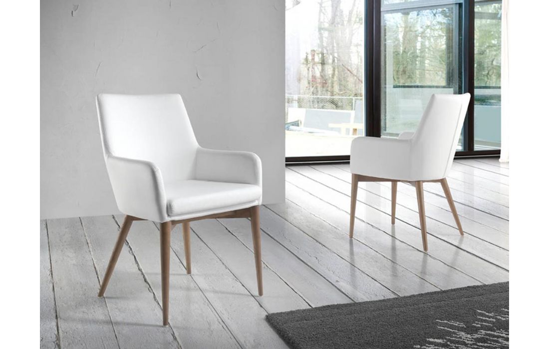 Cadeira de design moderno com braços e assento e encosto estofados em pele sintética e as suas pernas de madeira na cor nogueira, com o seu estilo vanguardista e intemporalDestinatário :
