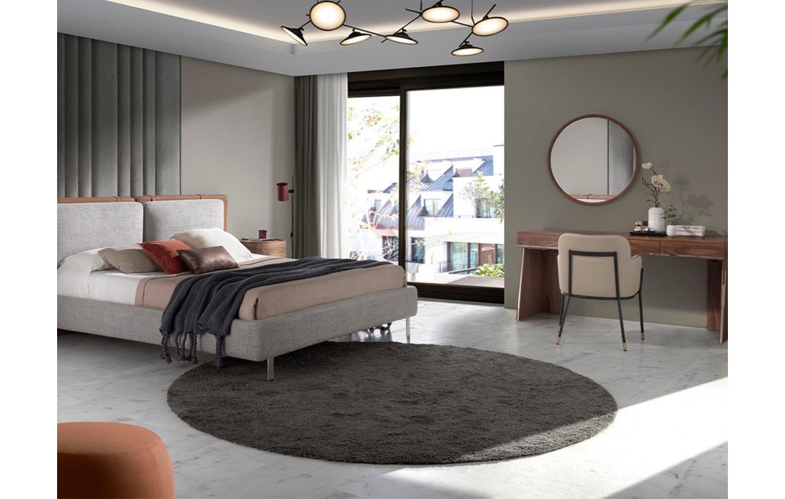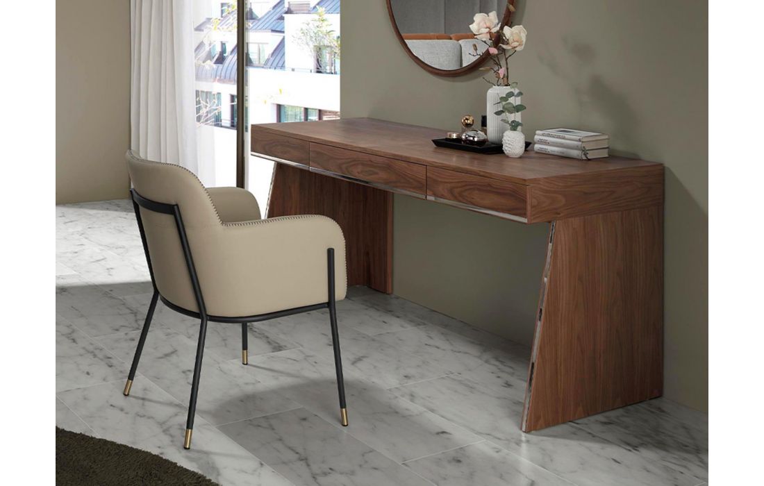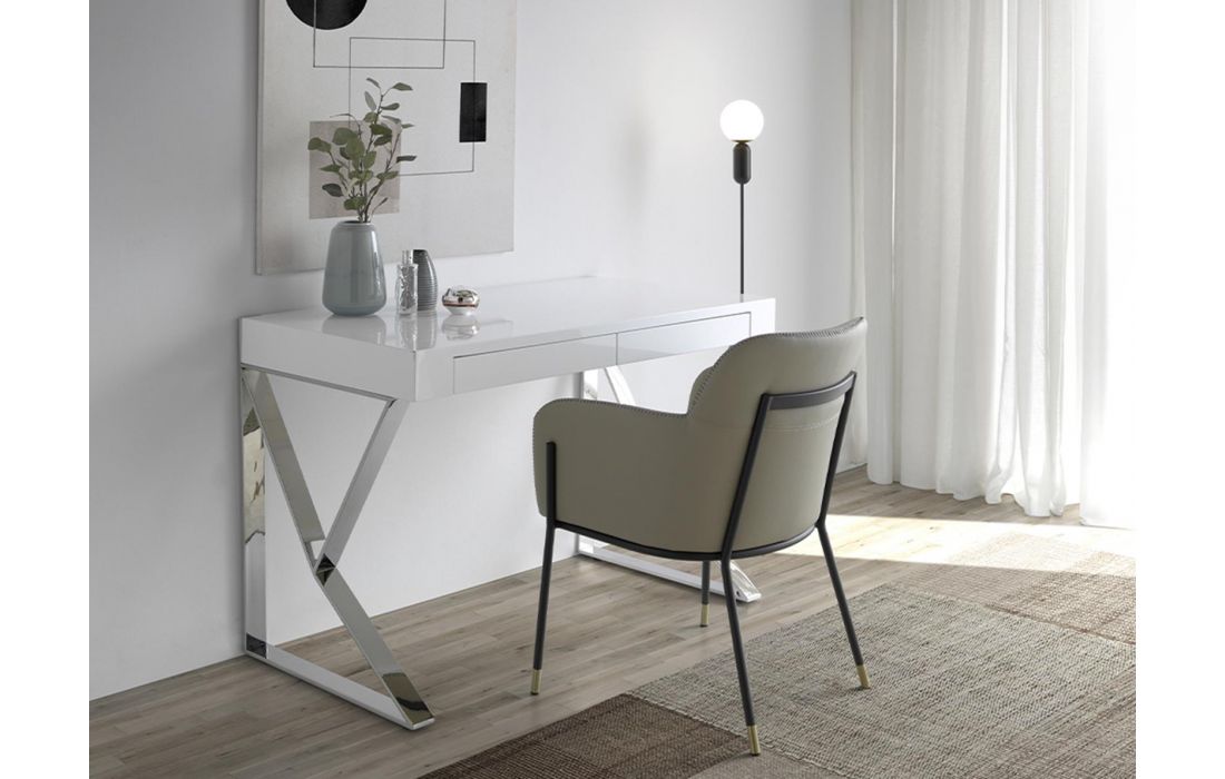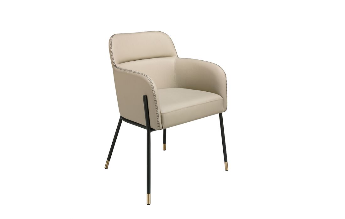Cadeirão estofada em pele sintética e estrutura de pernas em aço epóxi preto e dourado.