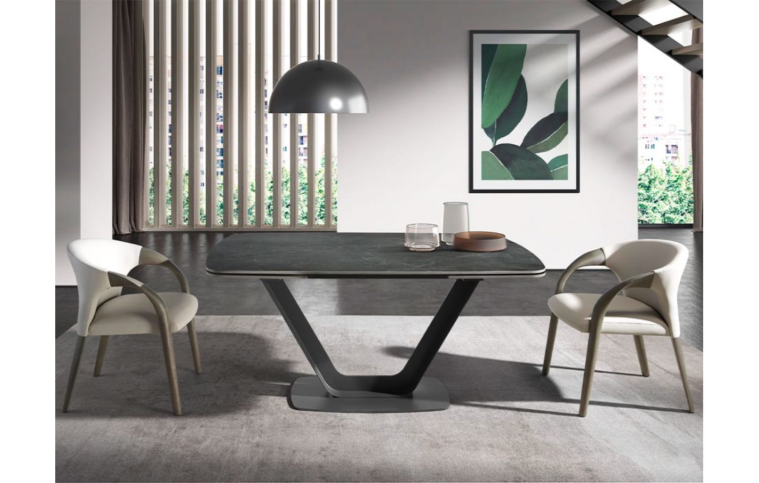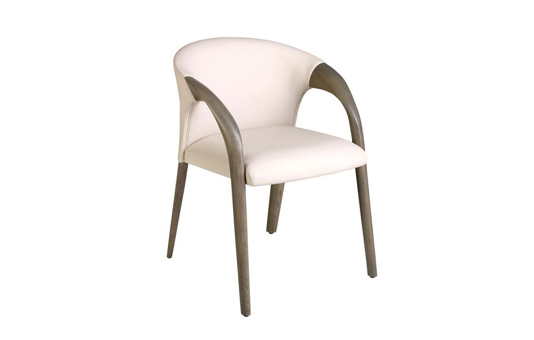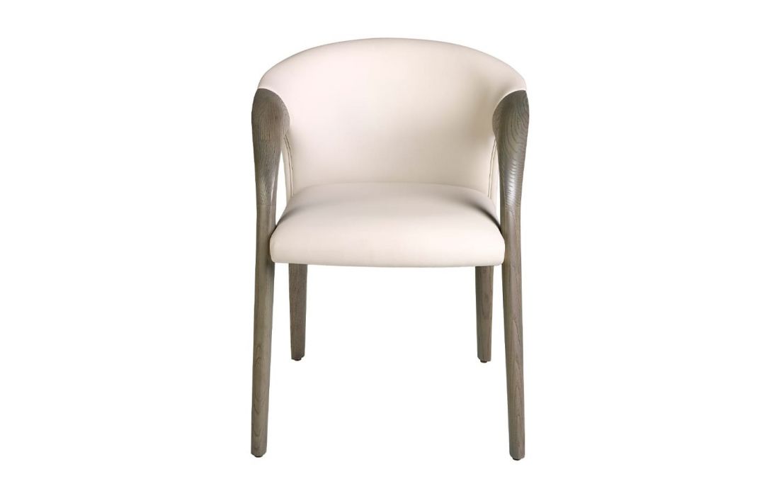 Cadeirão de design moderno com assento e encosto estofados em couro sintético creme, pés em madeira de carvalho cor cinza.