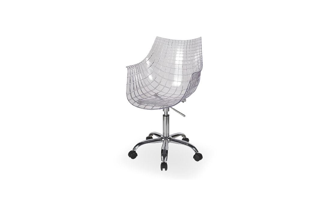 Cadeira giratória com assento e costa em policarbonato transparente e estrutura em metal cromado com rodas