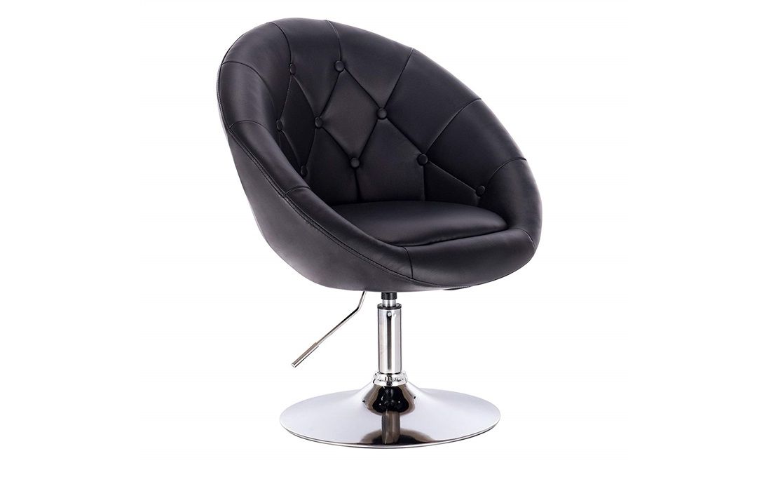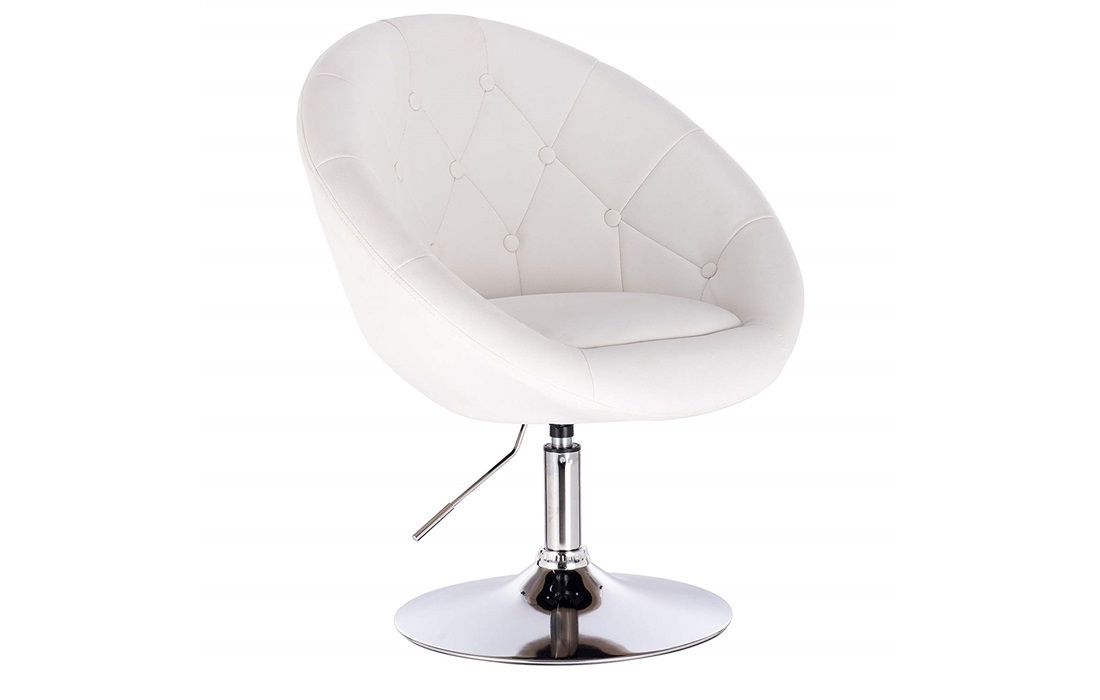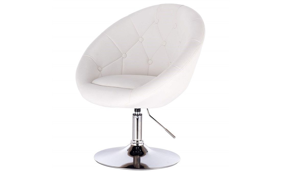 Cadeirão giratório de elevação a gás, base de metal cromado e estofo em pele sintética branca ou preta.