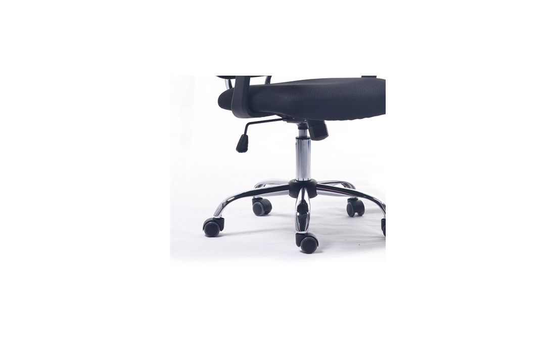 Cadeira giratória de elevação a gás com inclinação e bloqueio, estofado com rede e tecido preto e base em metal cromado.