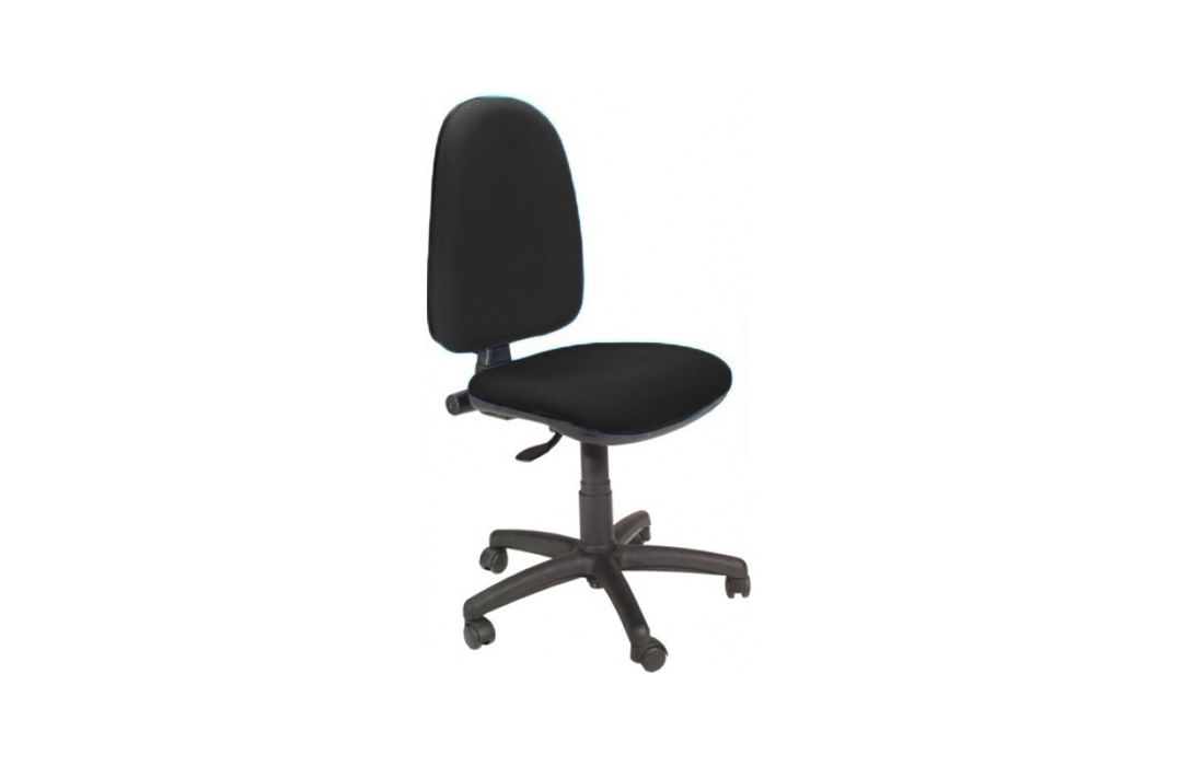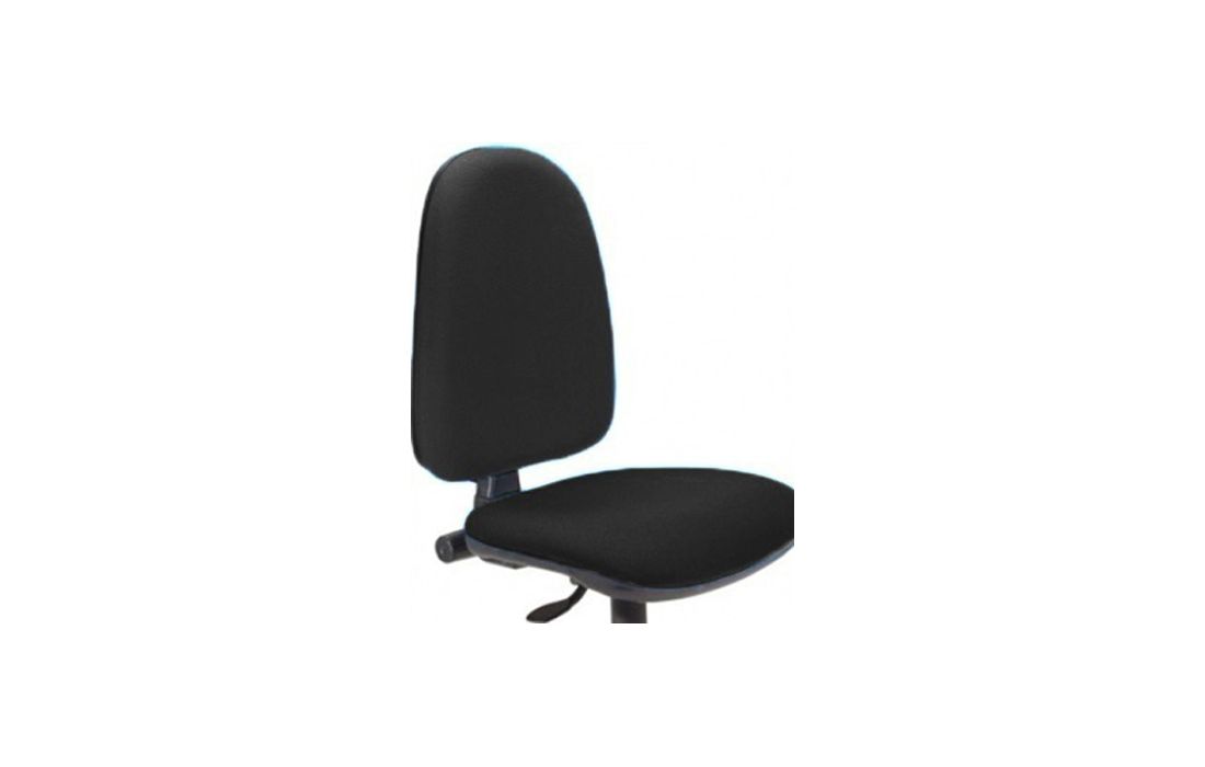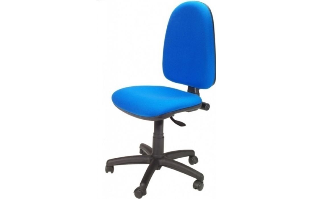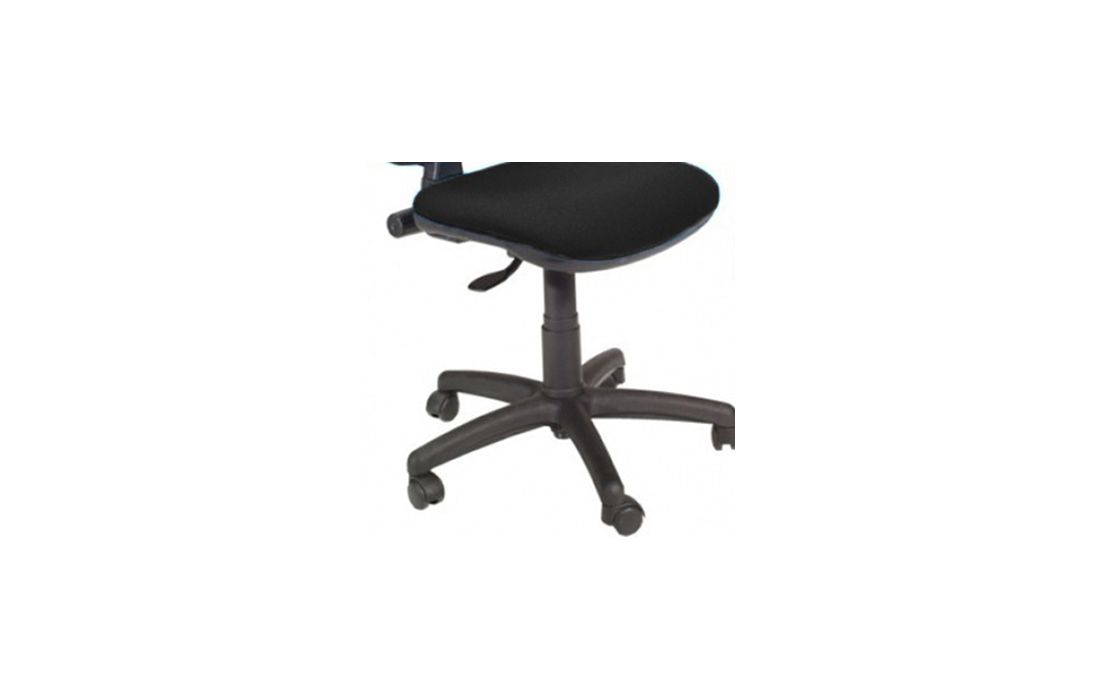 Cadeira giratória de elevação a gás com inclinação e bloqueio, base de metal cor preta e estofo em tecido cor azul ou preto.