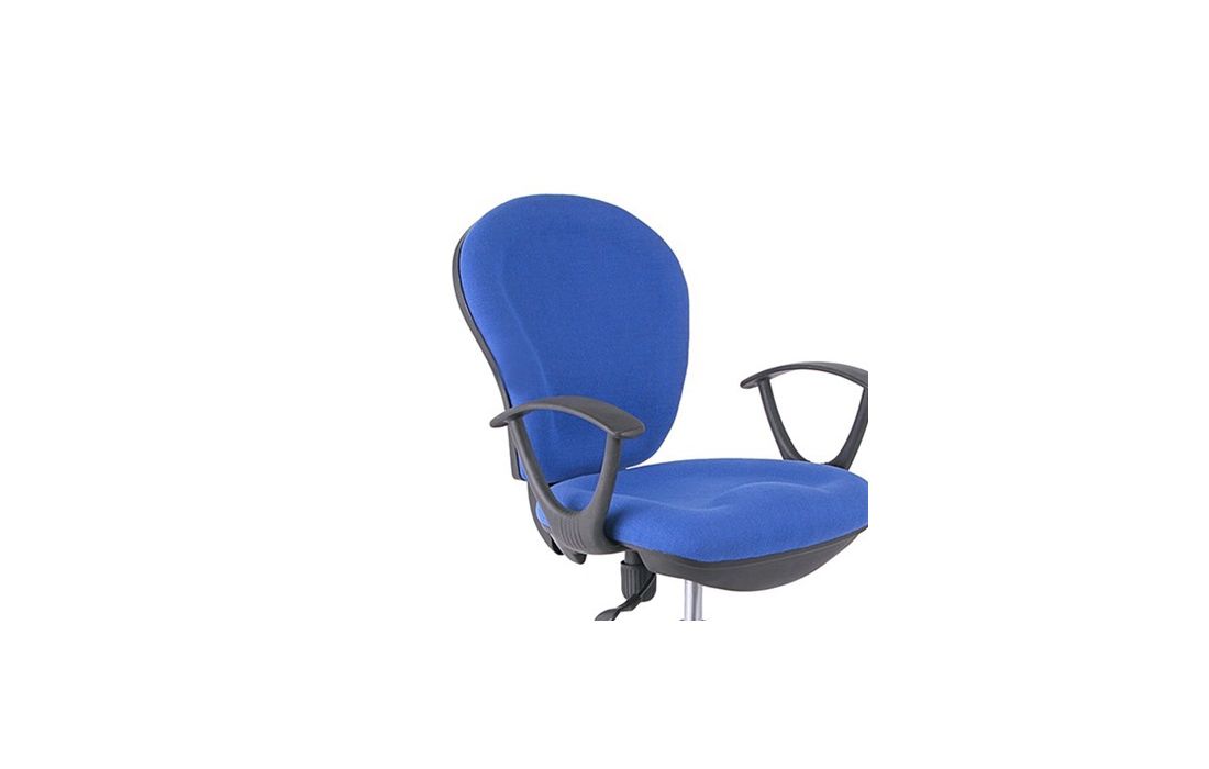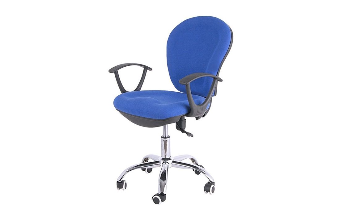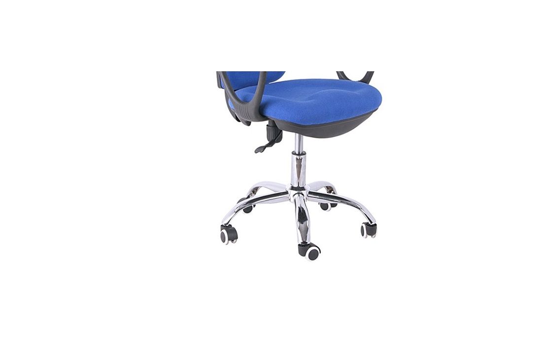 Cadeira giratória de elevação a gás com inclinação e bloqueio, base de metal cromado e estofo em tecido cor azul ou preto.