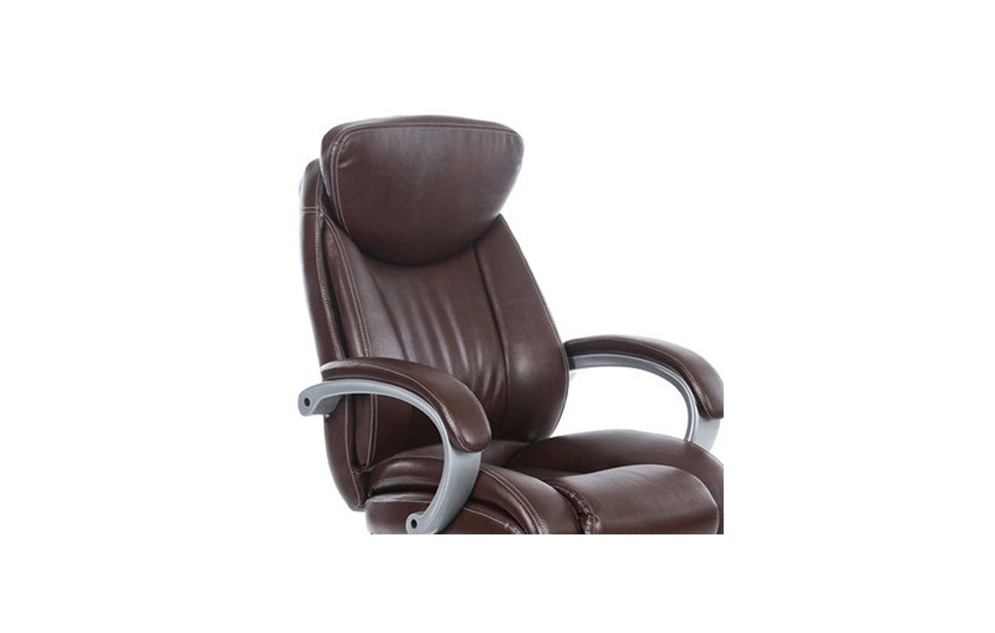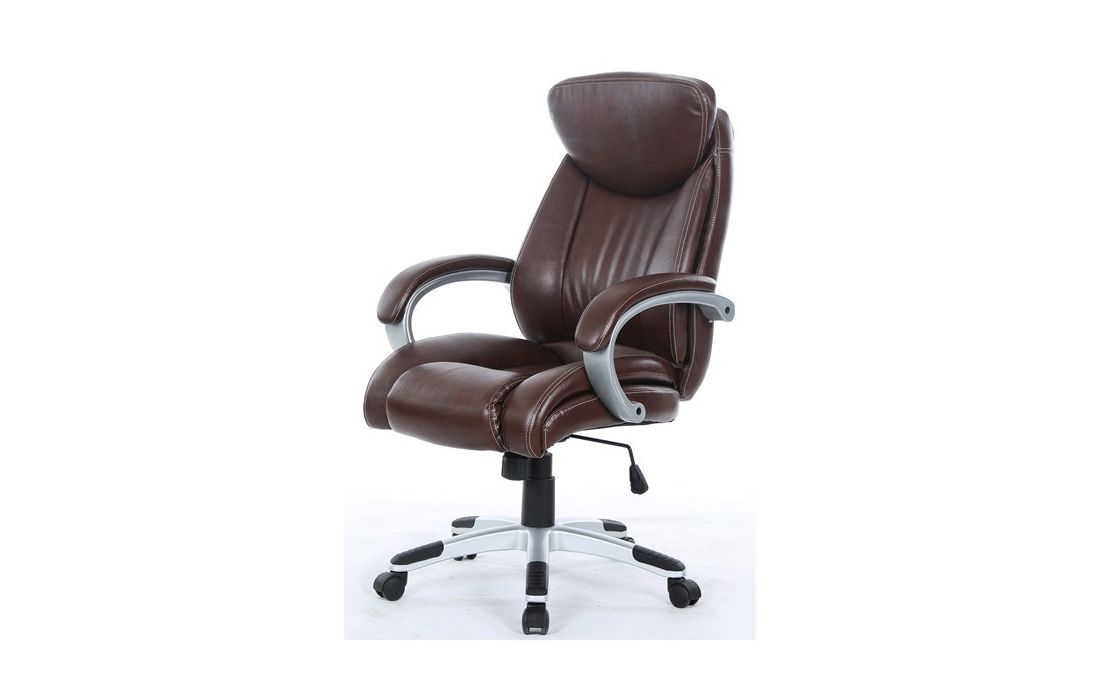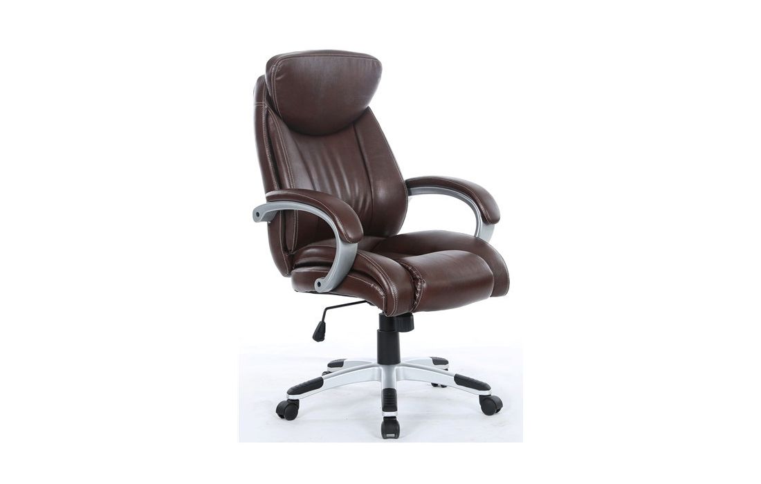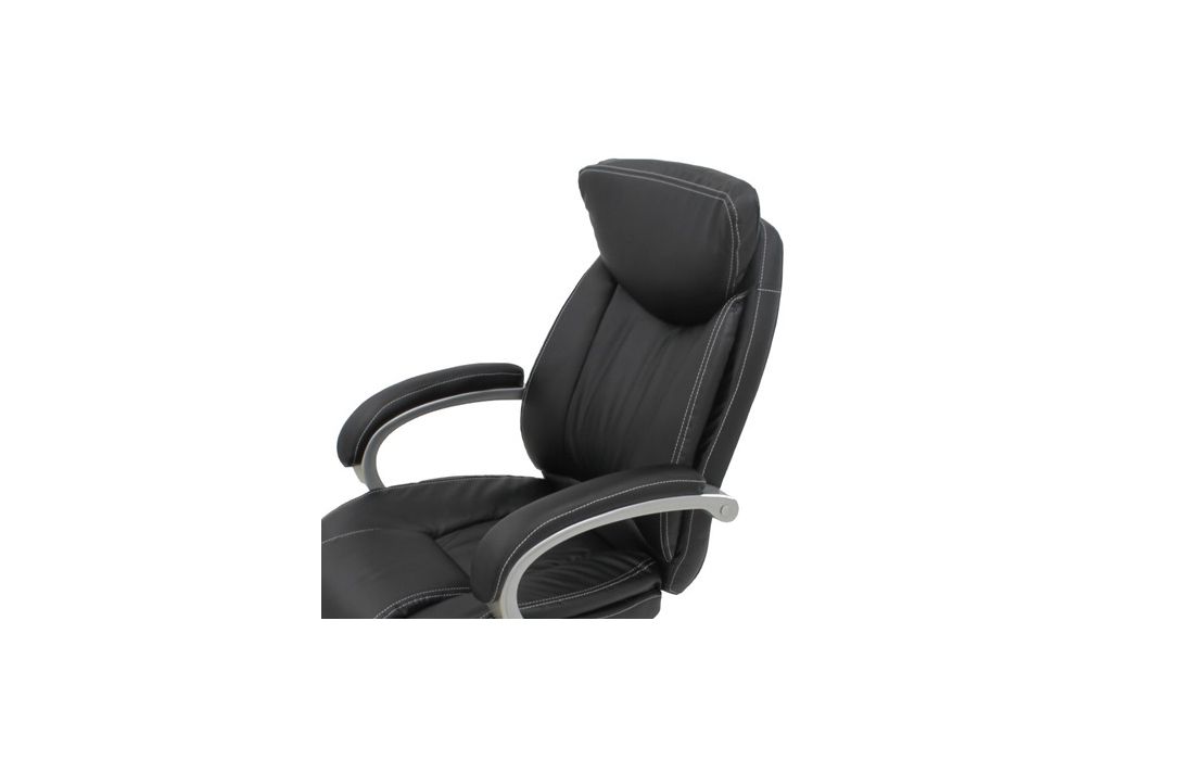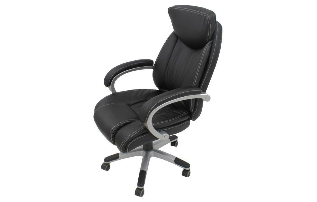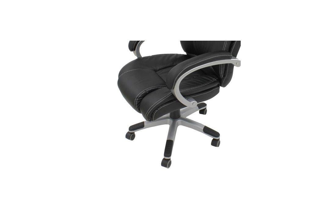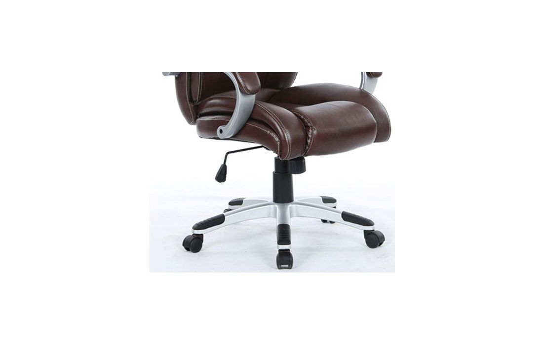 Cadeira giratória de elevação a gás com inclinação e bloqueio, base de metal e estofo em pele sintética cor bege e preta.