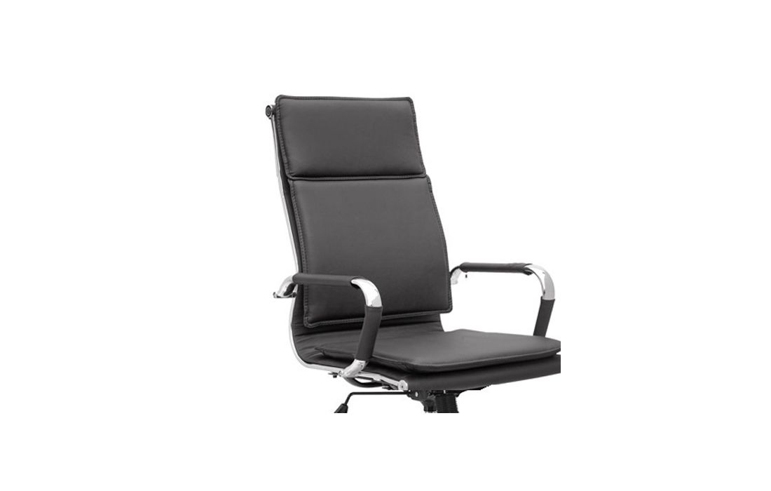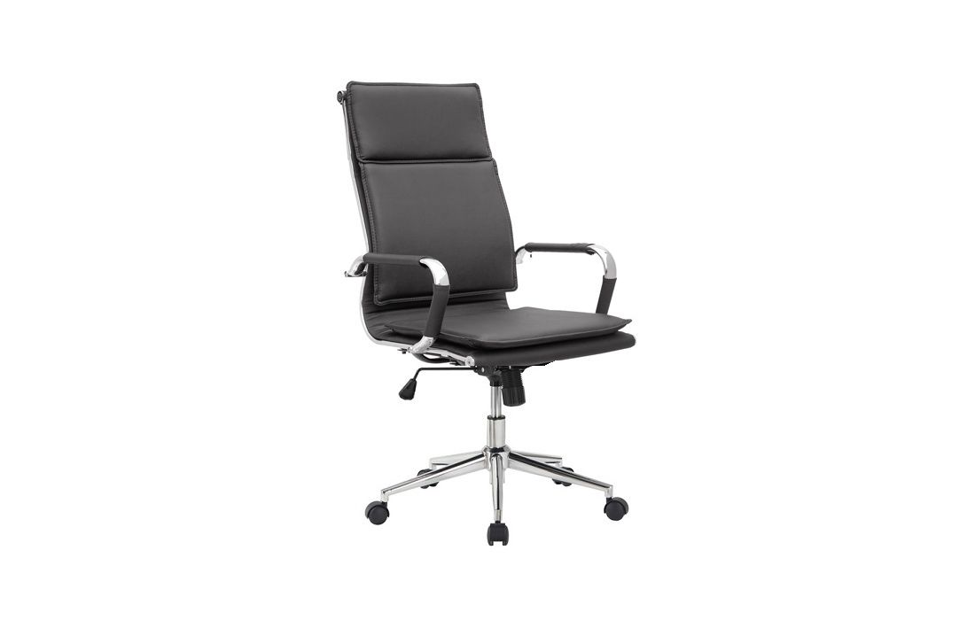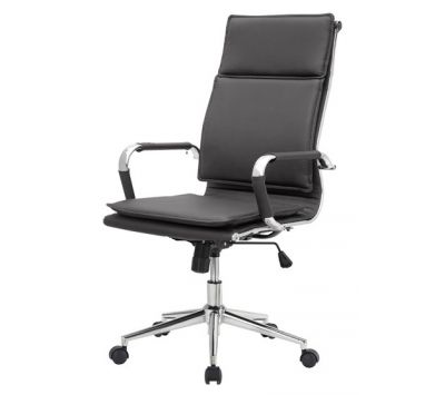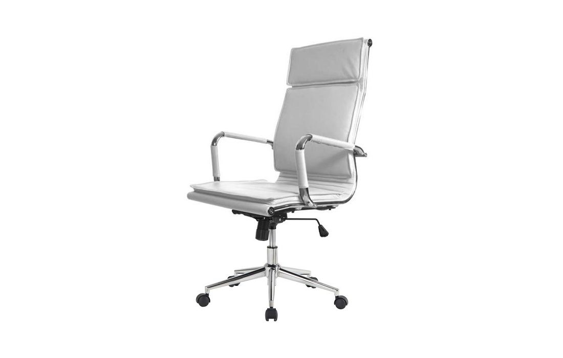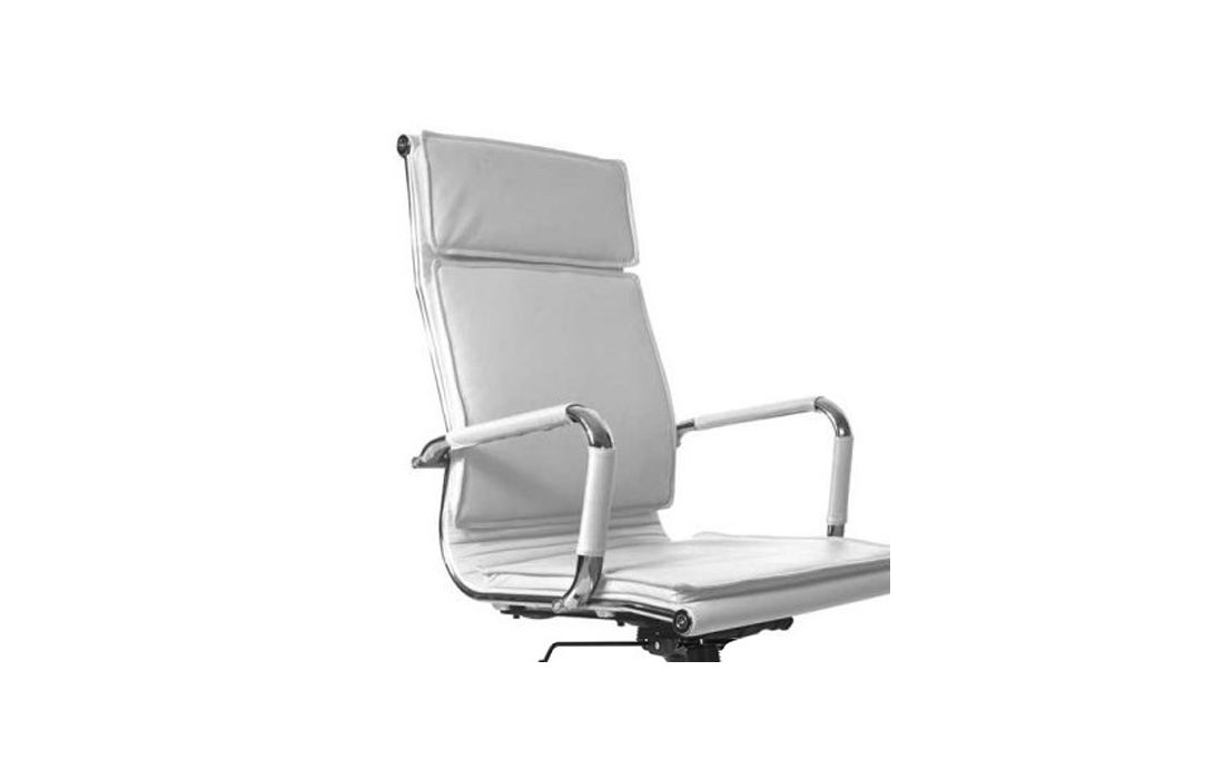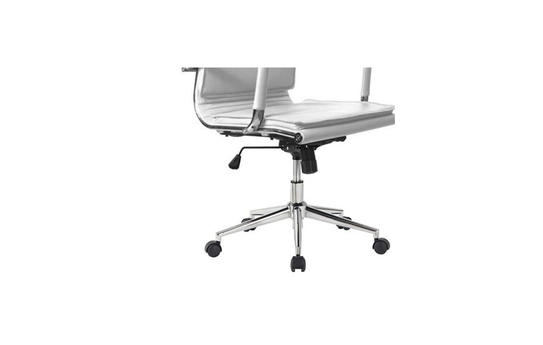 Cadeira giratória de elevação a gás com inclinação e bloqueio, base de metal e estofo em pele sintética cor branca e preta.