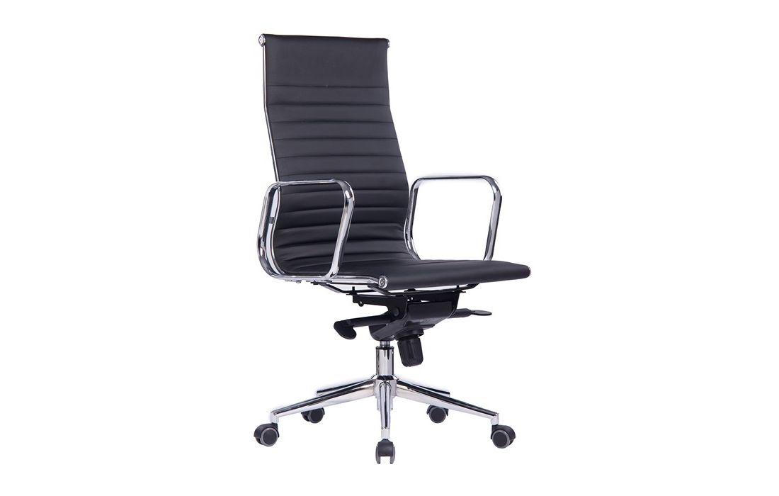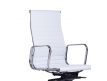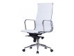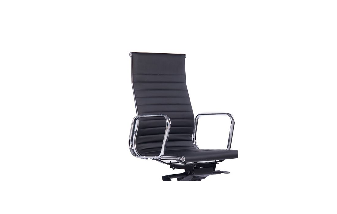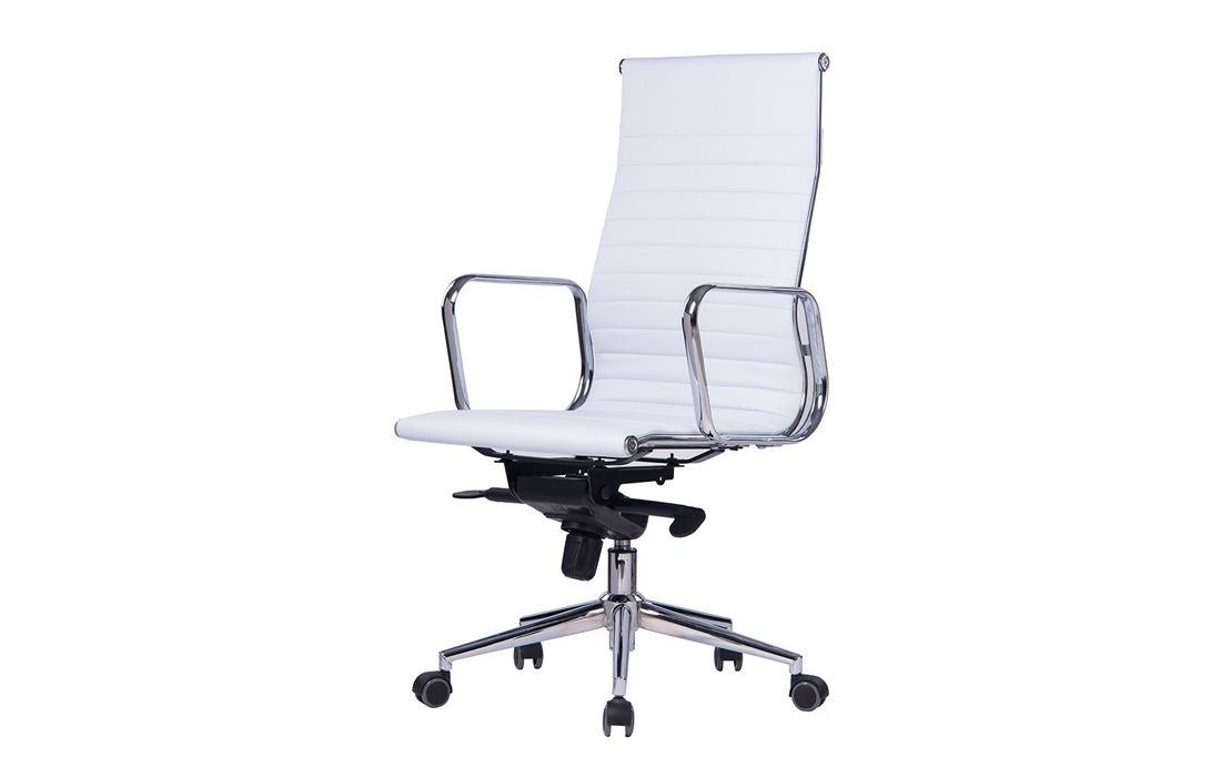 Cadeira giratória de elevação a gás com inclinação e bloqueio, estrutura de metal e estofo em pele sintética cor branca e preta.