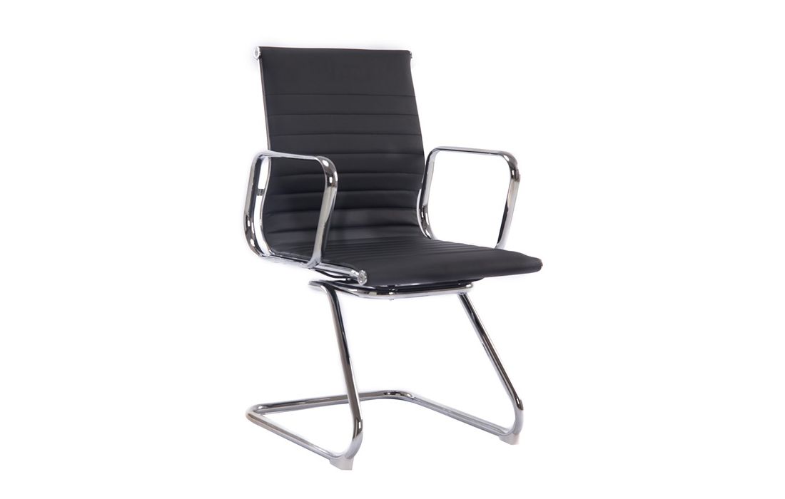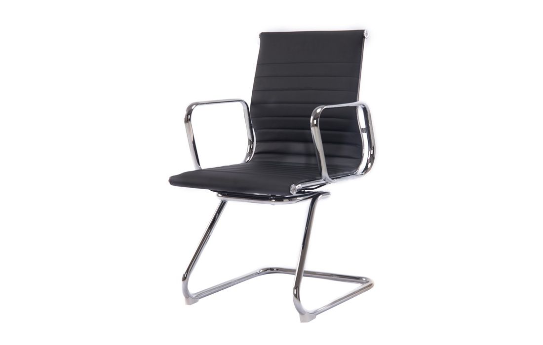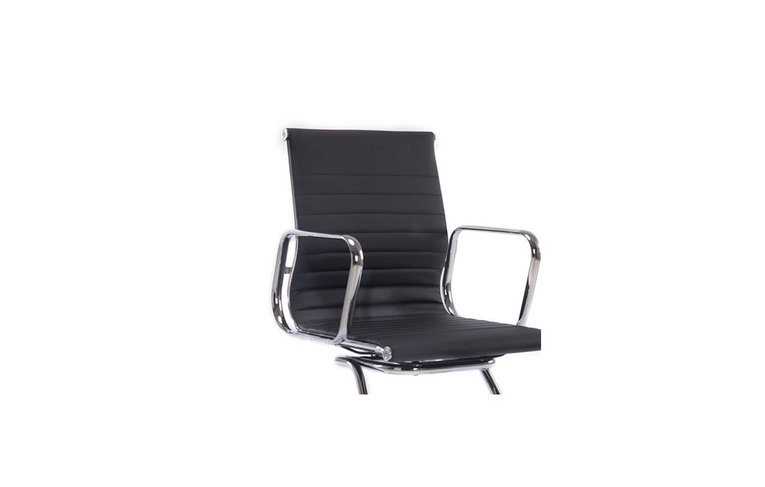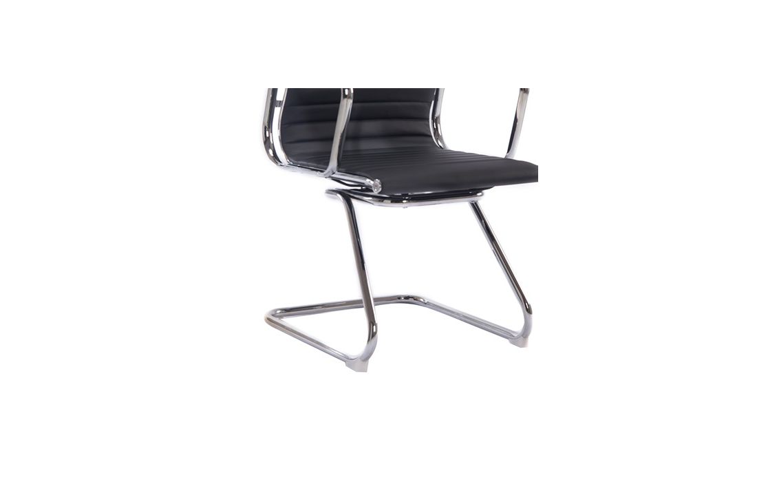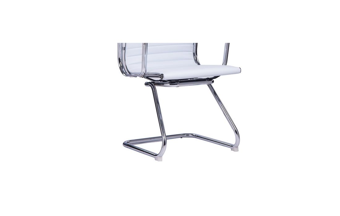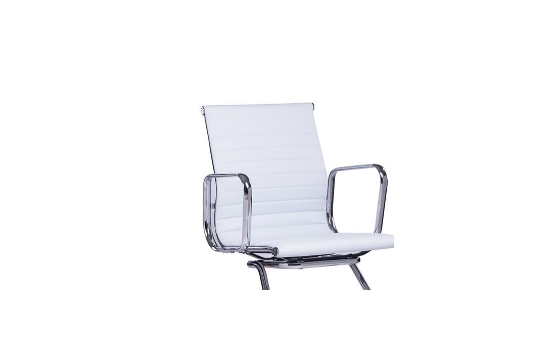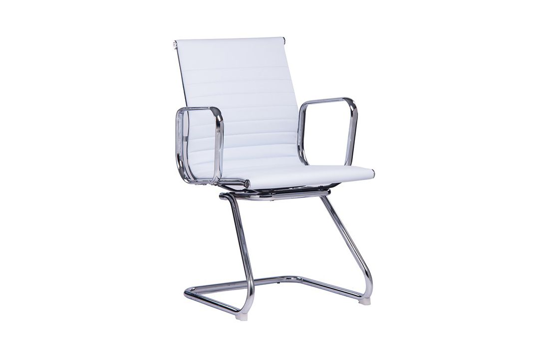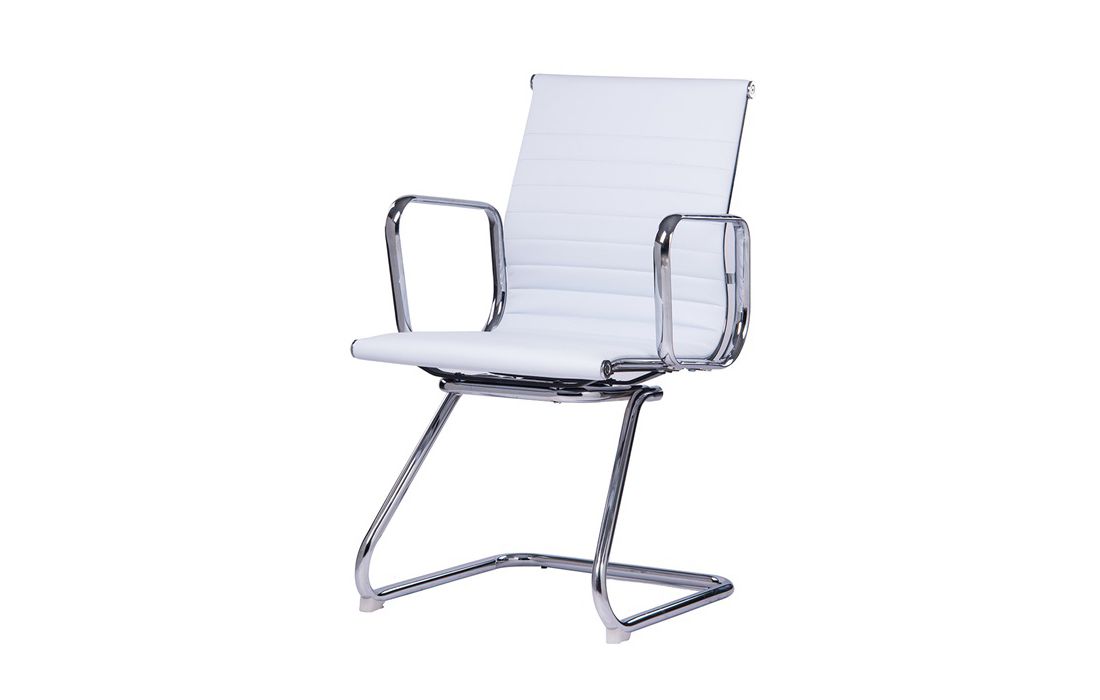 Cadeira com estrutura de metal cromado e estofo em pele sintética cor branca e preta.