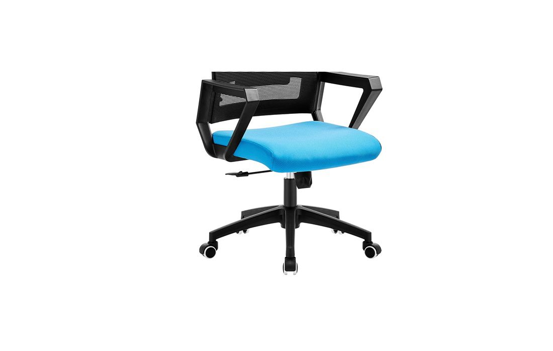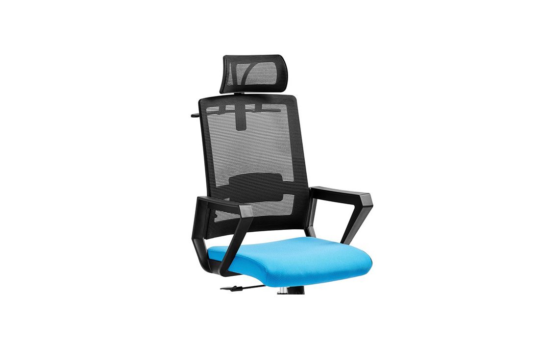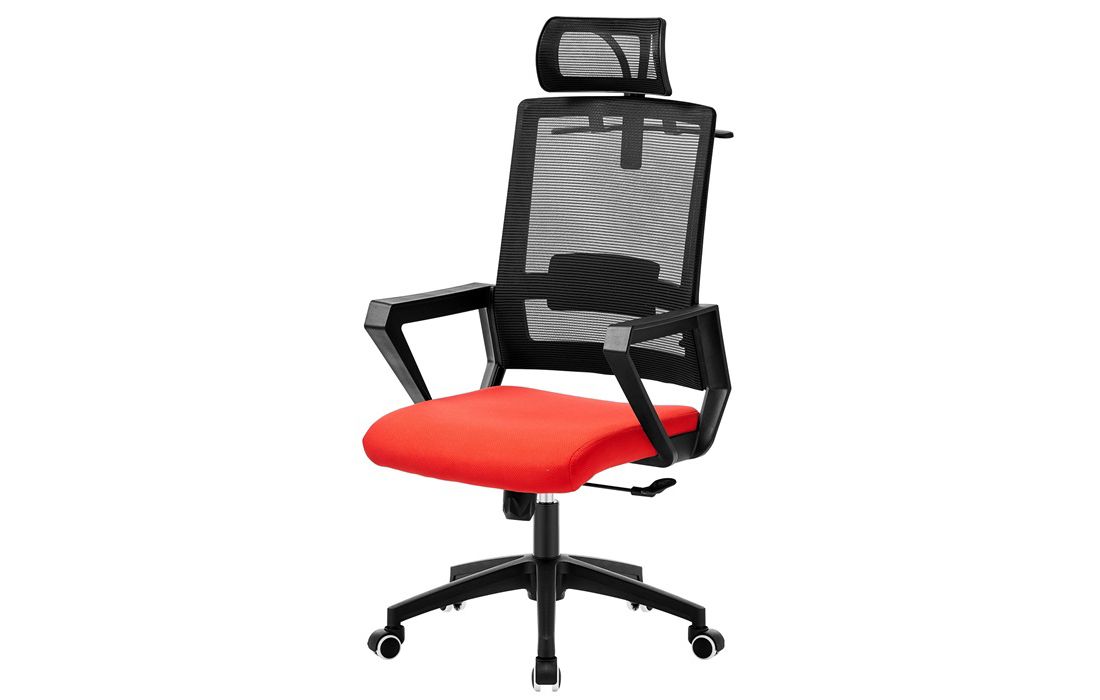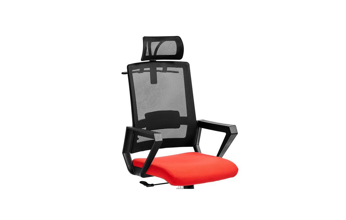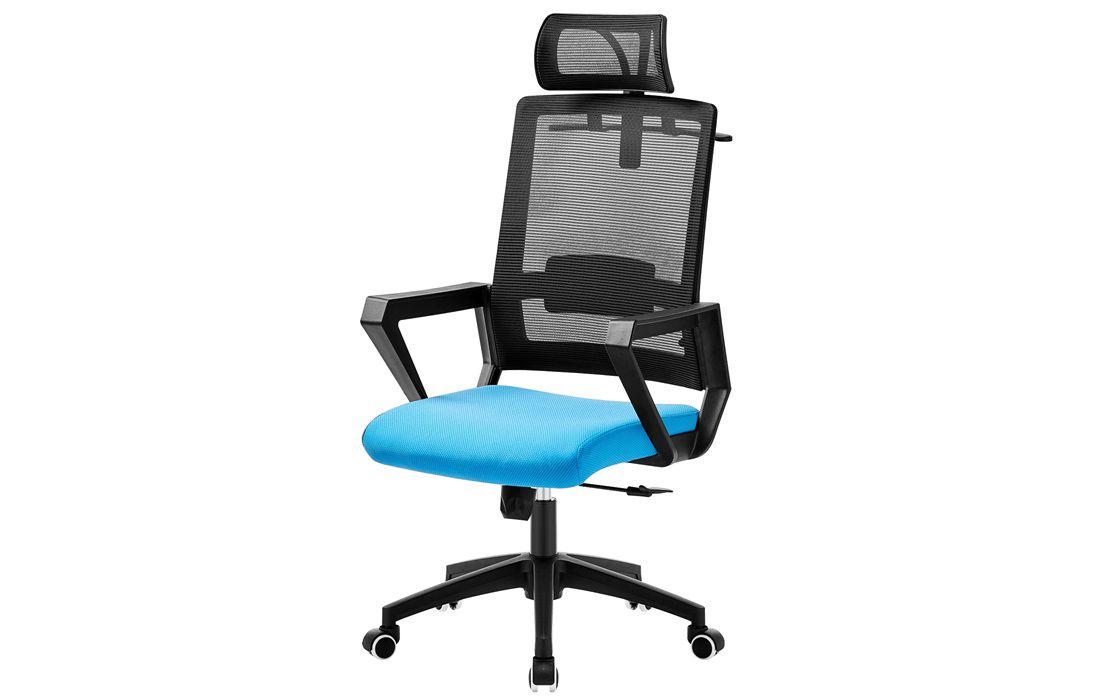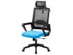 Cadeira giratória de elevação a gás com inclinação e bloqueio, estrutura de metal, estofo da costa em rede cor preta e assento em tecido nas cores azul, preto e vermelho.