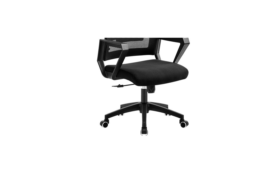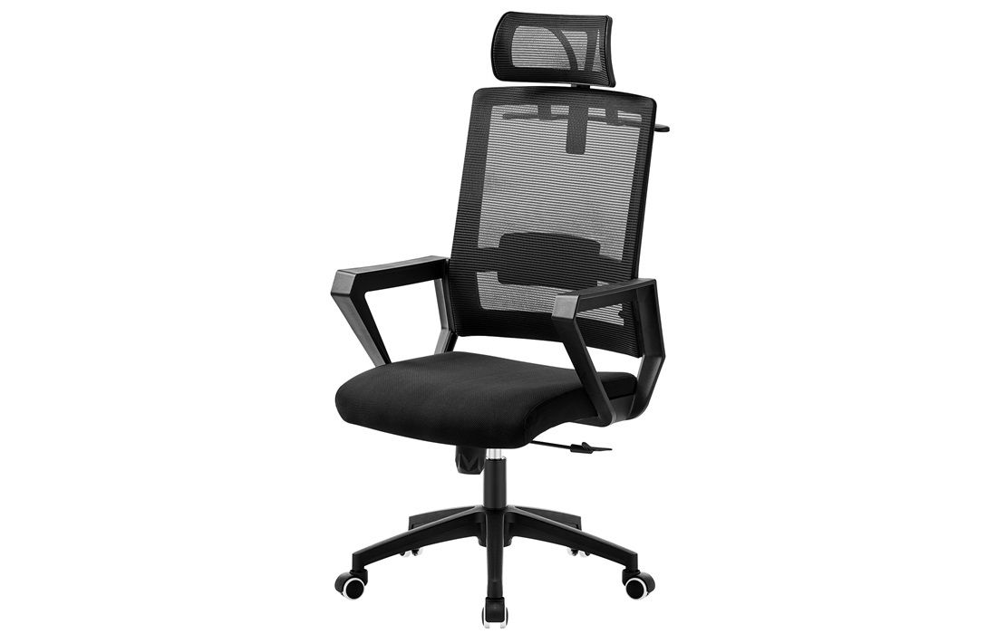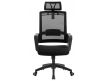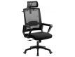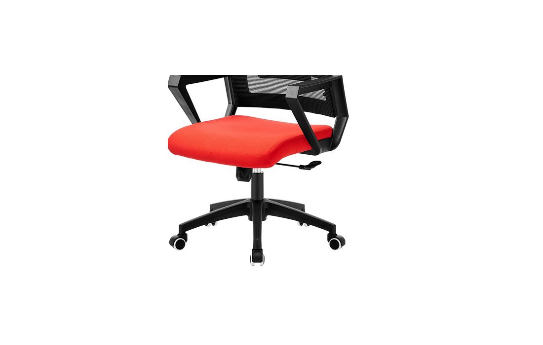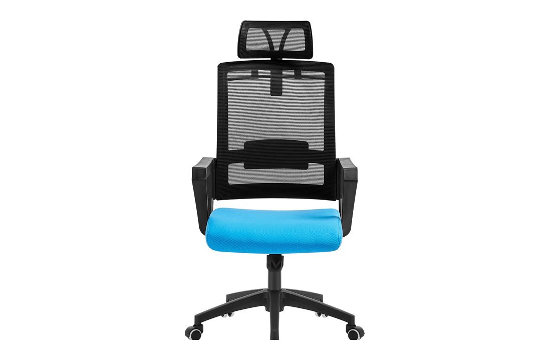 Cadeira giratória de elevação a gás com inclinação e bloqueio, estrutura de metal, estofo da costa em rede cor preta e assento em tecido nas cores azul, preto e vermelho.