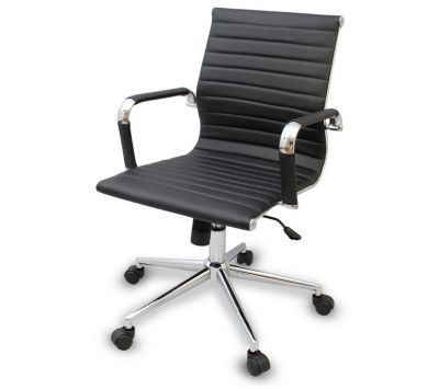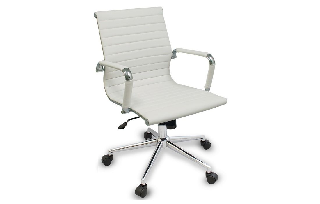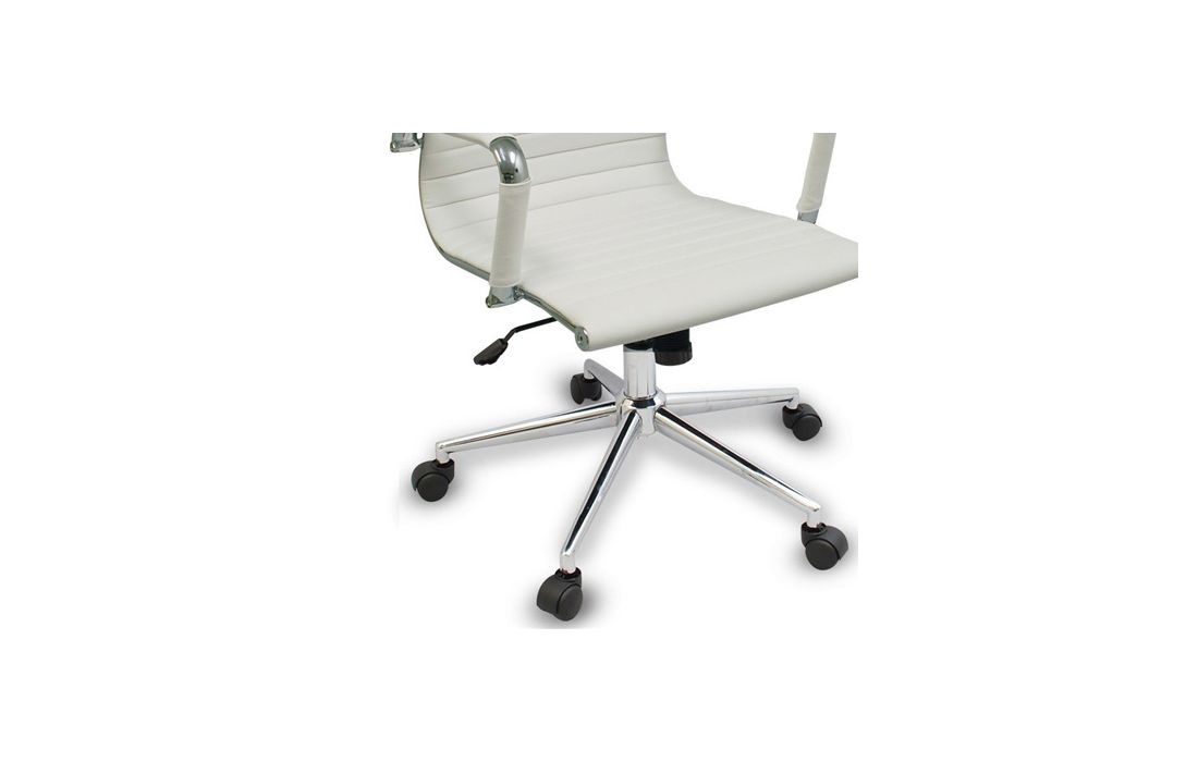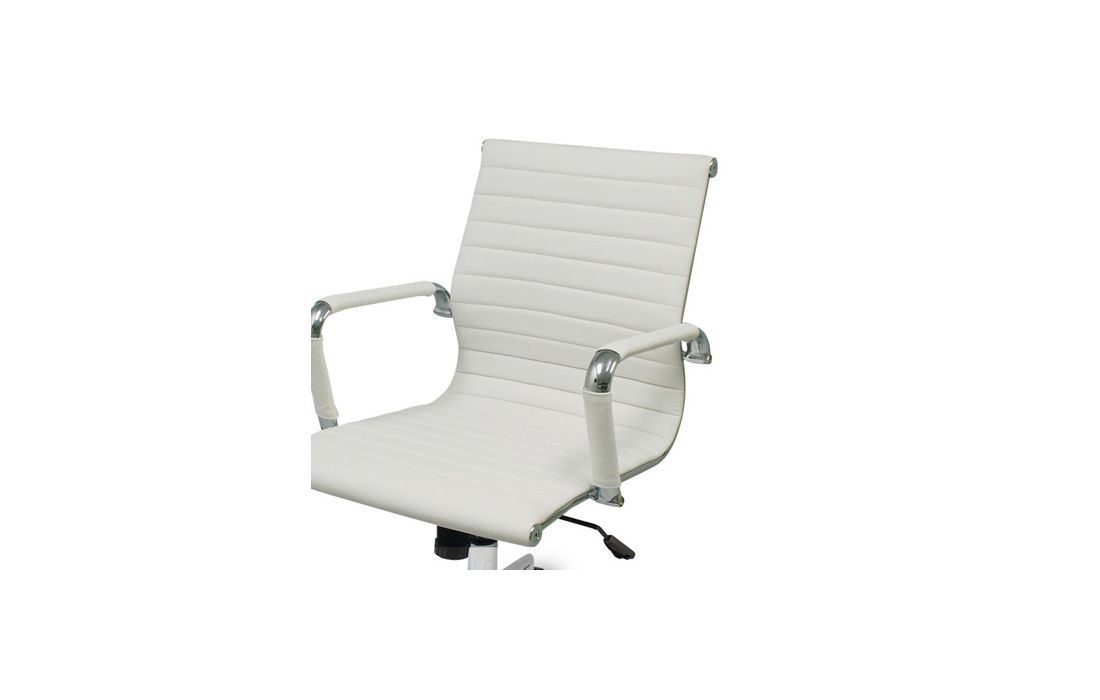 Cadeira giratório de elevação a gás com inclinação e bloqueio, estrutura de metal e estofo em pele sintética nas cores preto e branco.
