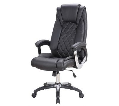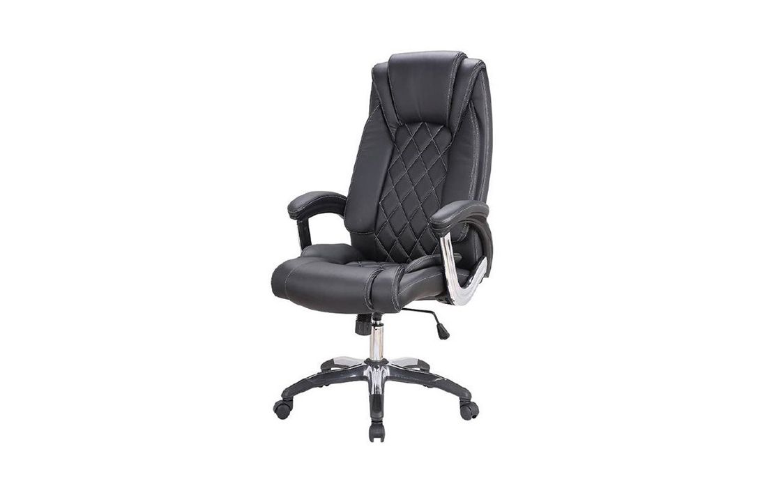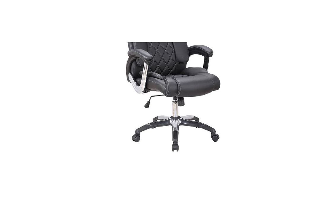 Cadeira giratória de elevação a gás com inclinação e bloqueio, base de metal cromado e estofo em pele sintética de cor preta.