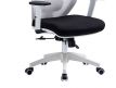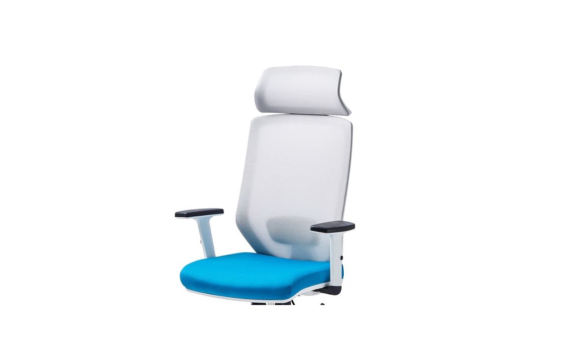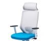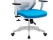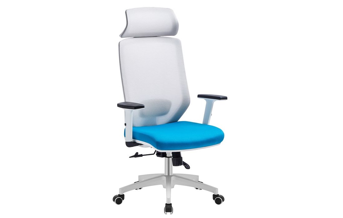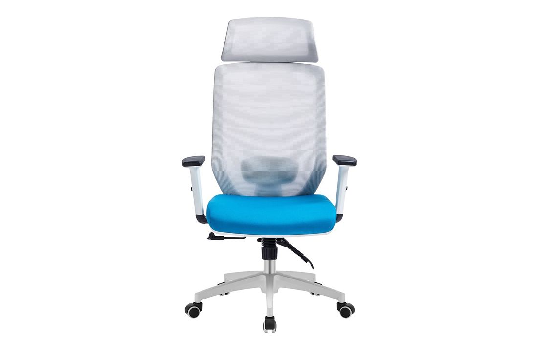Cadeira giratória de elevação a gás com sinclo e bloqueio, estrutura de metal, braços ajustáveis em altura, estofo da costa em rede cinza e assento em tecido nas cores azul e preto.