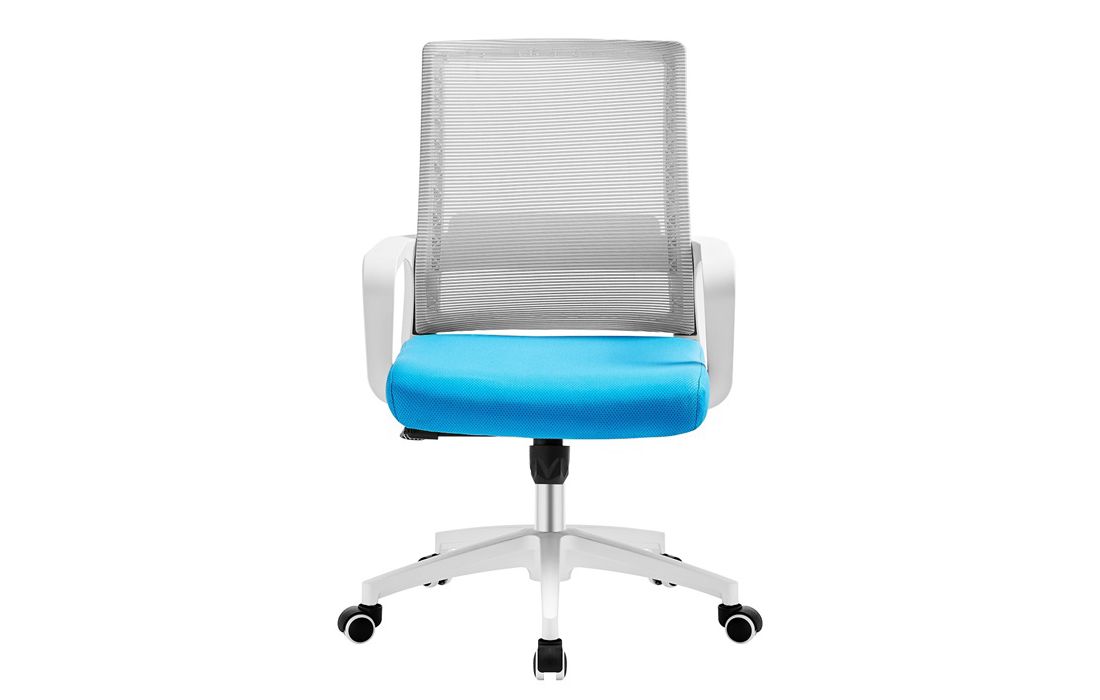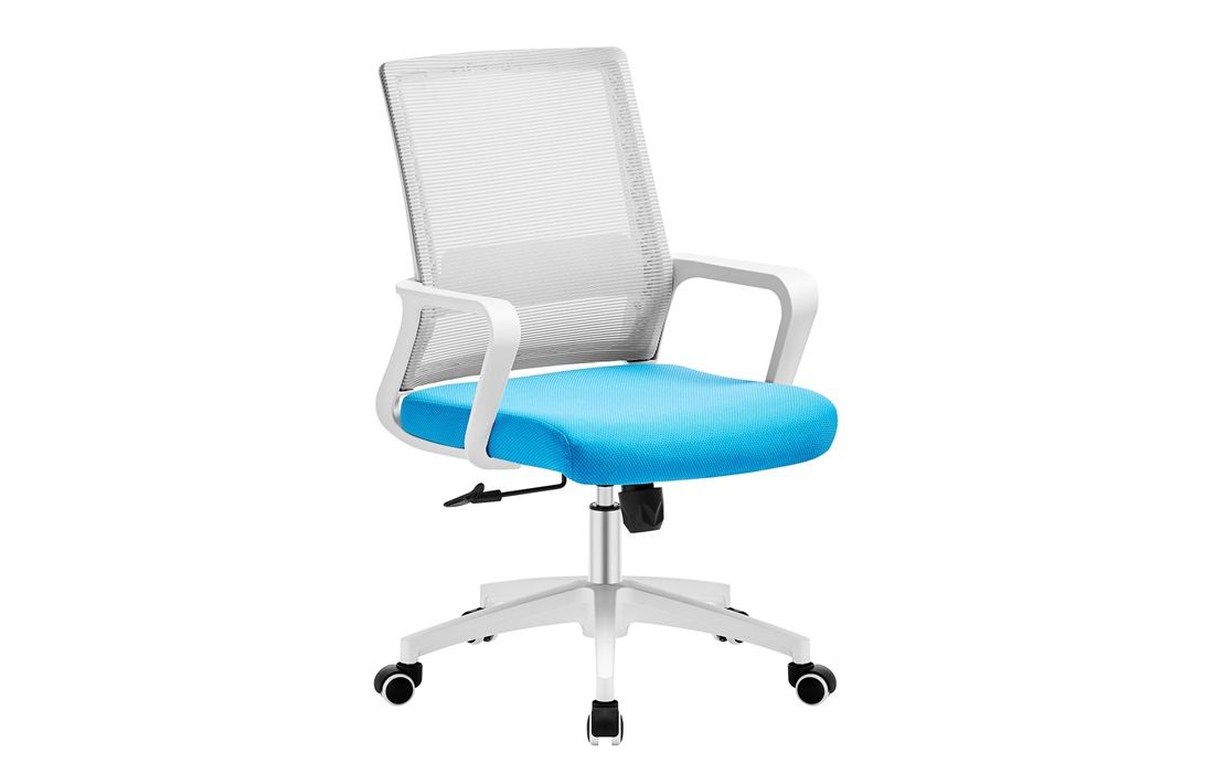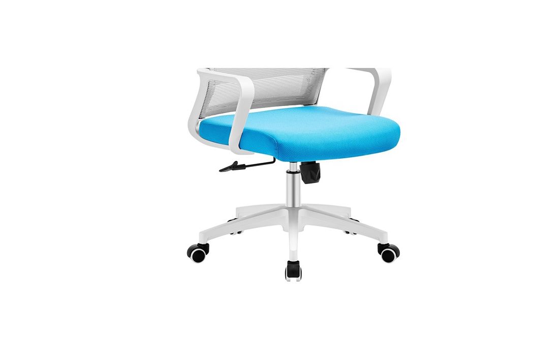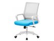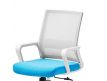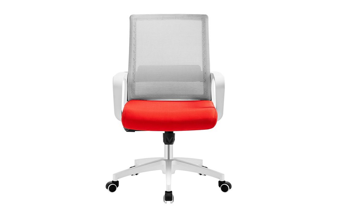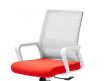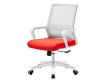Cadeira giratória de elevação a gás com inclinação e bloqueio, estrutura de metal, estofo da costa em rede cinza e assento em tecido nas cores vermelho, preto e azul.