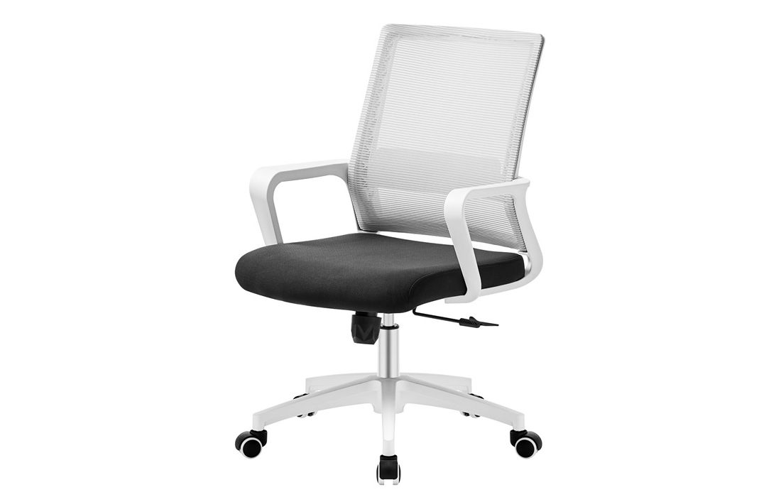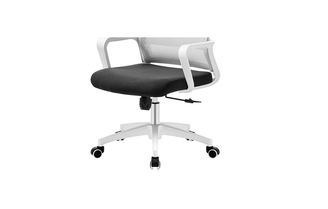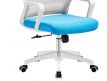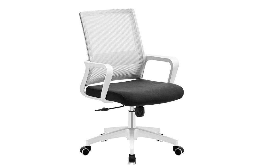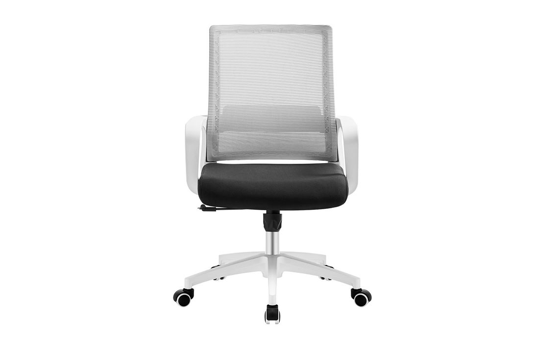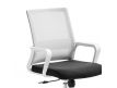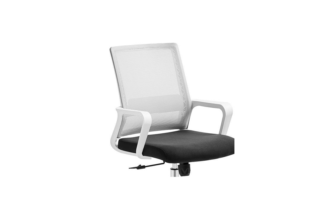 Cadeira giratória de elevação a gás com inclinação e bloqueio, estrutura de metal, estofo da costa em rede cinza e assento em tecido nas cores vermelho, preto e azul.