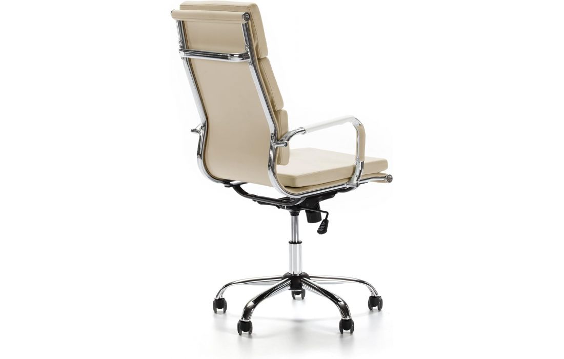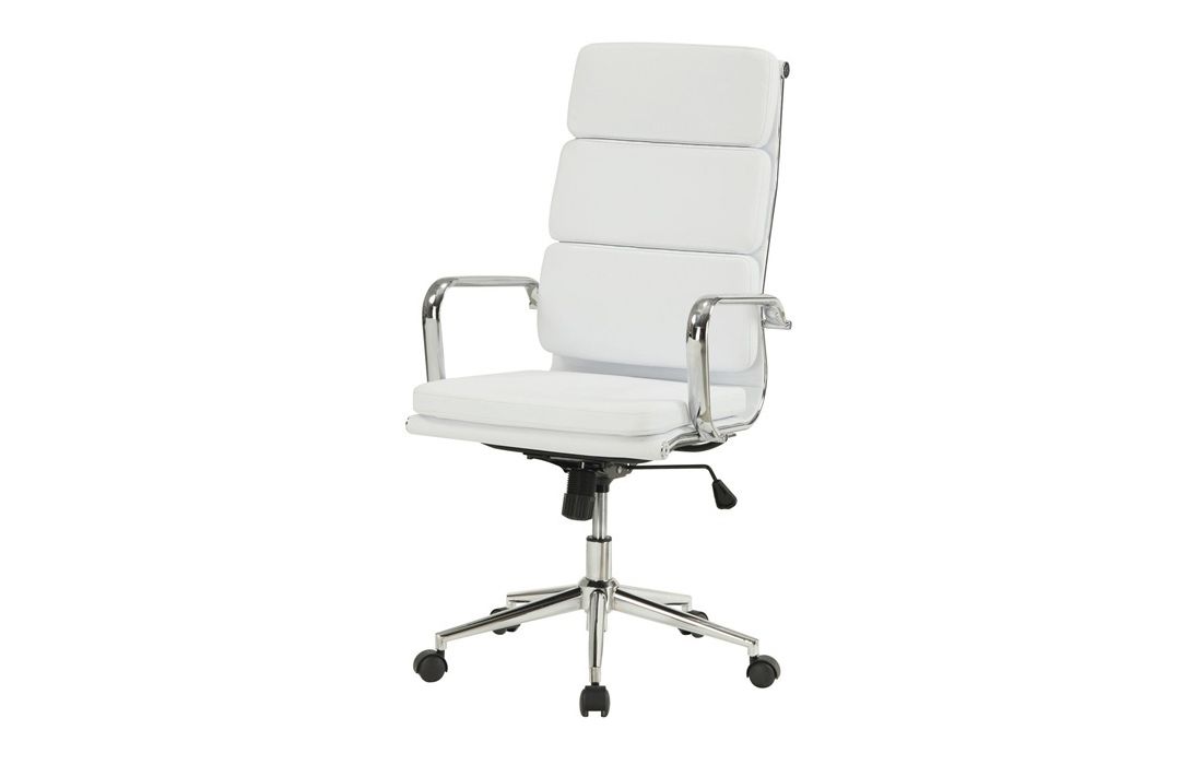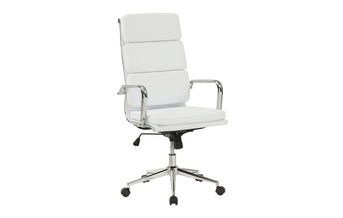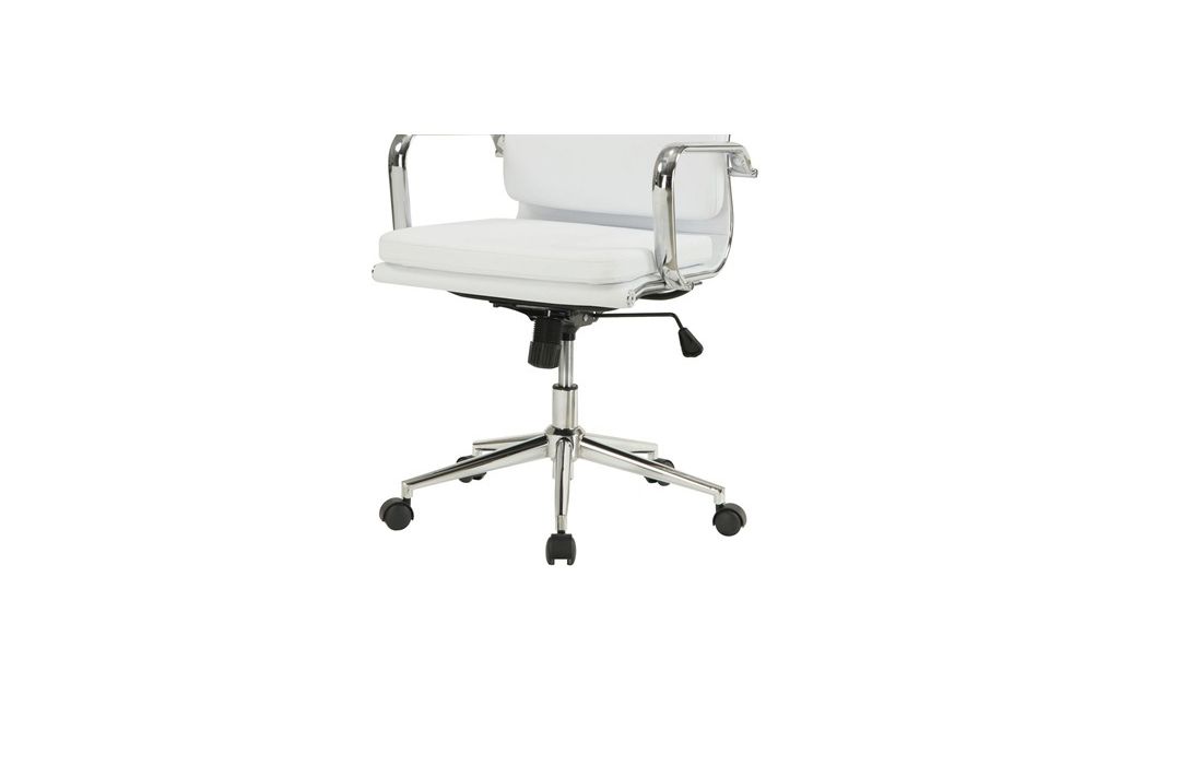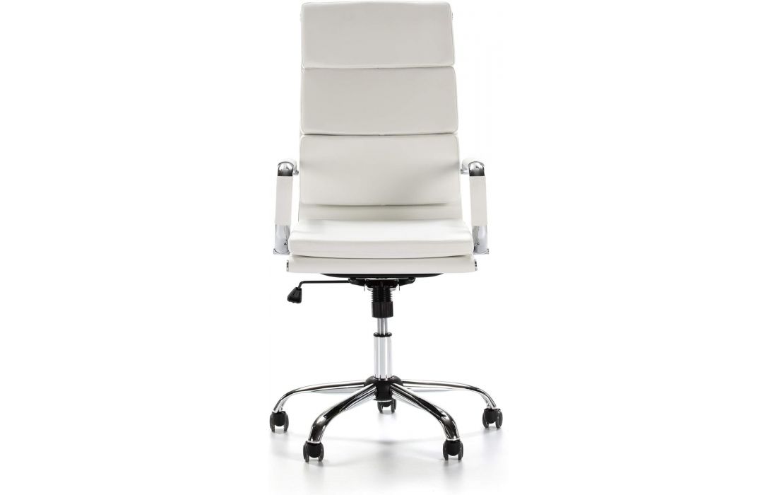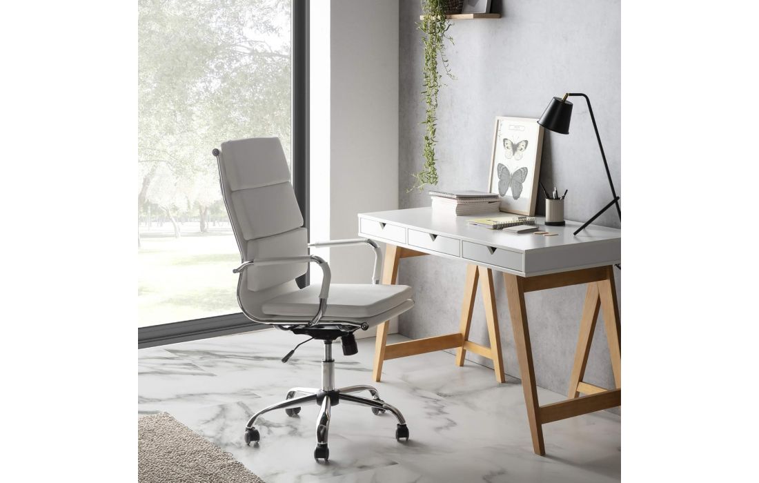 Cadeira giratória de elevação a gás com inclinação e bloqueio, estrutura de metal e estofo em pele sintética nas cores preta e branca.
