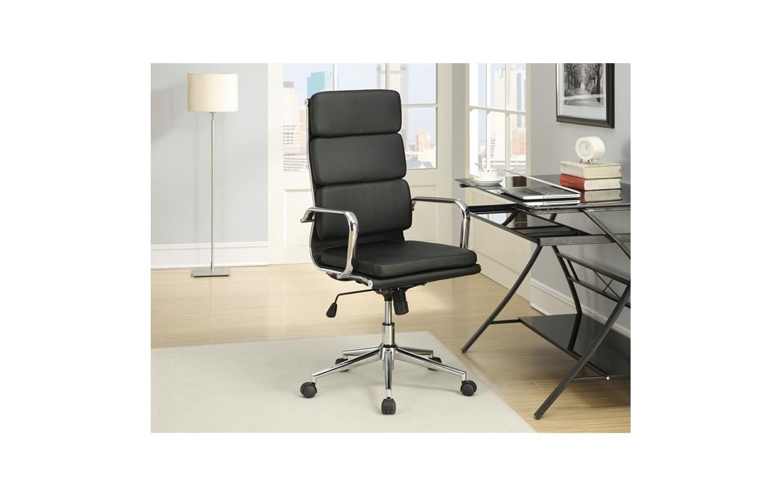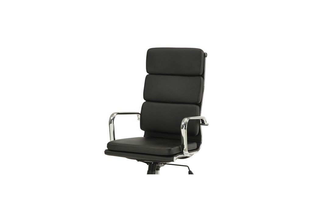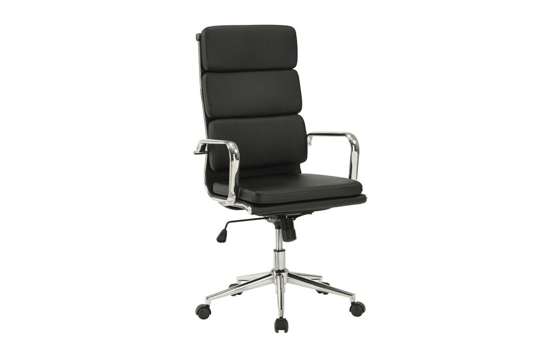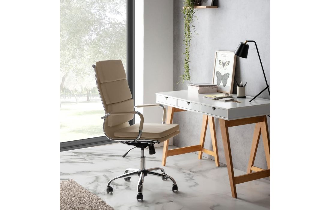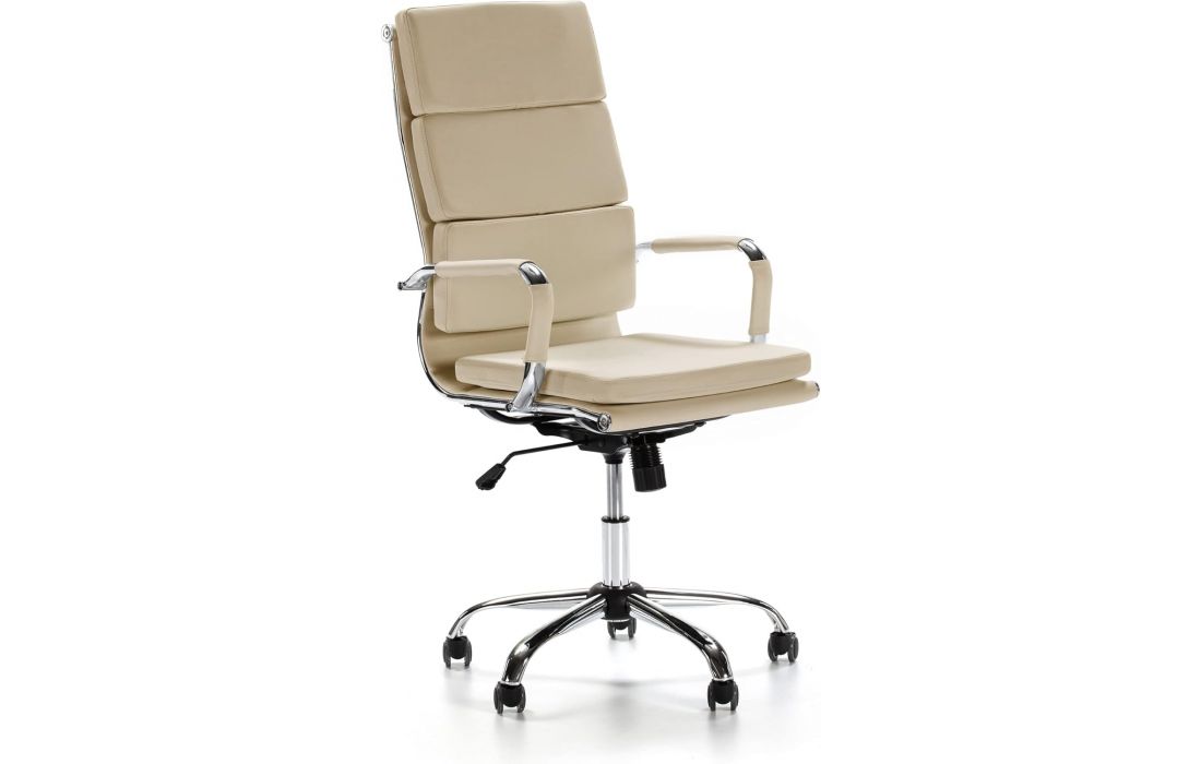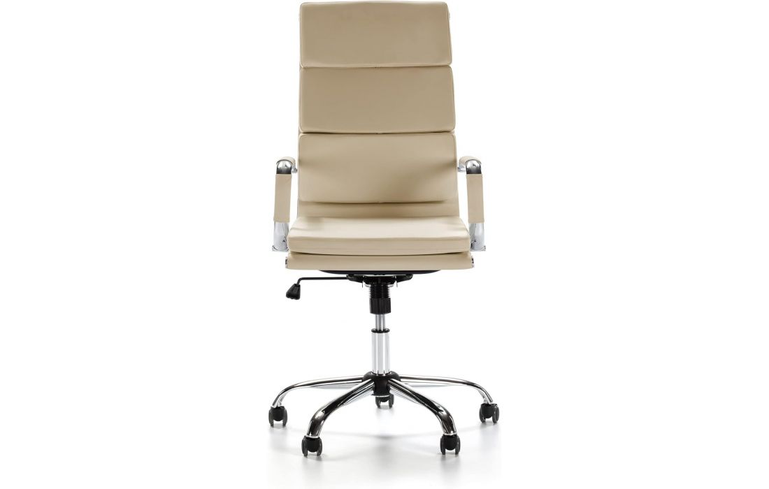 Cadeira giratória de elevação a gás com inclinação e bloqueio, estrutura de metal e estofo em pele sintética nas cores preta e branca.