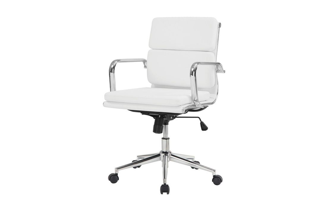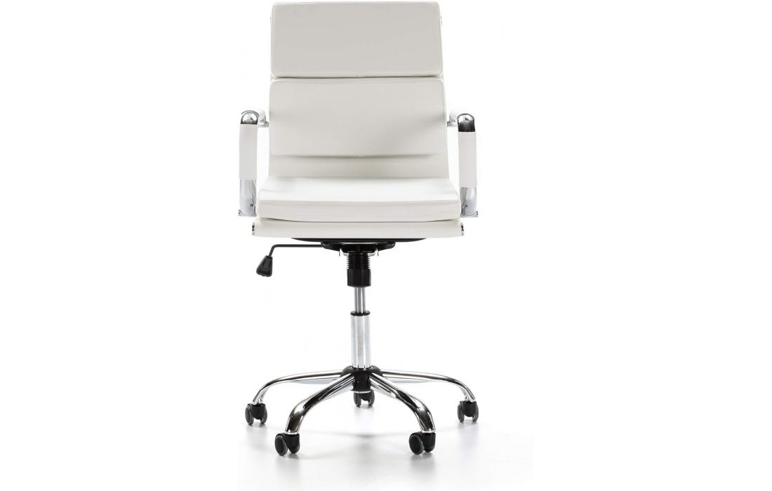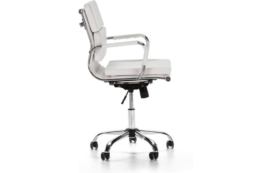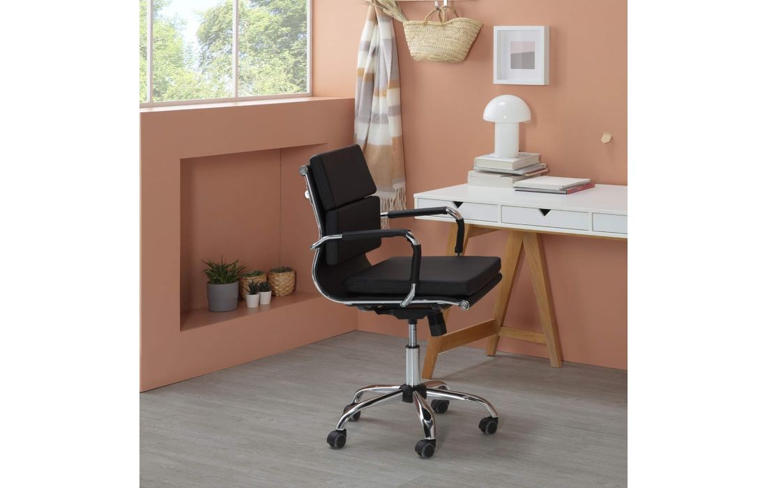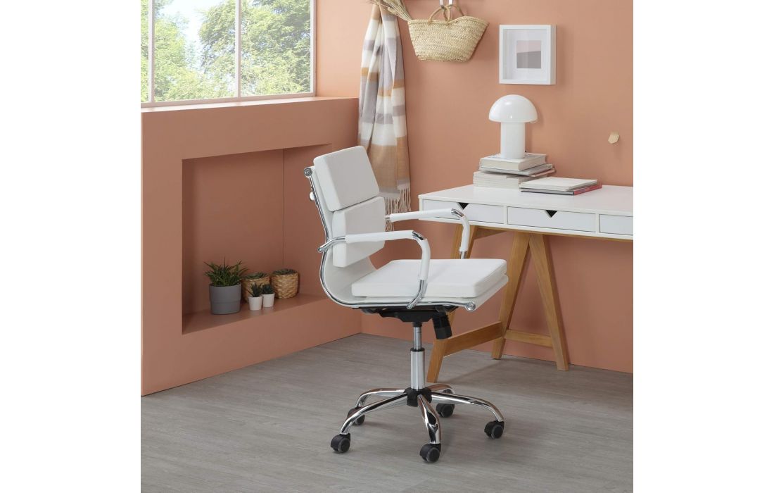 Cadeira giratória de elevação a gás com inclinação e bloqueio, estrutura de metal e estofo em pele sintética nas cores preta e branca.