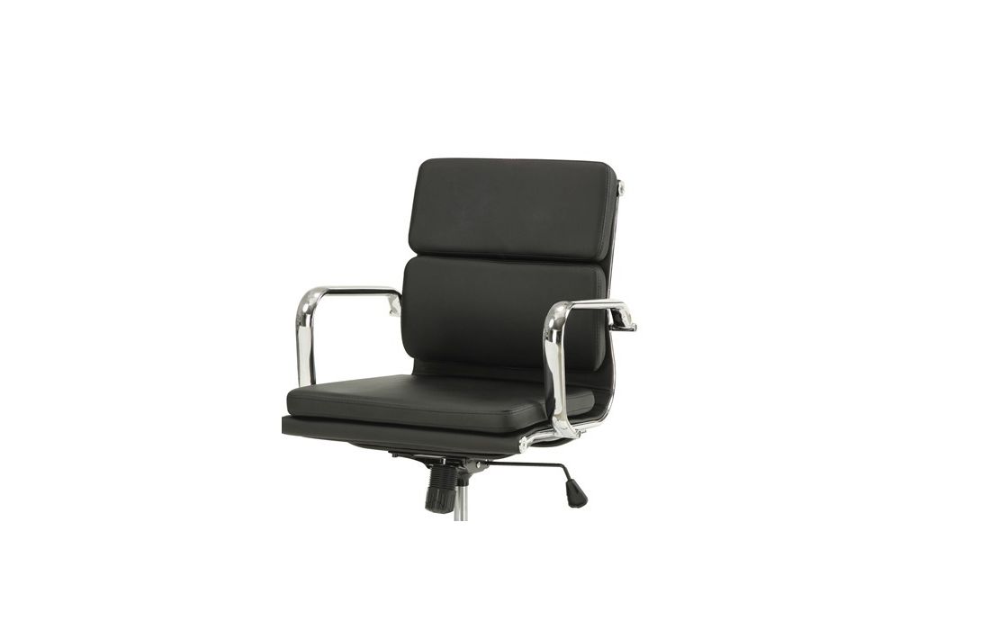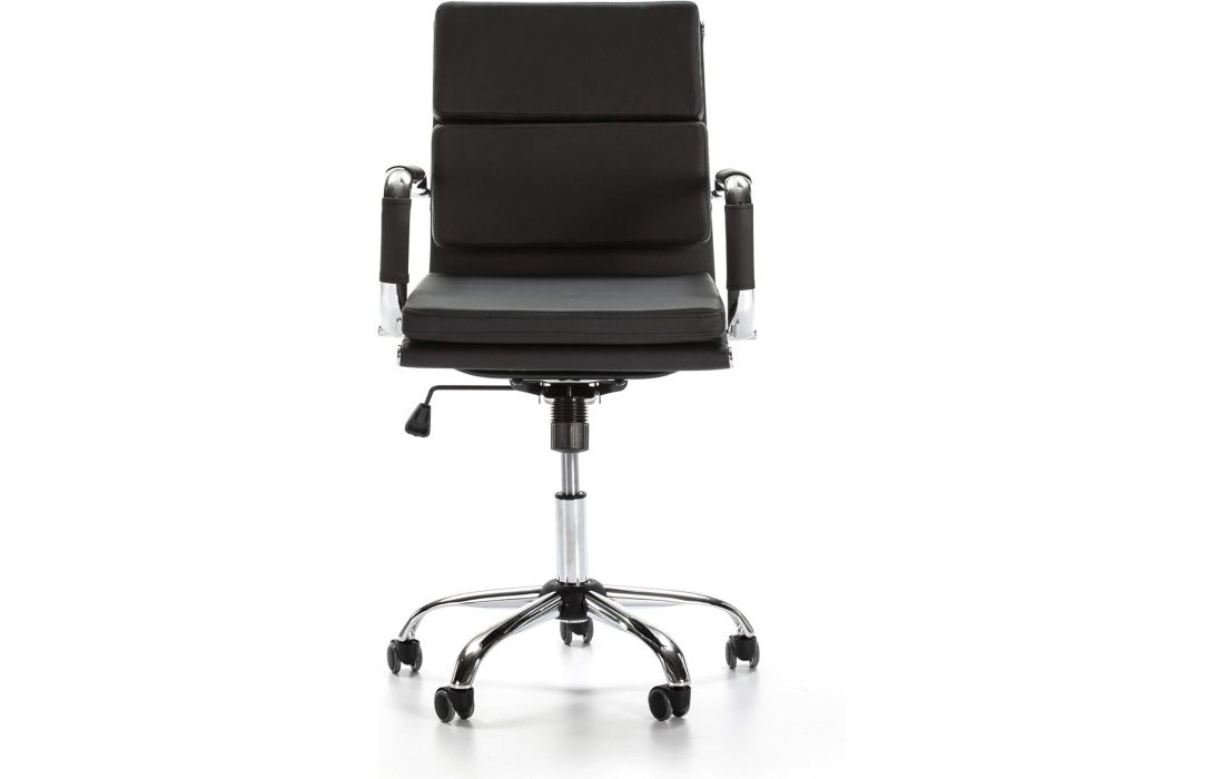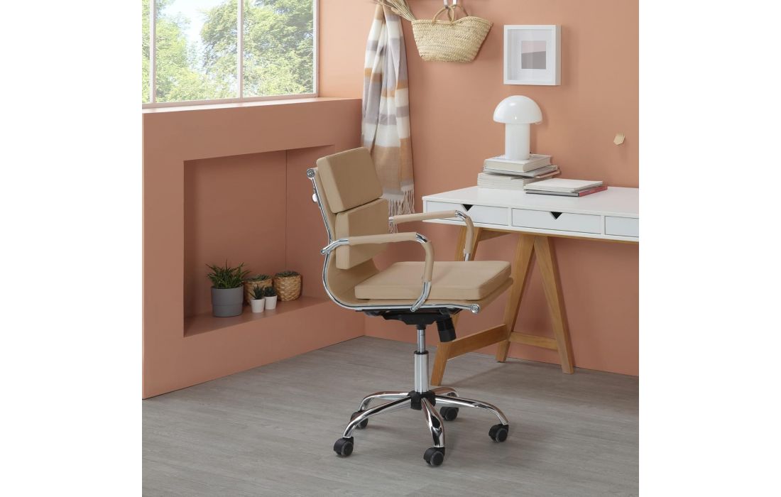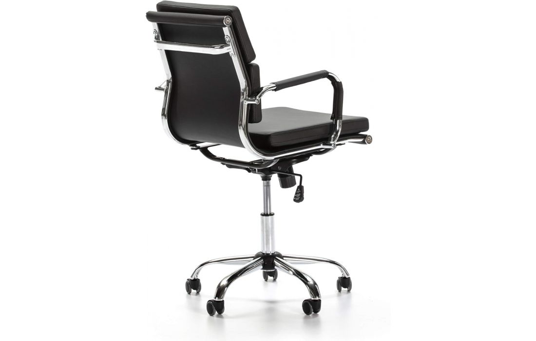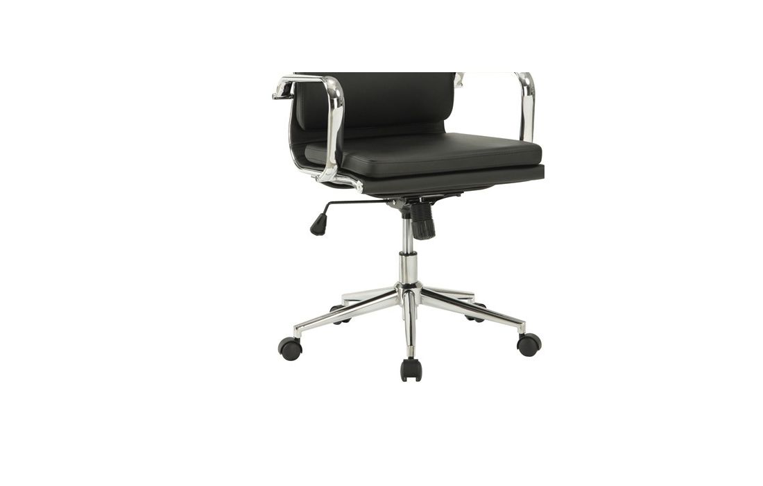 Cadeira giratória de elevação a gás com inclinação e bloqueio, estrutura de metal e estofo em pele sintética nas cores preta e branca.