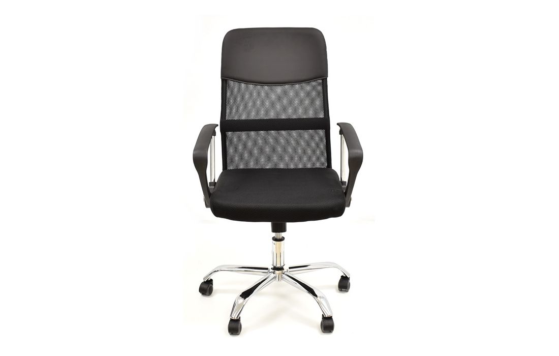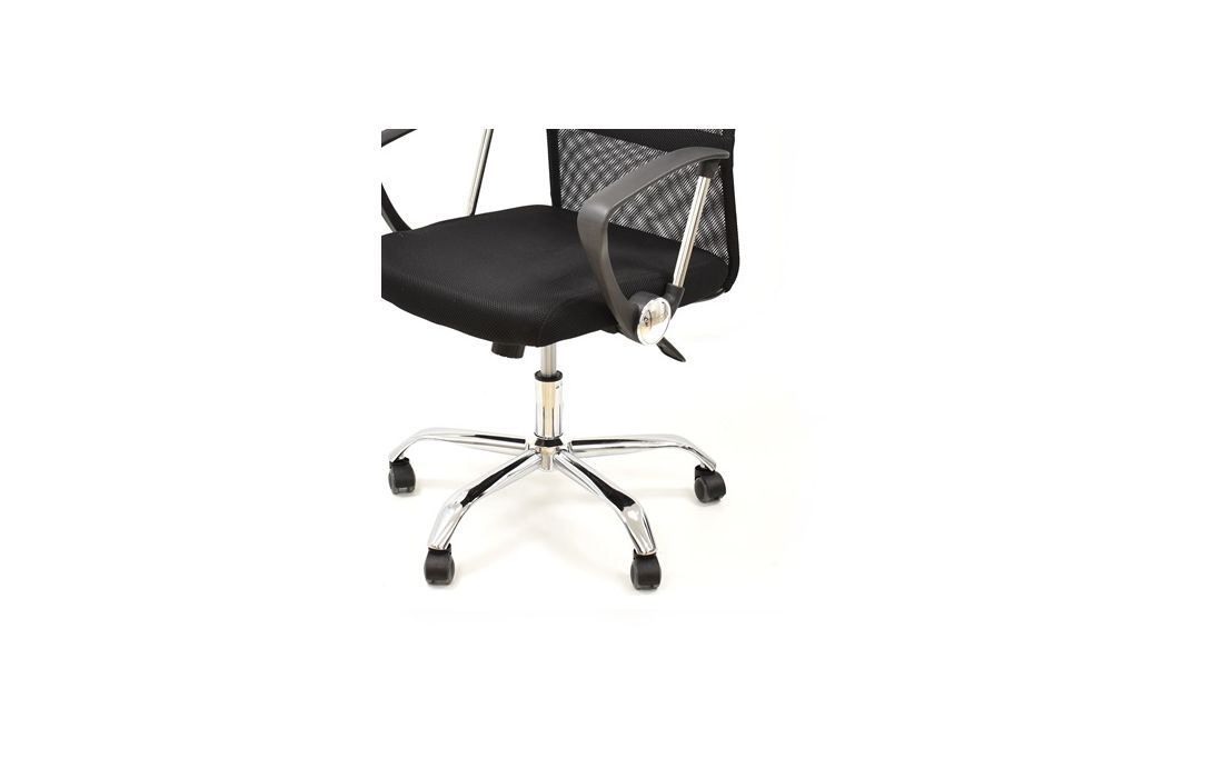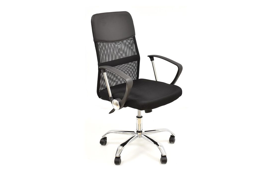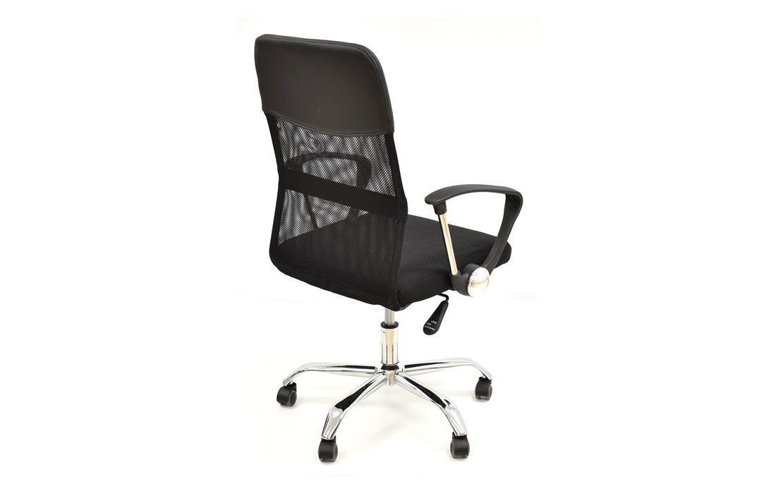 Cadeira giratória de elevação a gás com inclinação e bloqueio, base de metal cromado e estofo com rede e tecido de cor preta.