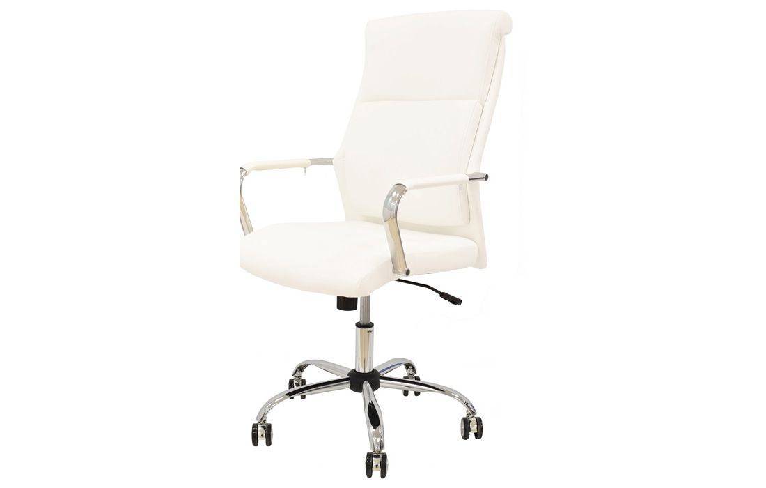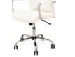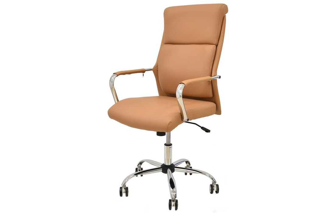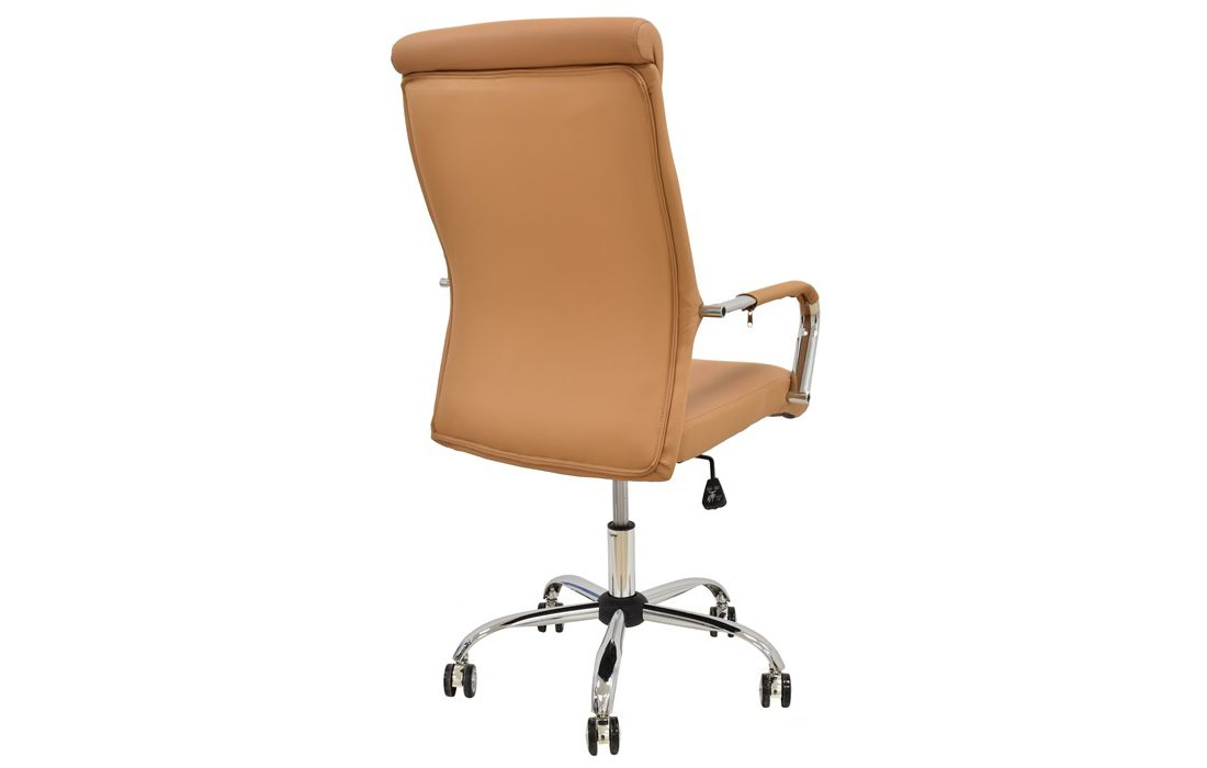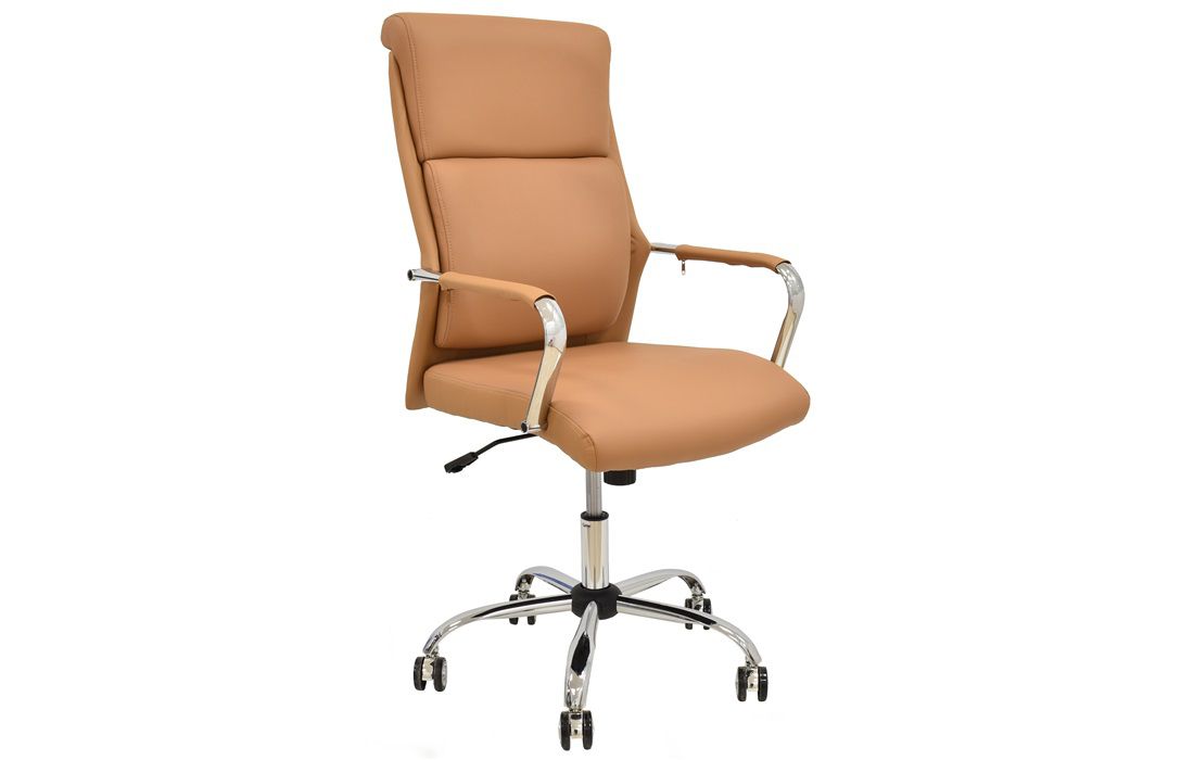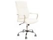 Cadeira giratória de elevação a gás com inclinação e bloqueio, base de metal cromado e estofo em pele sintética nas cores camel, preta e branca.