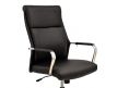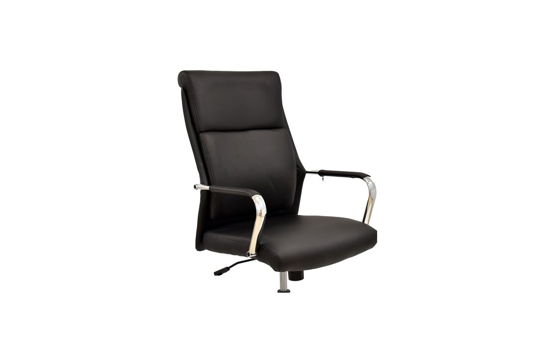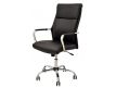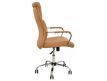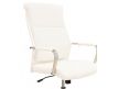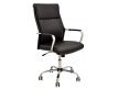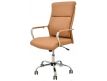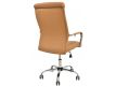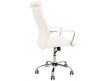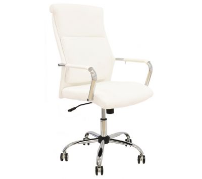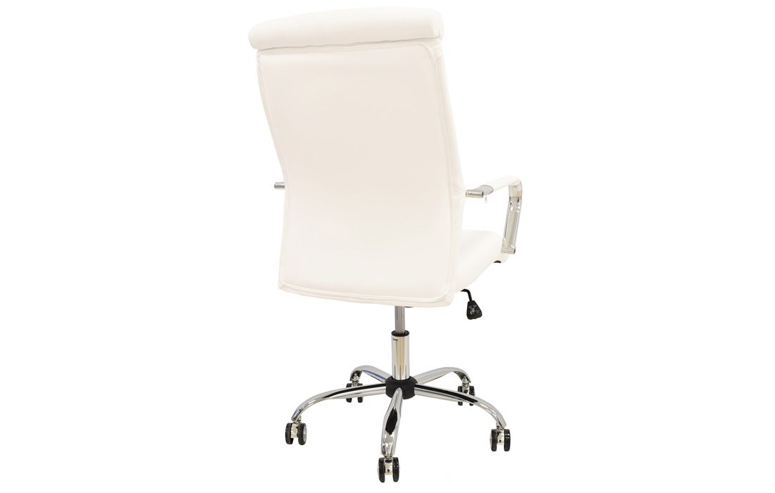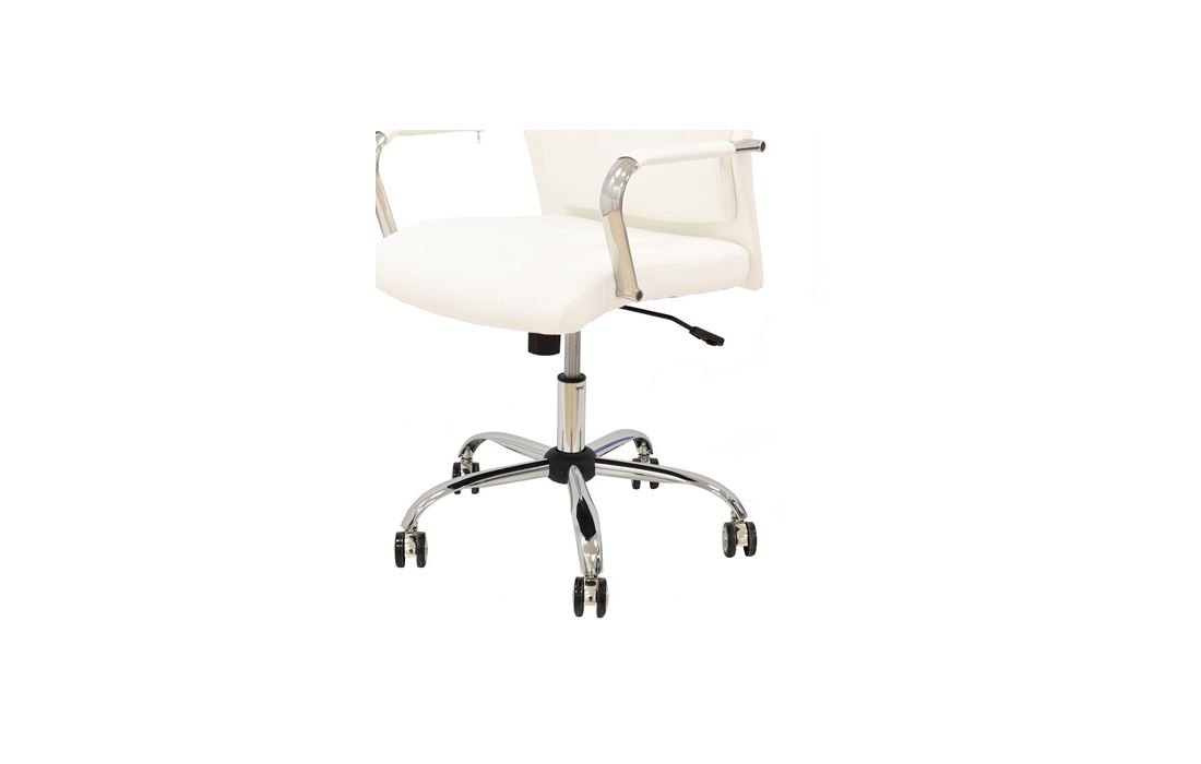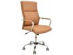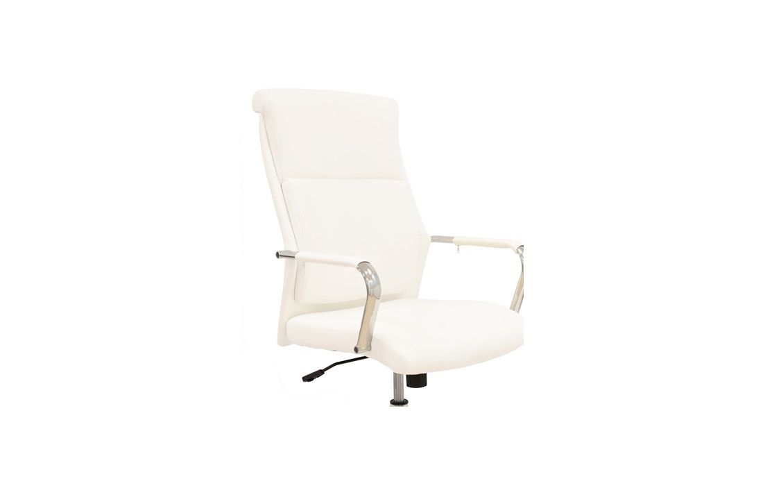 Cadeira giratória de elevação a gás com inclinação e bloqueio, base de metal cromado e estofo em pele sintética nas cores camel, preta e branca.