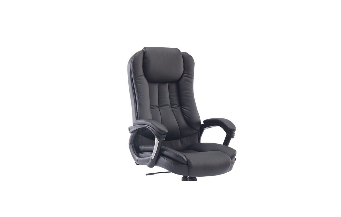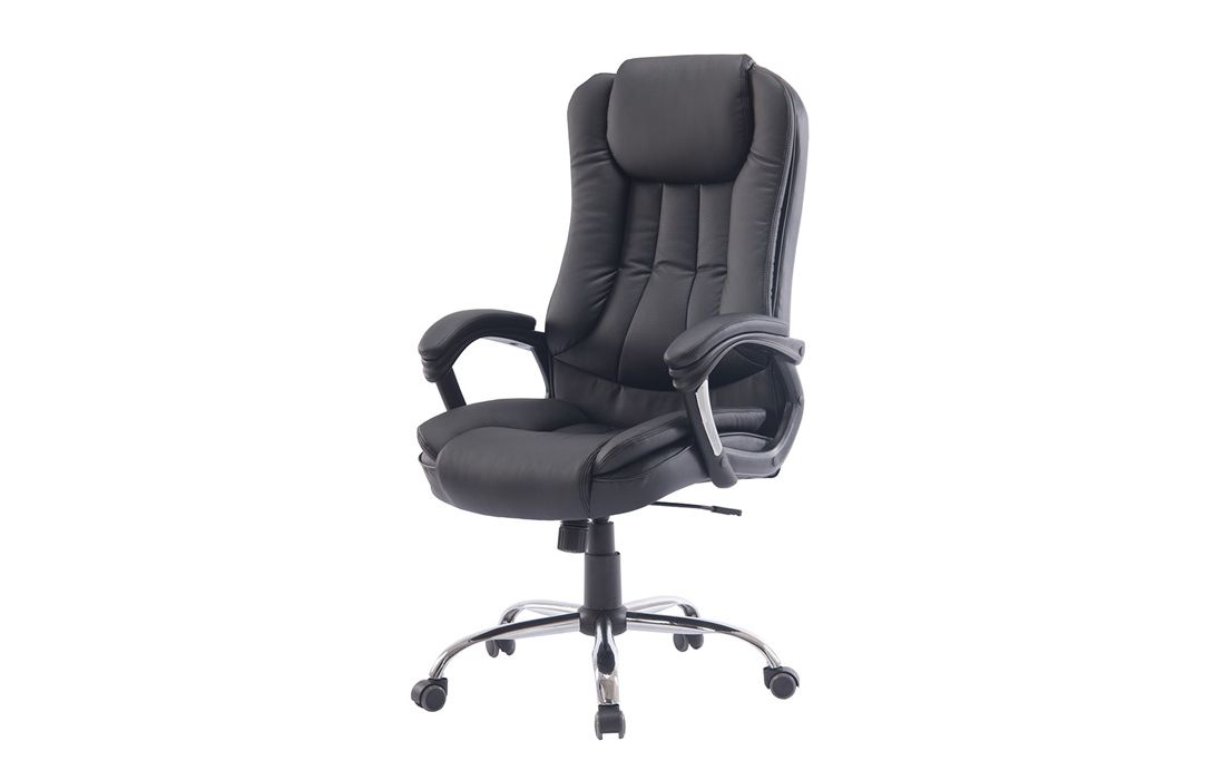 Cadeira giratória de elevação a gás com inclinação e bloqueio, base de metal cromado e estofo em pele sintética de cor preta.