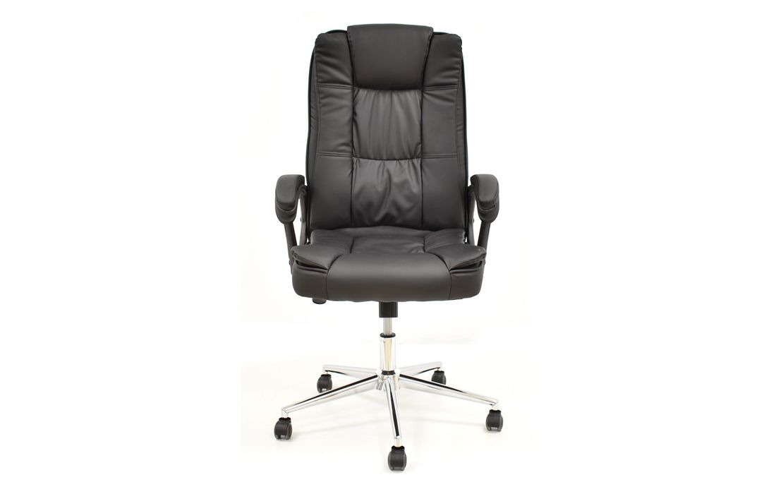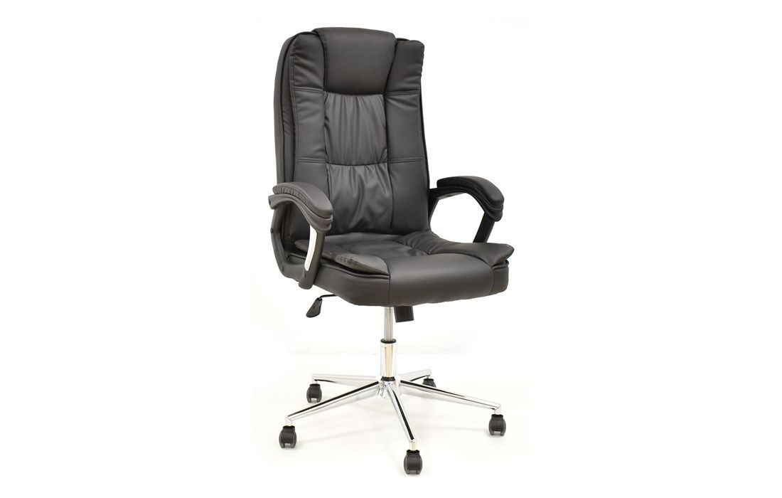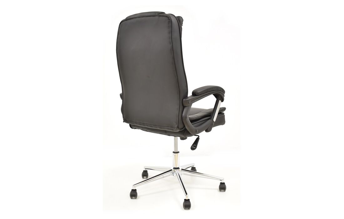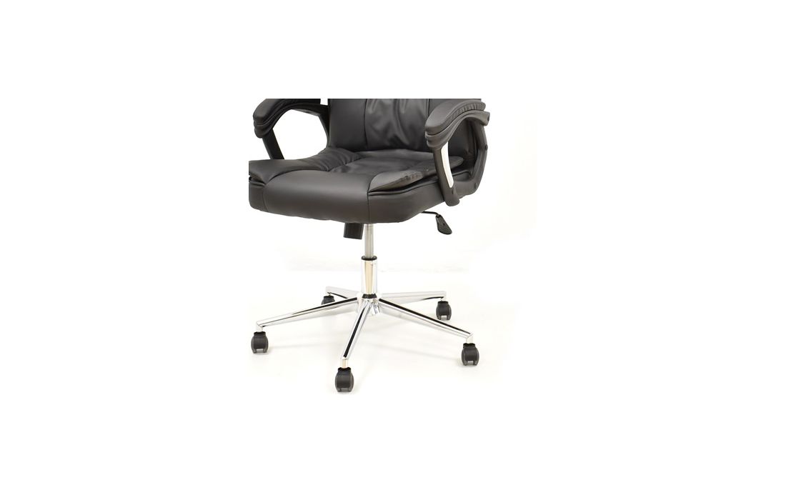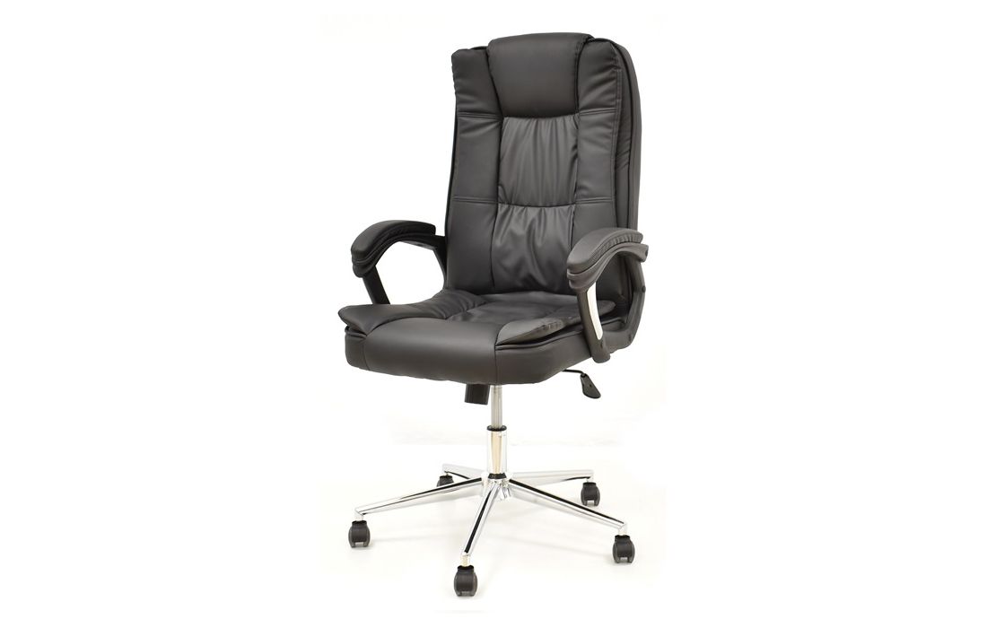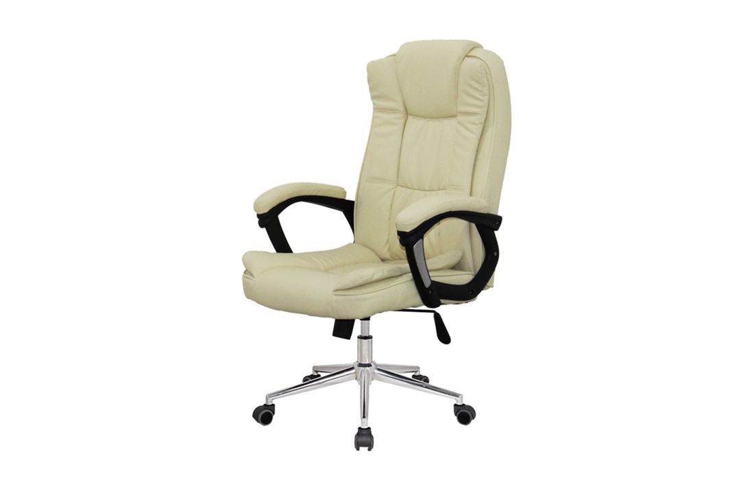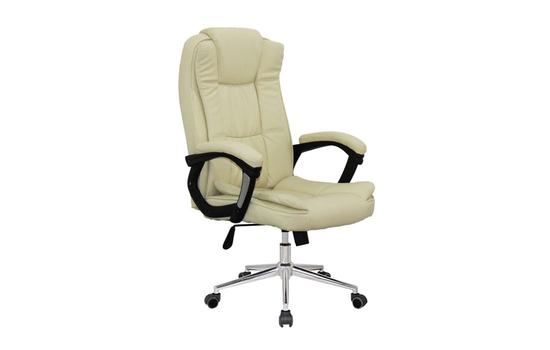 Cadeira giratória de elevação a gás com inclinação e bloqueio com base de metal cromado e estofo em pele sintética nas cores preta e beje.