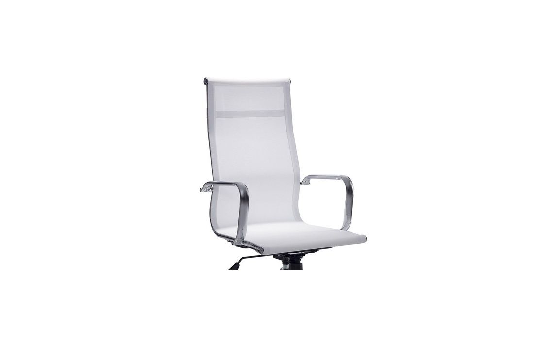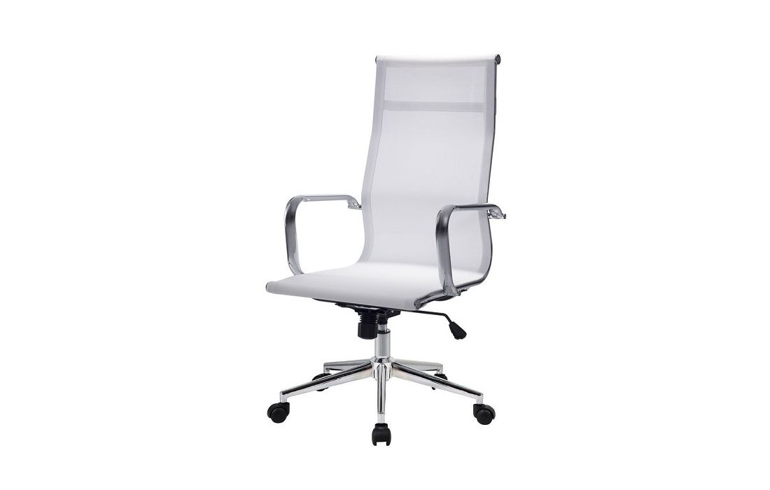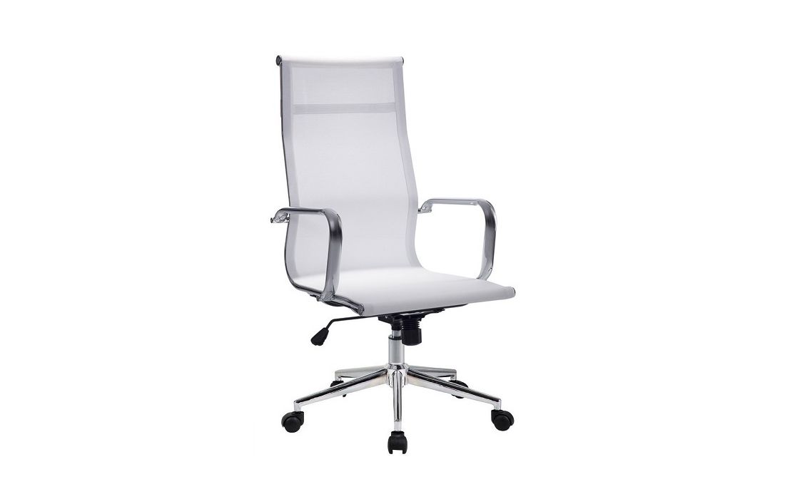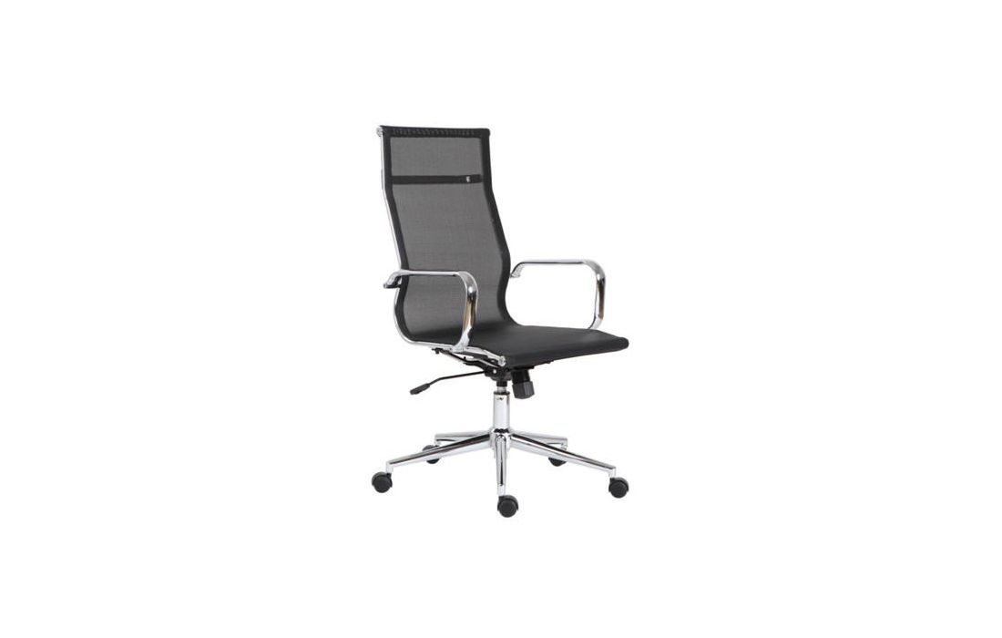 Cadeira giratória de elevação a gás com inclinação e bloqueio com base em metal e estofo com rede nas cores preta e branca.