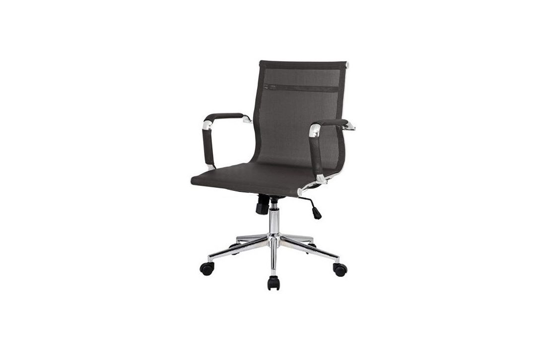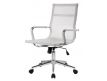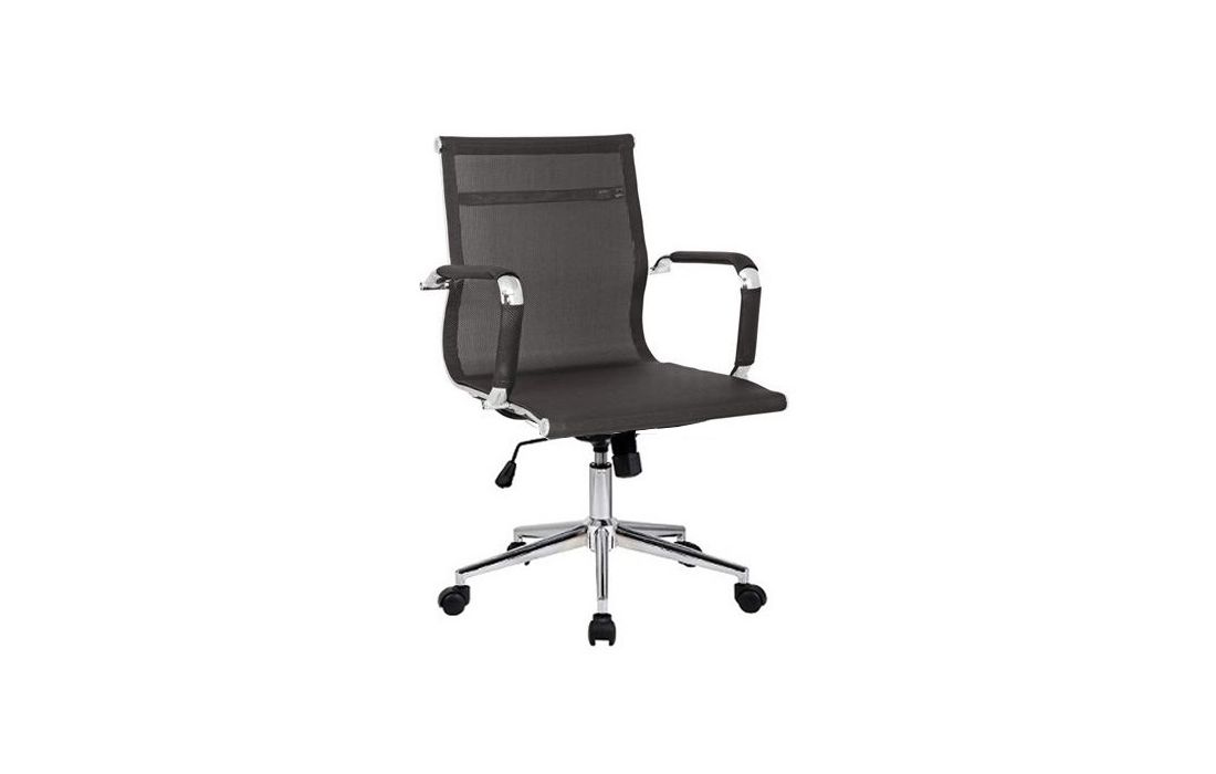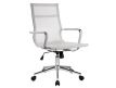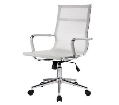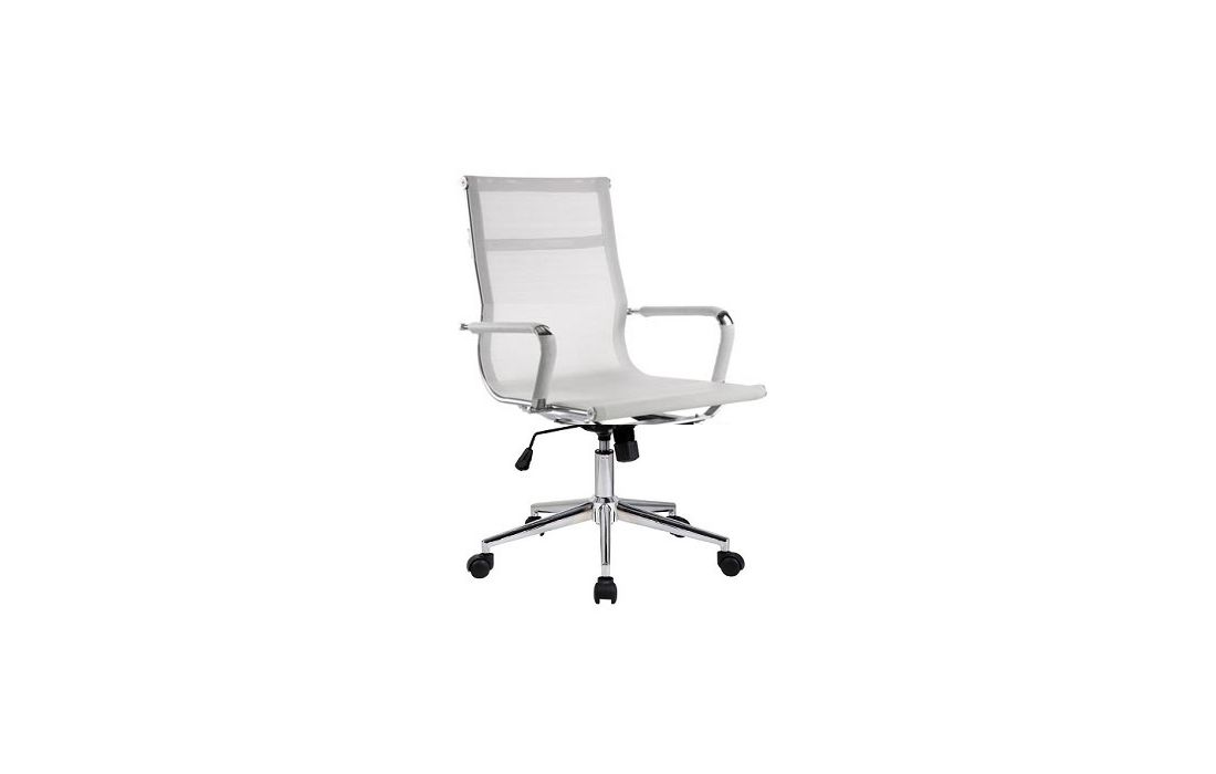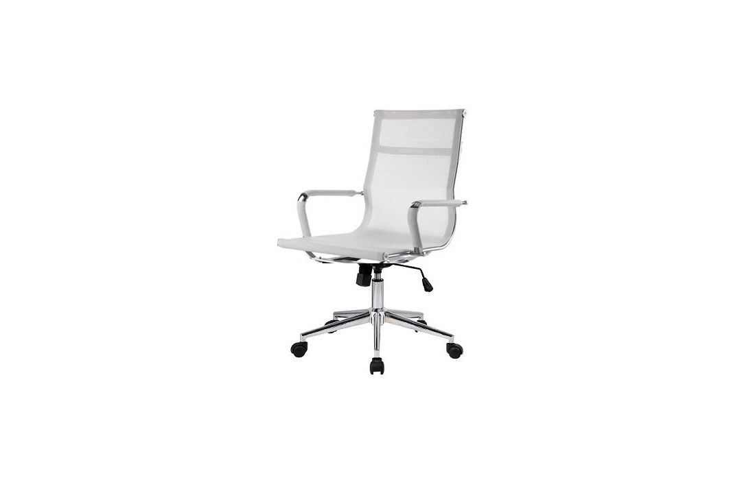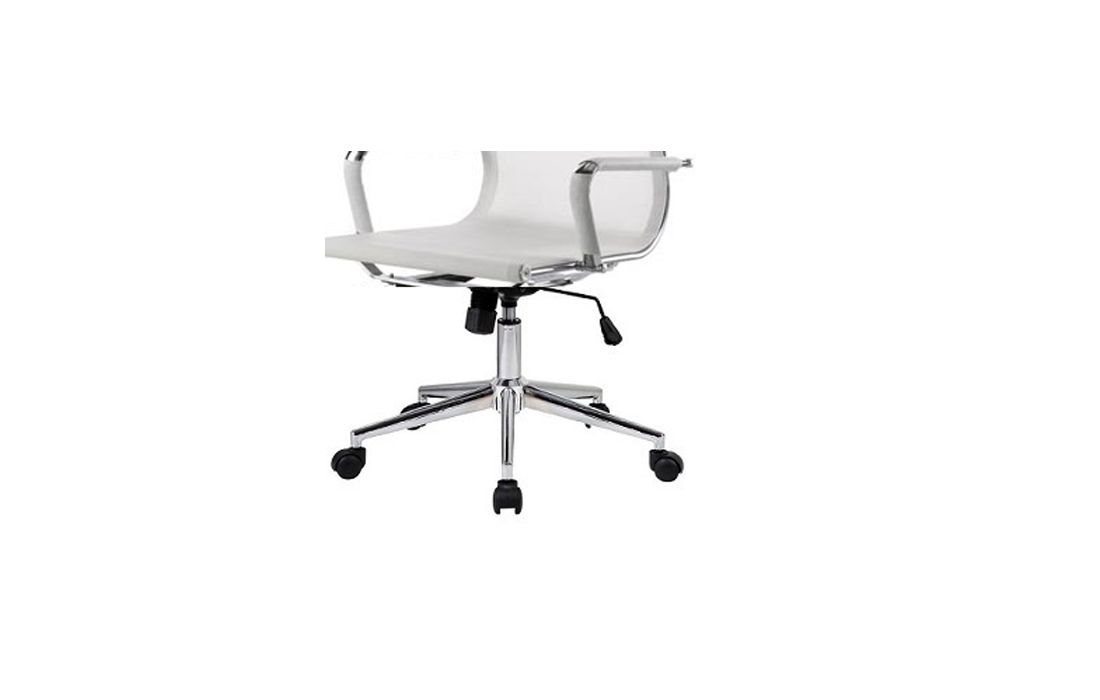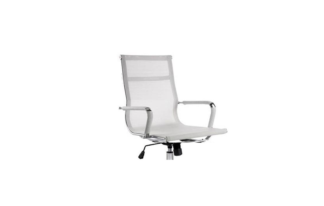 Cadeira giratória de elevação a gás com inclinação e bloqueio com base em metal e estofo com rede nas cores preta e branca.