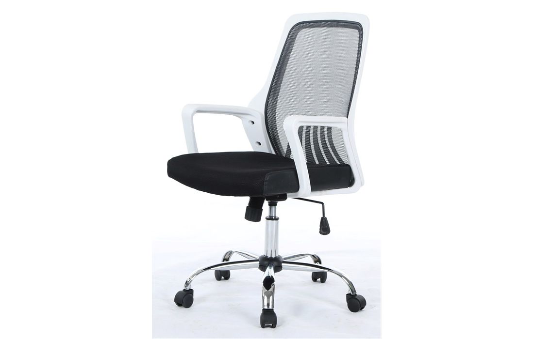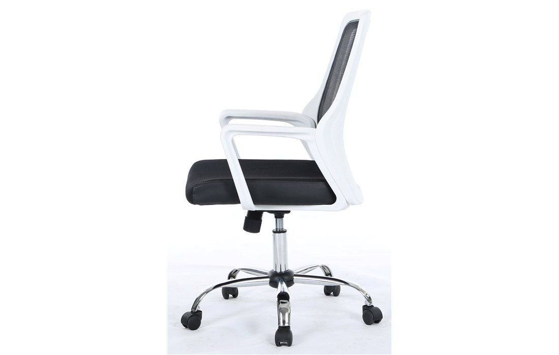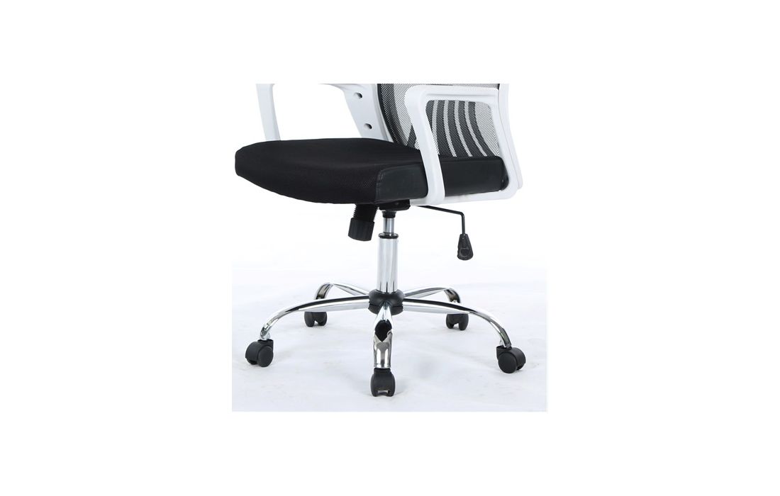 Cadeira giratória de elevação a gás com inclinação e bloqueio com base em metal e estofo com rede e tecido preto.