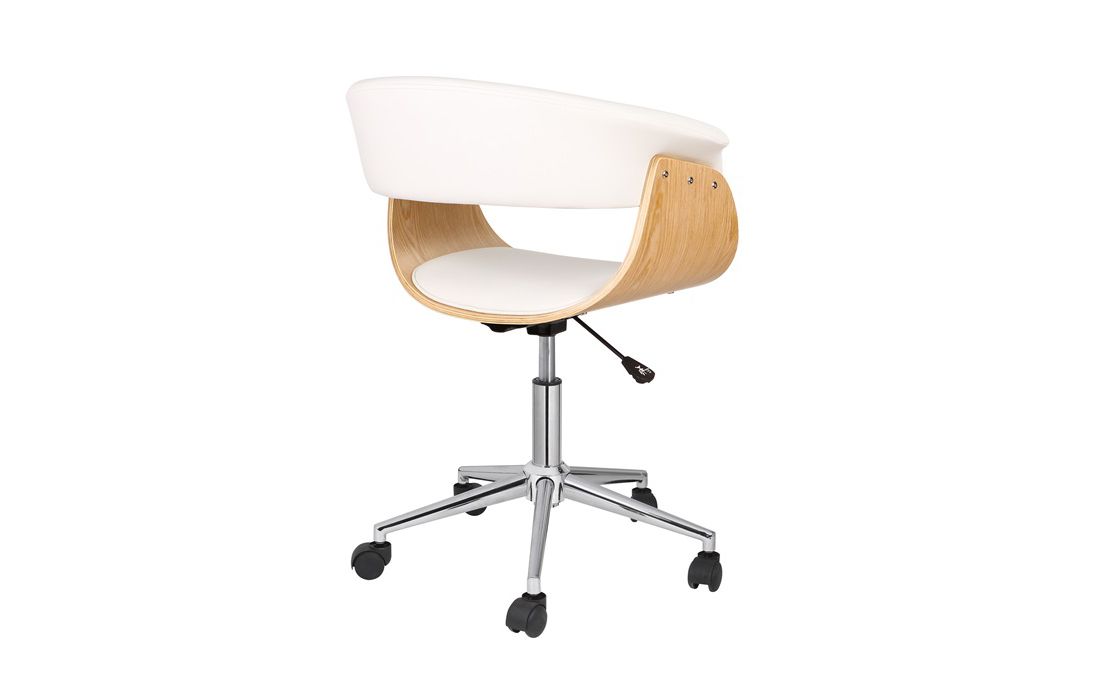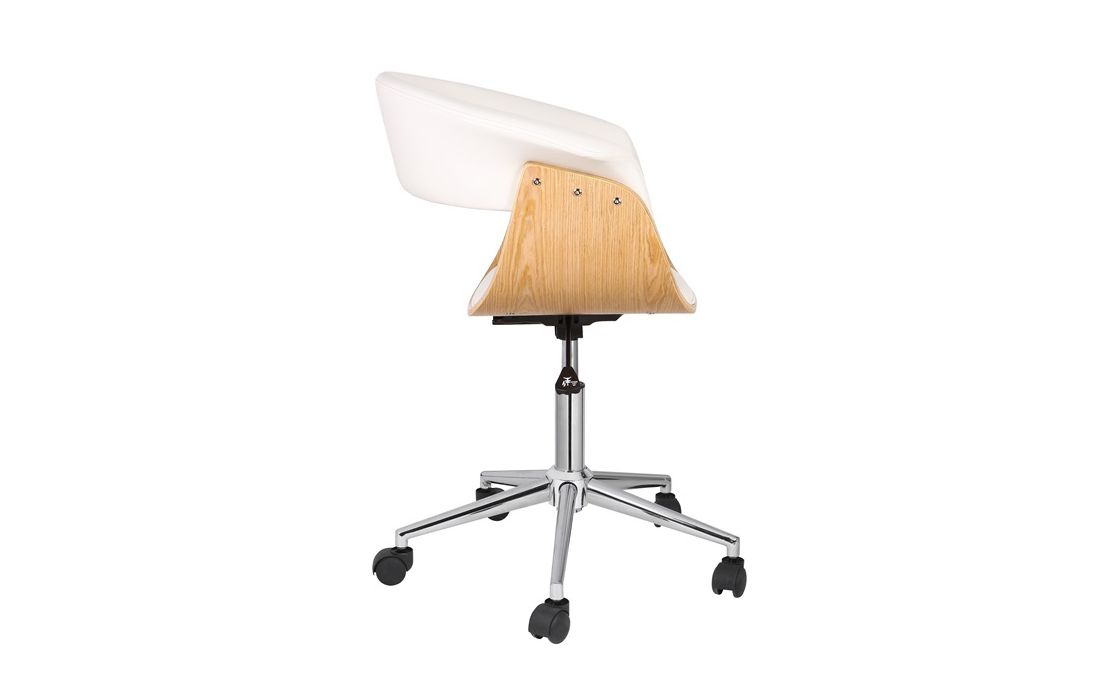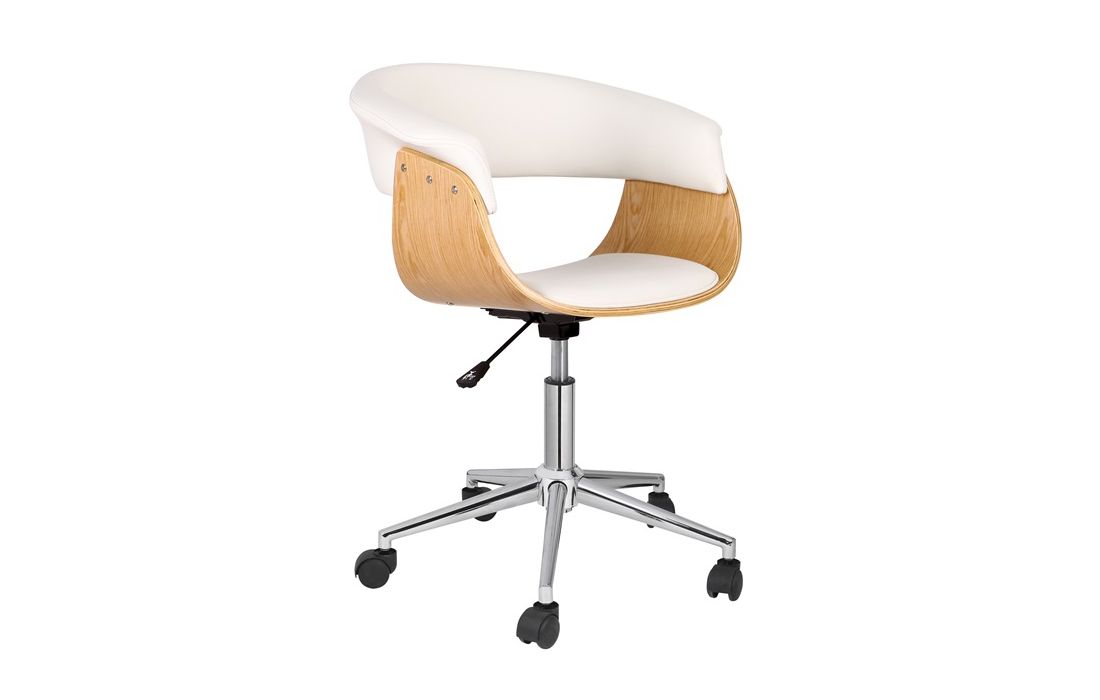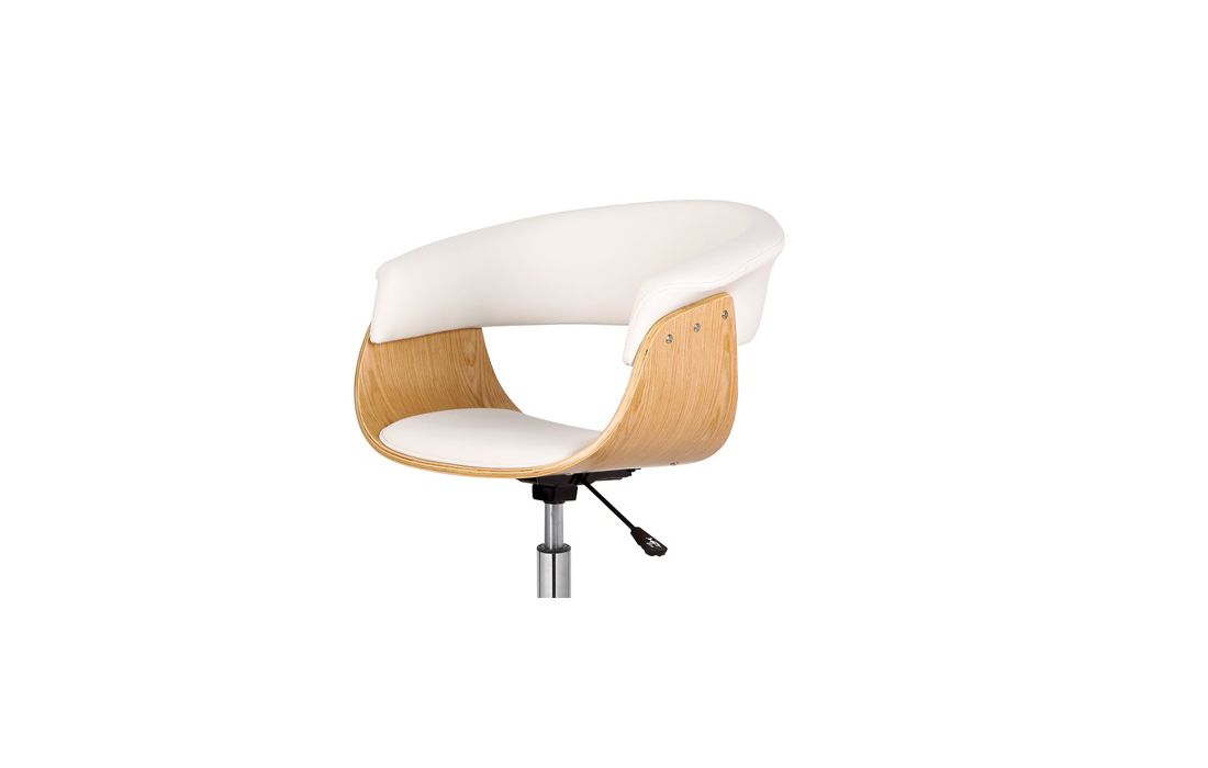 Cadeira giratória de elevação a gás, base em metal, assento em contaplacado chapeado em madeira de freixo e estofado em pele sintética cor branca.