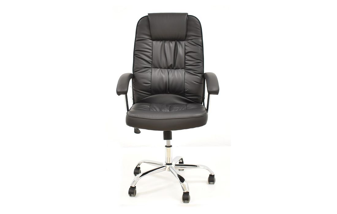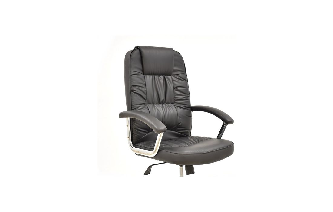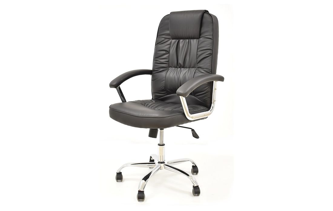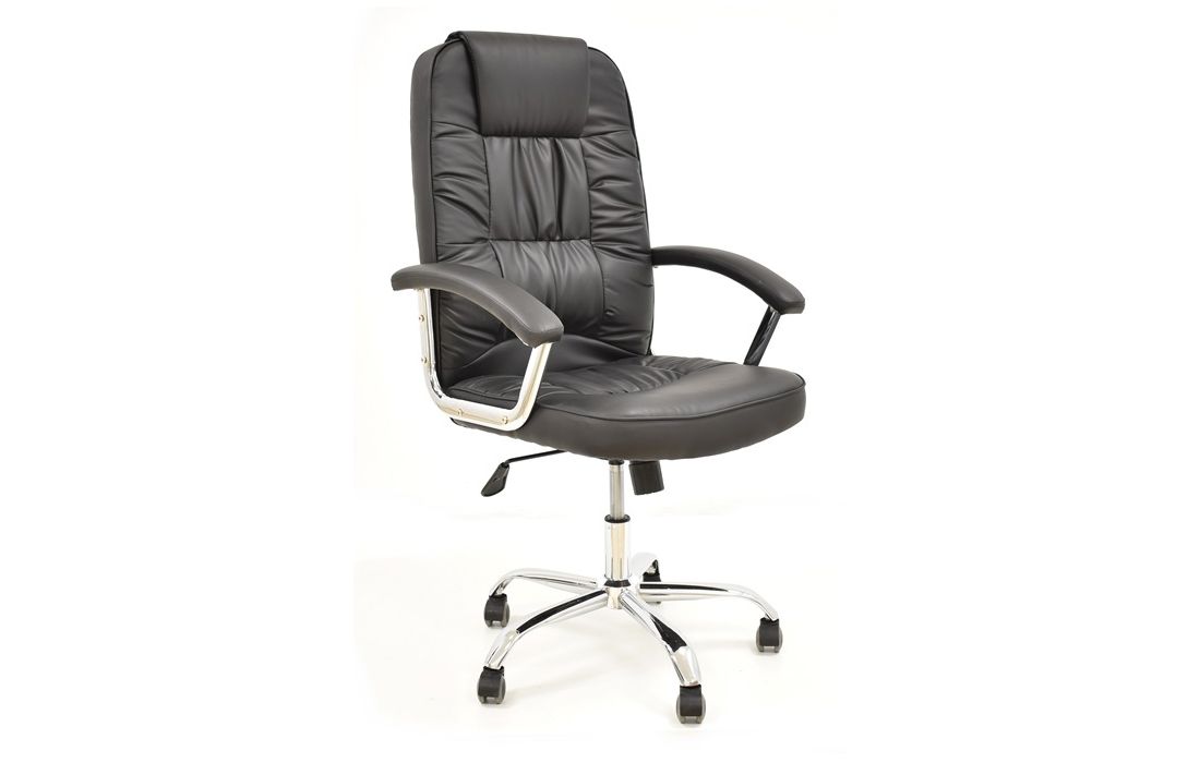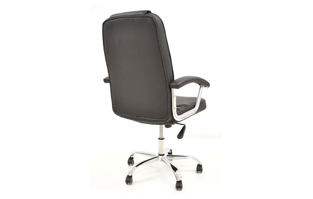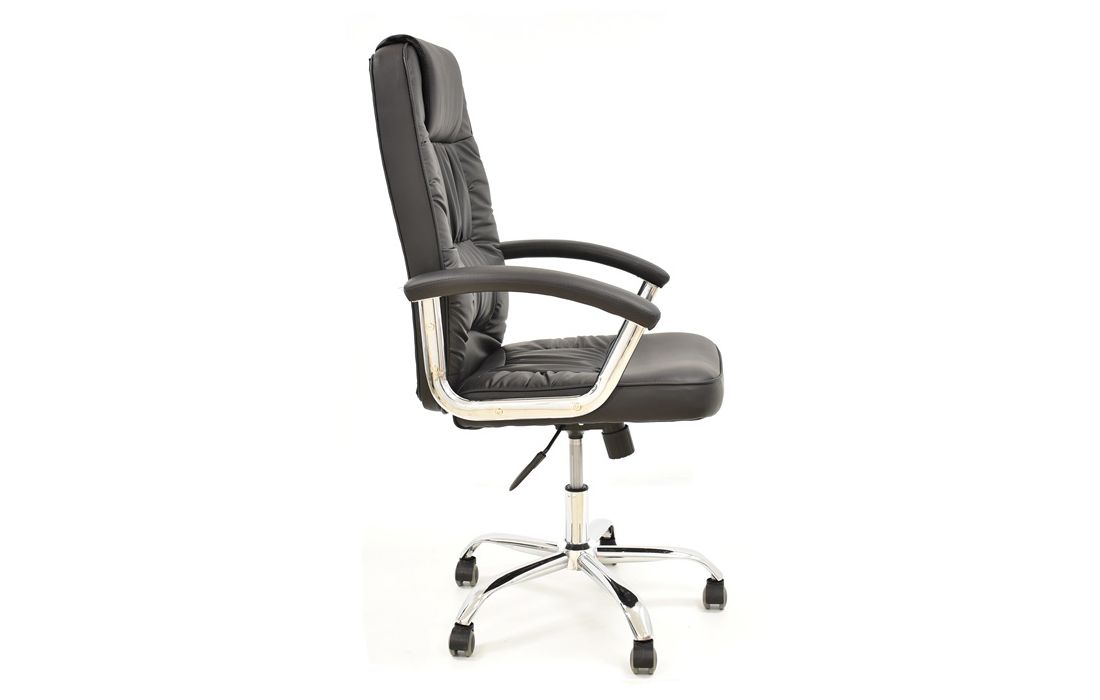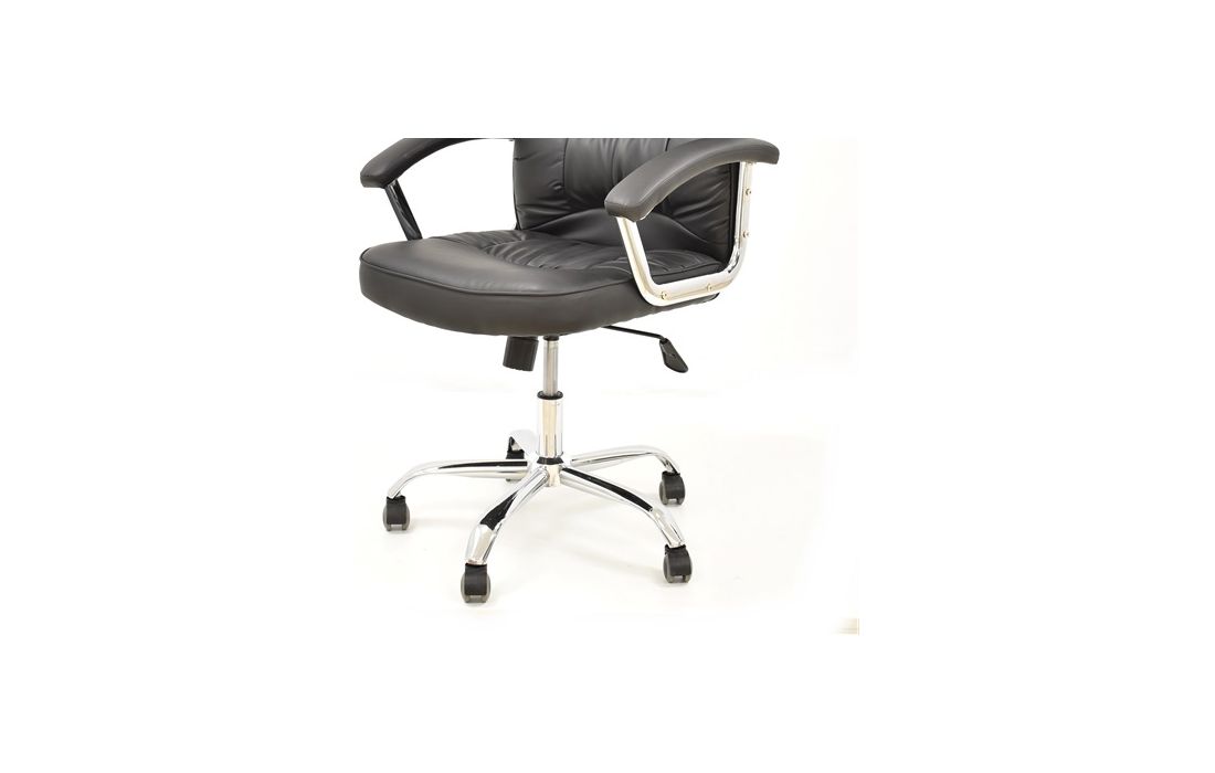 Cadeira giratória de elevação a gás com inclinação e bloqueio, base em metal cromado e estofo pele sintética cor preta.
