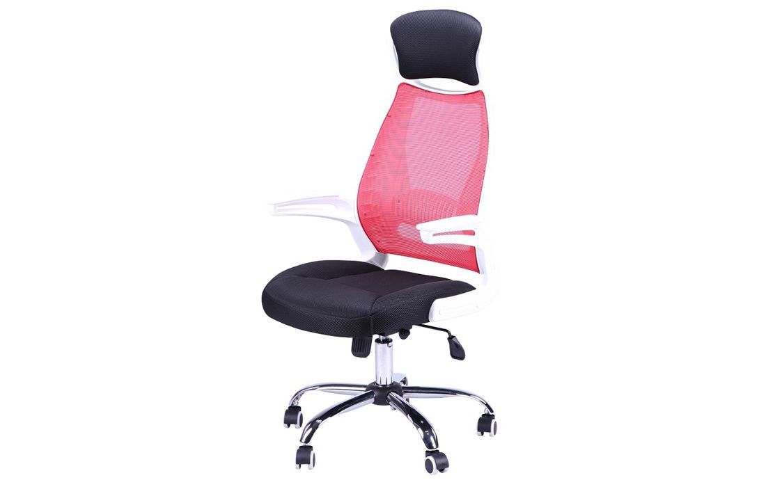 Cadeira giratória de elevação a gás com inclinação e bloqueio, base em metal cromado e estofo com rede vermelha e tecido preto.