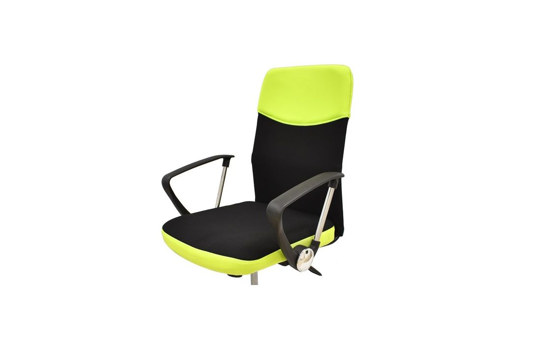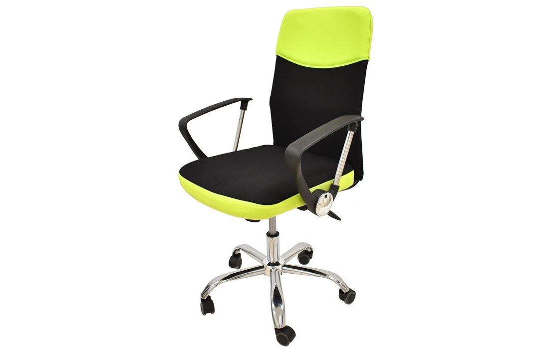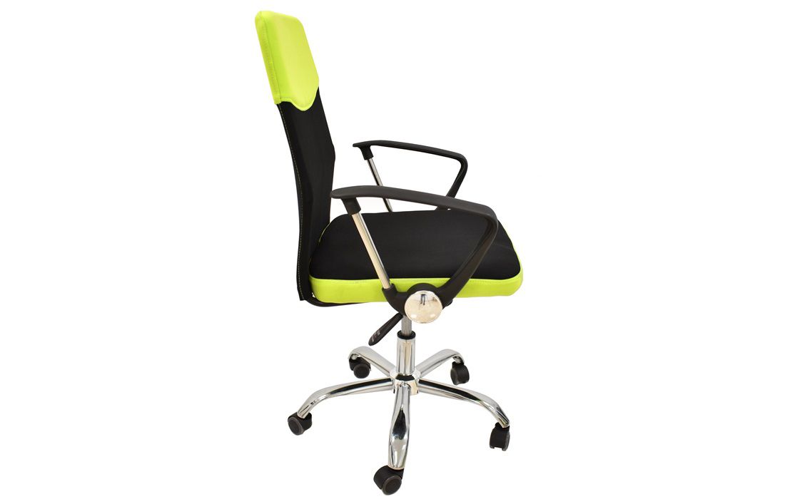 Cadeira giratória de elevação a gás com inclinação e bloqueio, base em metal cromado e estofado em tecido preto e verde.