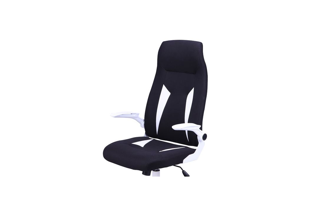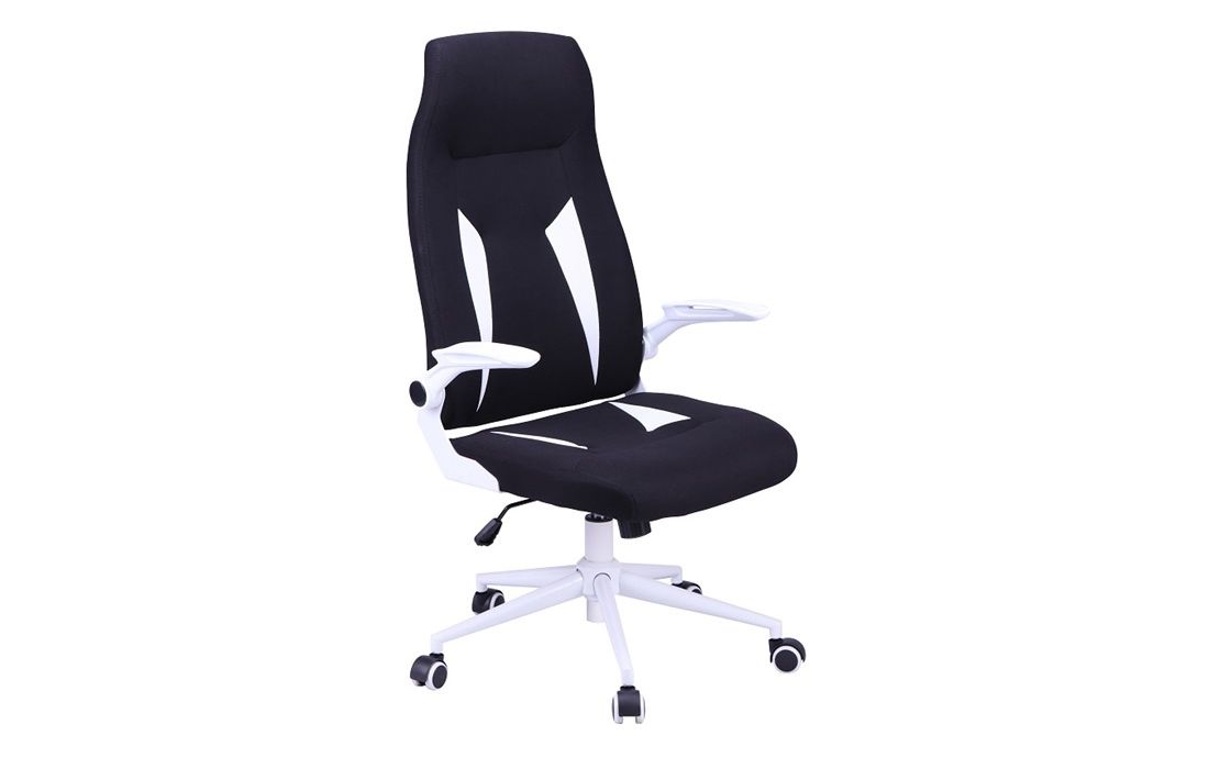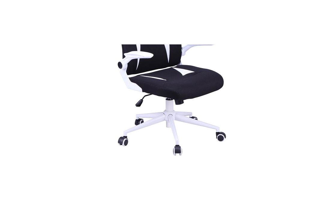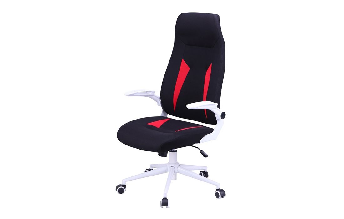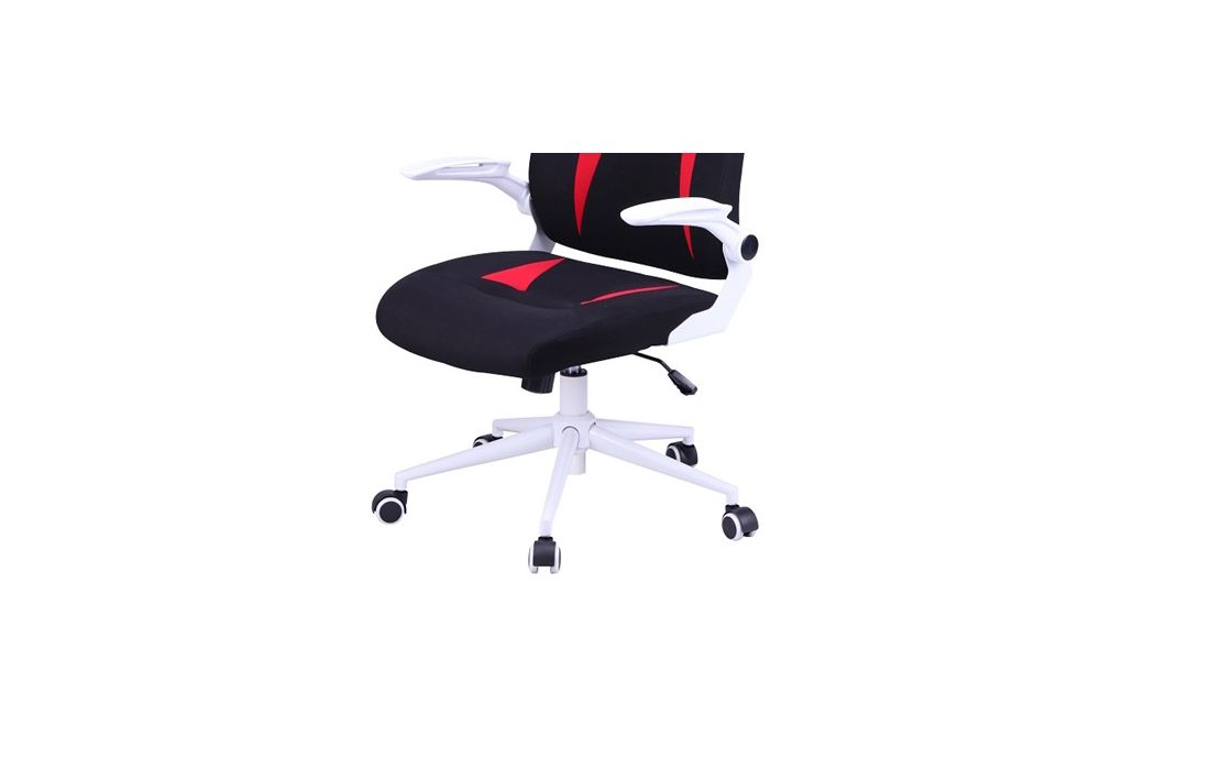 Cadeira giratória de elevação a gás com inclinação e bloqueio com braços dobráveis, base de metal acabamento cor branca e estofado em pele sintética nas cores preto/branco e preto/vermelho.
