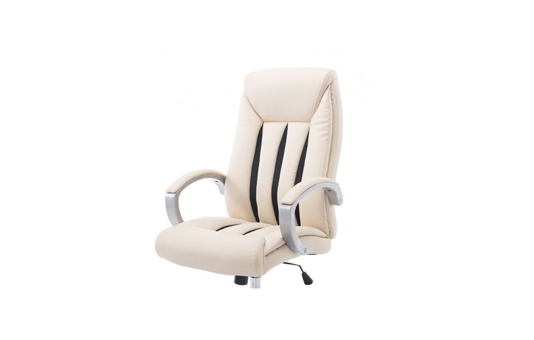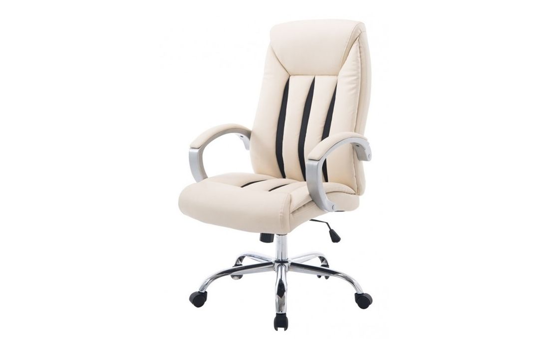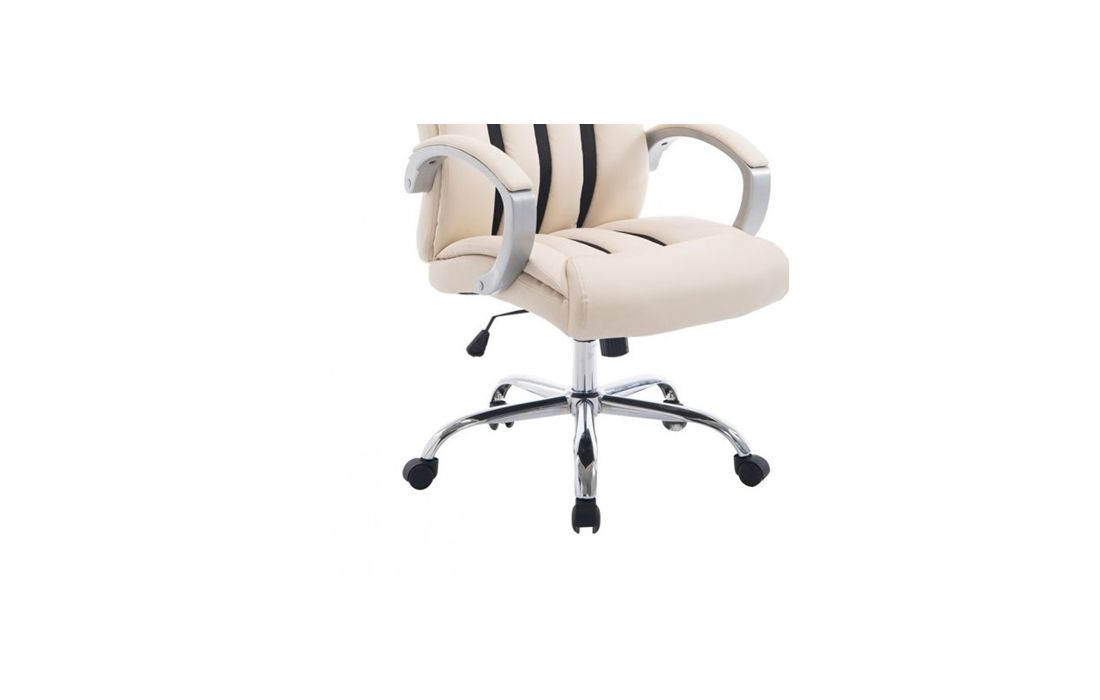 Cadeira giratória de elevação a gás com inclinação e bloqueio, base de metal cromado e estofado em pele sintética bege e tecido cor castanha.