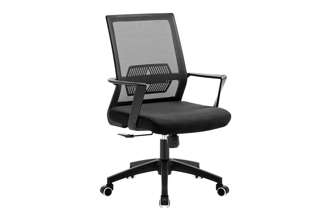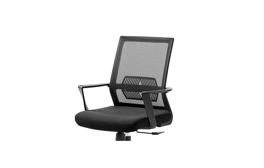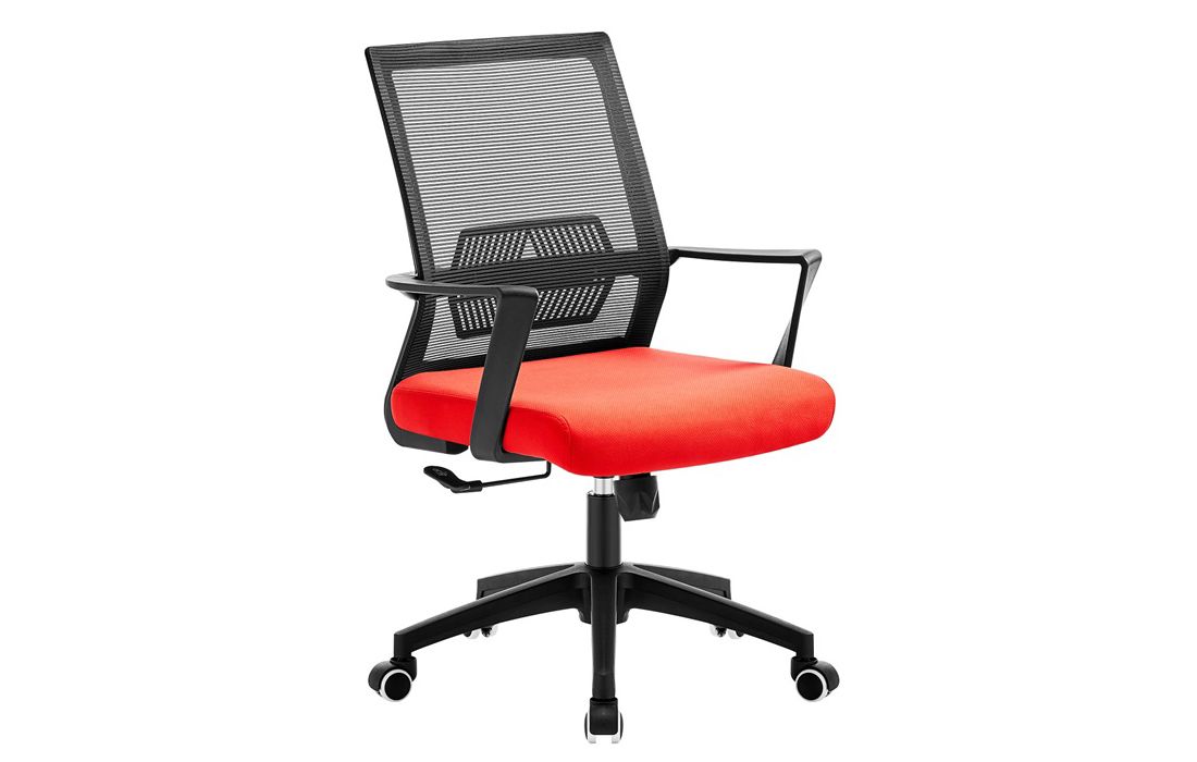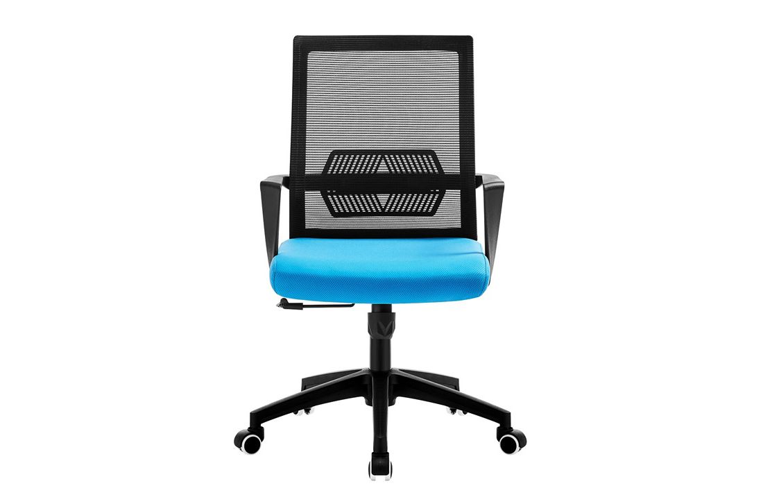 Cadeira giratória de elevação a gás com inclinação e bloqueio, base de metal e com estofo em rede preta e tecido nas cores azul, preto e vermelho.